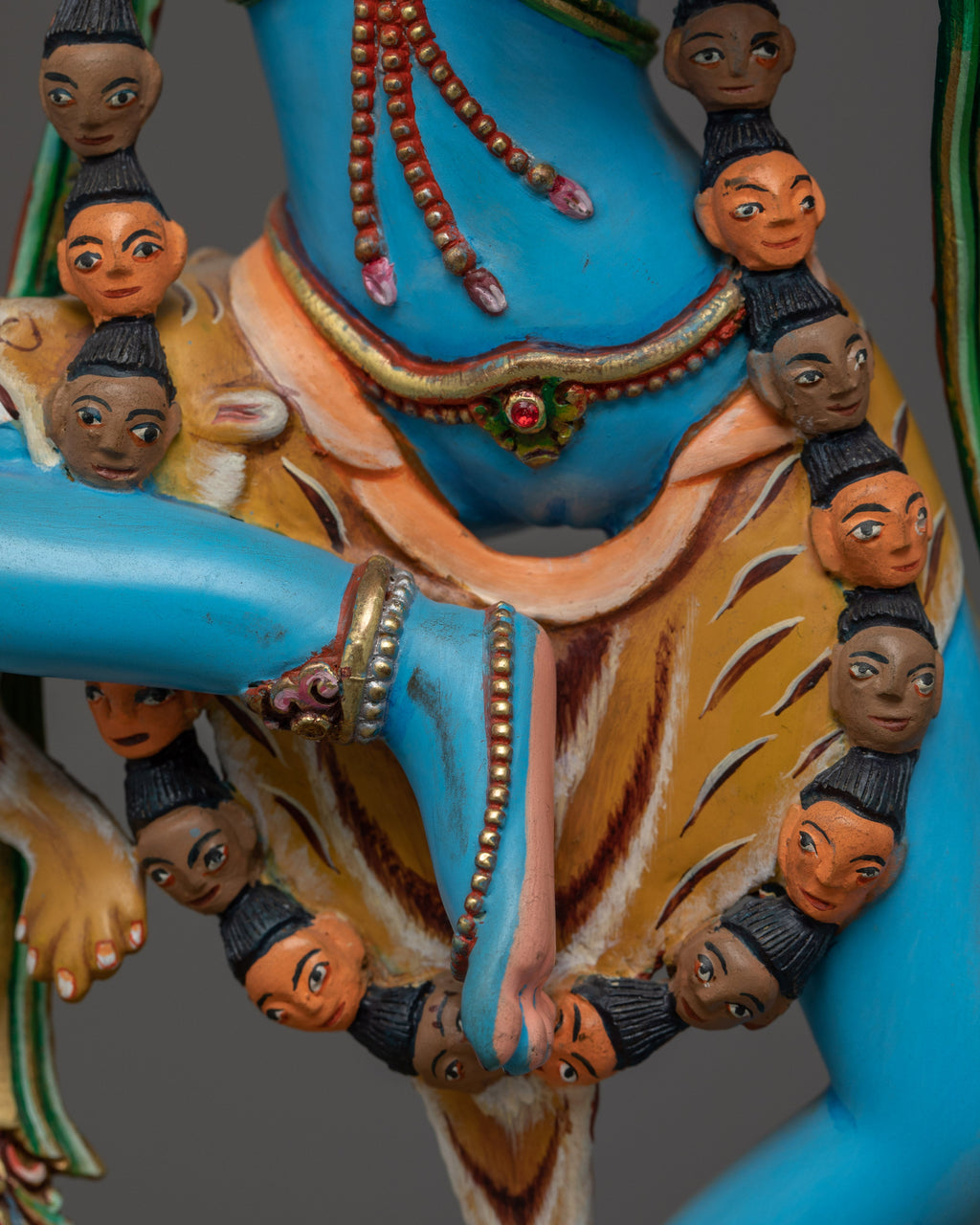 The sculpture depicts Simhamukha in a dynamic pose, her lion's face representing the courageous declaration of the truth and the power to protect the Dharma. Her appearance, which is frequently represented with a flaying knife and a skull cup, indicates the transformation of negative energy into knowledge and compassion. This statue not only serves as an object of veneration but also as a reminder of the strength that comes from confronting and transforming our inner fears and challenges.