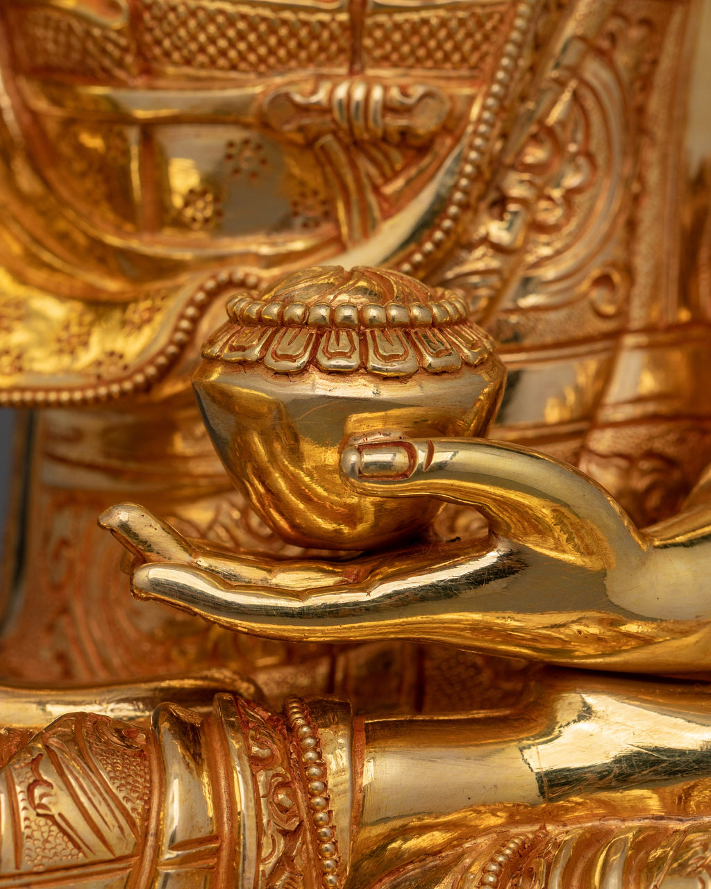 The Shakyamuni Buddha for Buddhist Altar is a sculpture of spiritual creativity and dedication. Handcrafted in Patan, Nepal, a center of fine Buddhist workmanship, this statue is meticulously crafted from a copper body, gilded in 24K gold, and embellished with beautiful gold and acrylic paints. Standing 13.2"/33.5cm tall, 9.4"/24cm at the base, and weighing 4.54 kg, this magnificent sculpture exudes tranquillity and is an excellent addition to any sacred altar or meditation space.