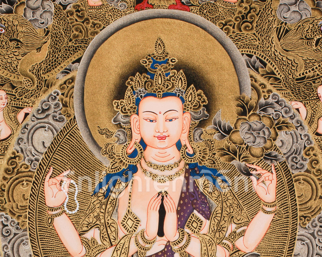 At the pinnacle of this sacred image are the honored Four Buddhas: Vairocana, Amitabha, Shakyamuni, and Amoghasiddhi, whose divine essence enhances the energy of the artwork. Below Avalokiteshvara, White Dzambhala, the deity representing wealth and prosperity, serves as a symbol of abundance and spiritual growth, rounding out the harmonious spiritual presence of this remarkable piece.