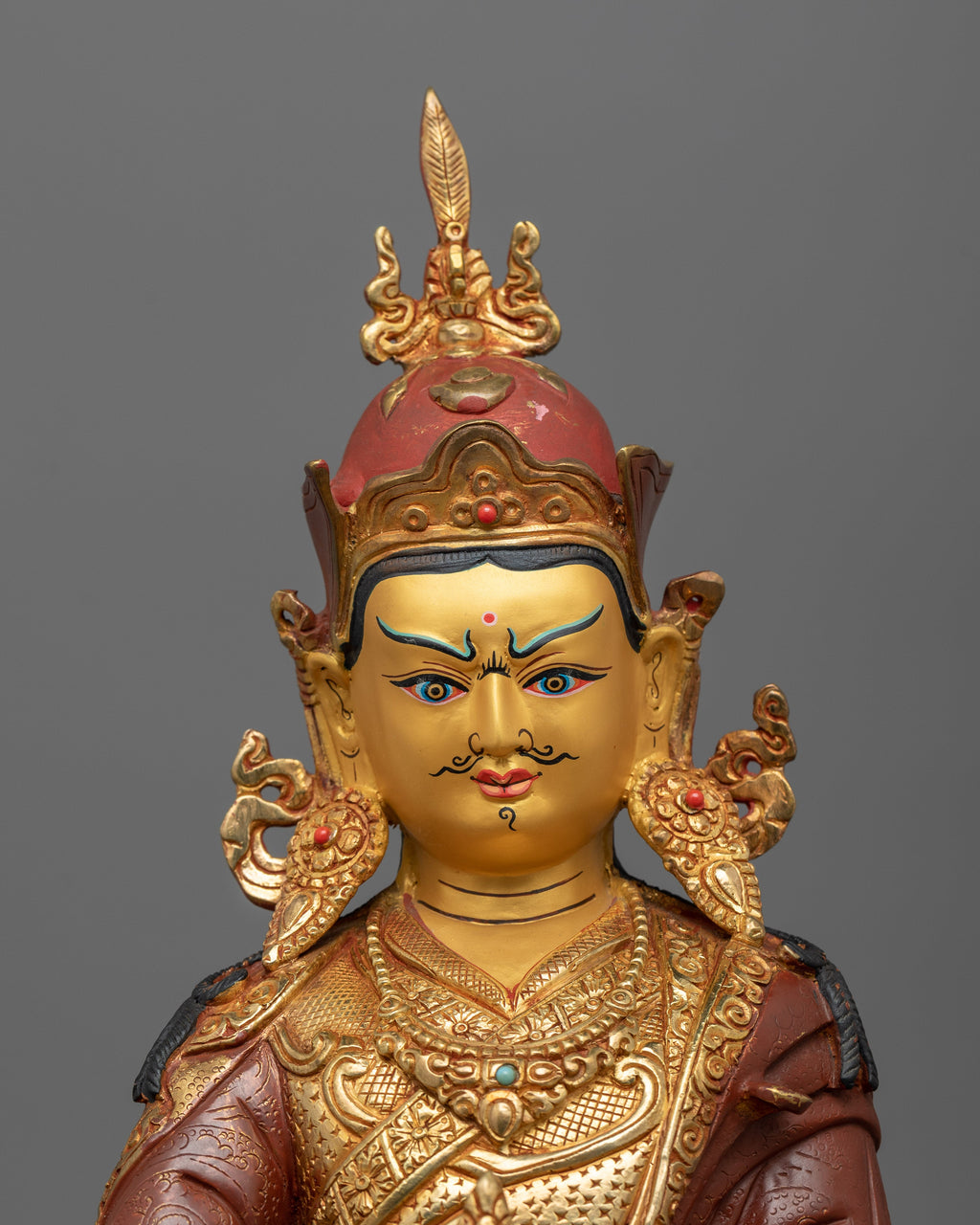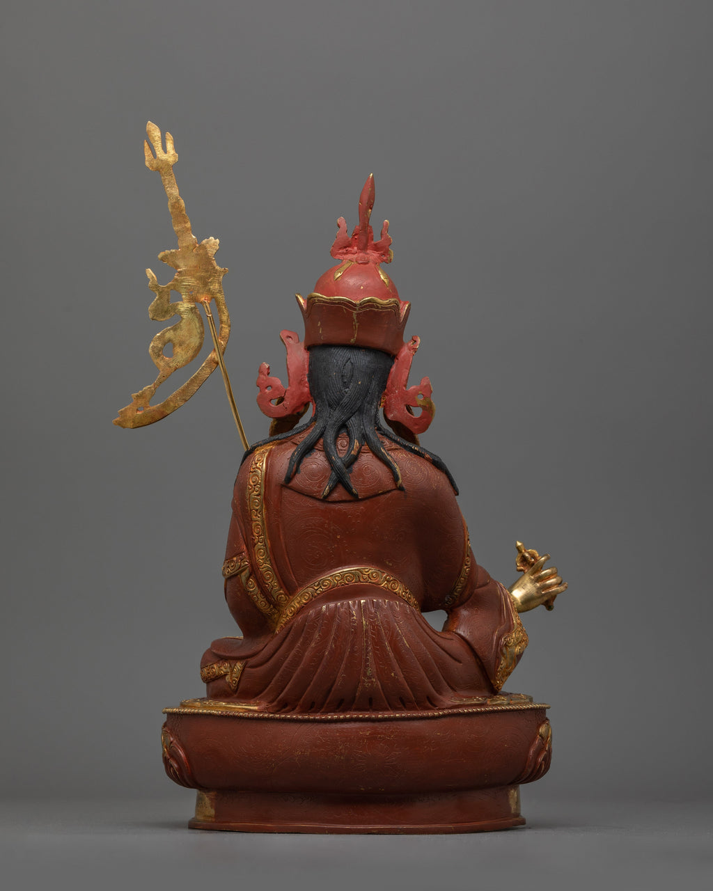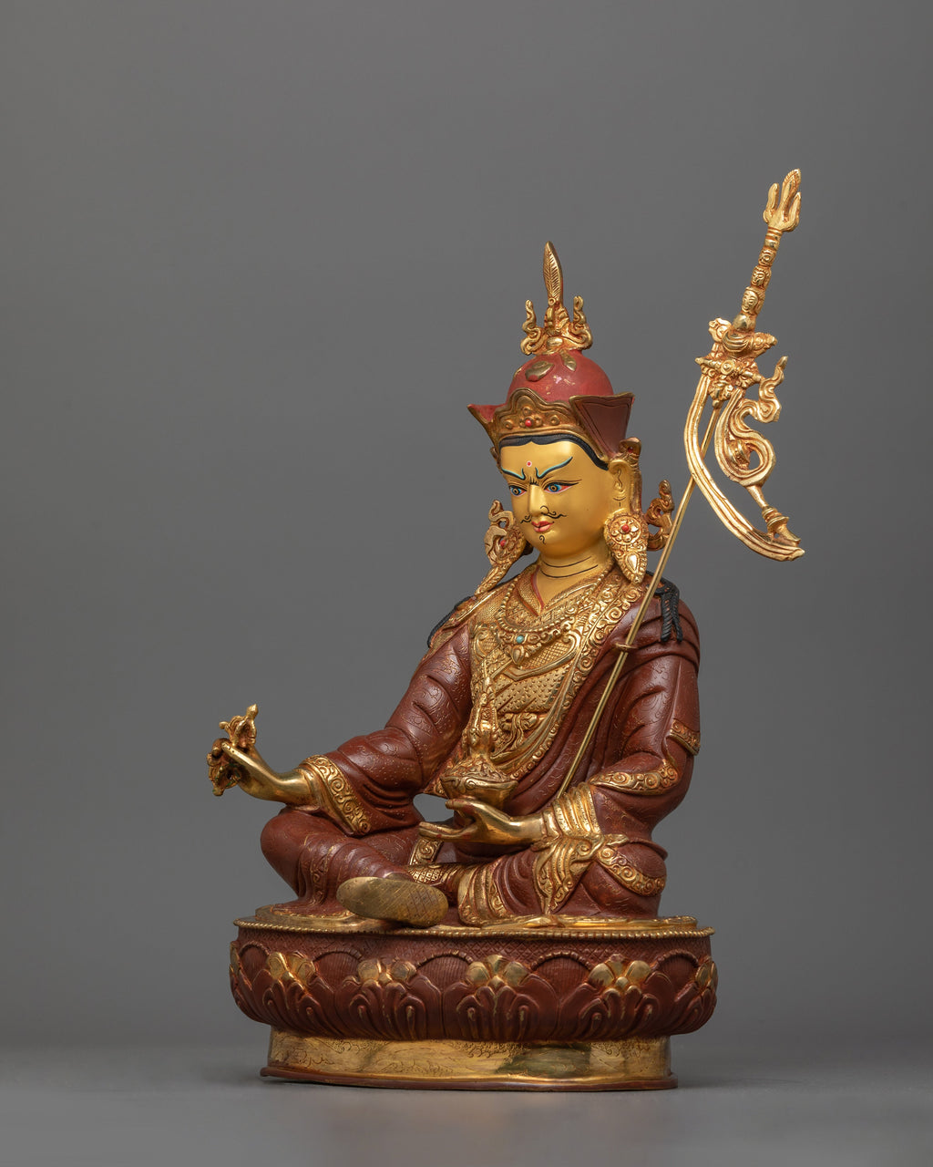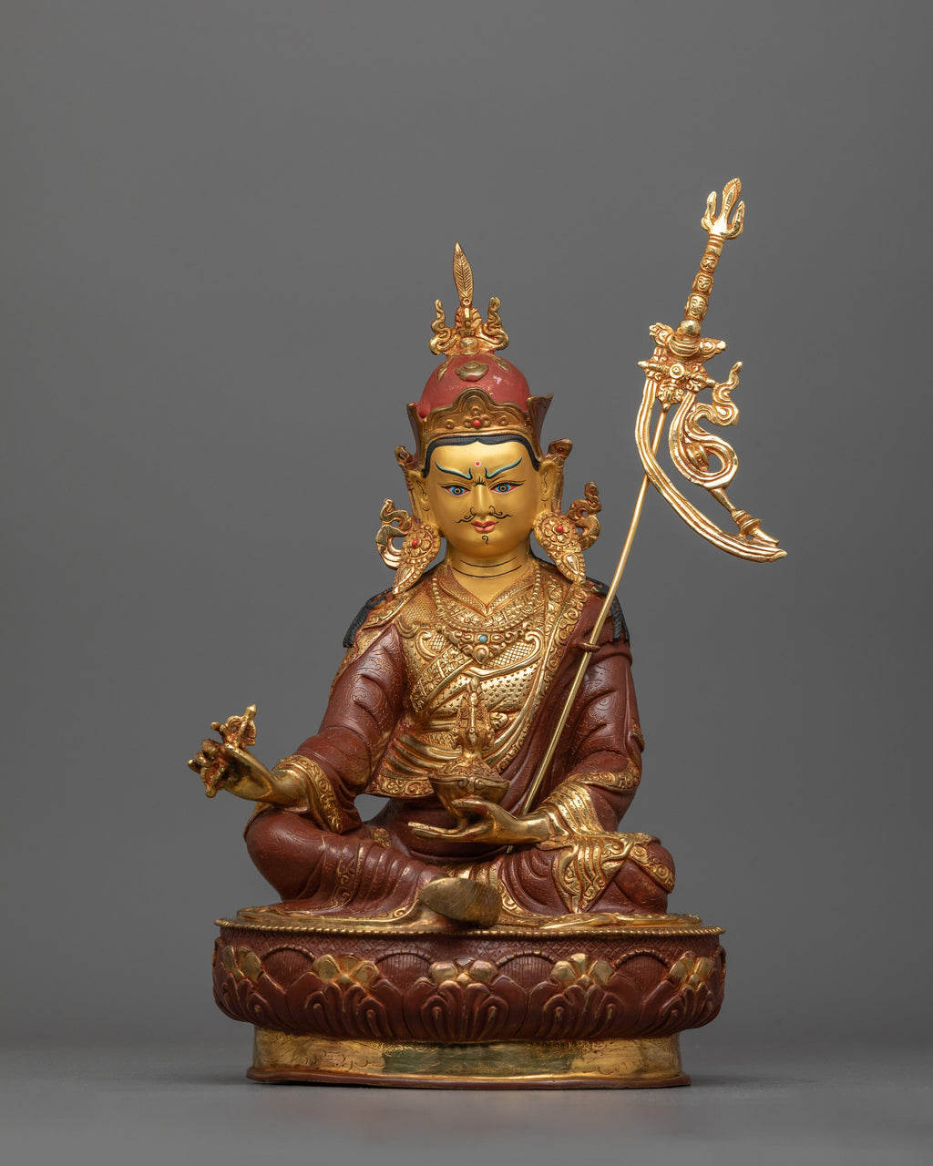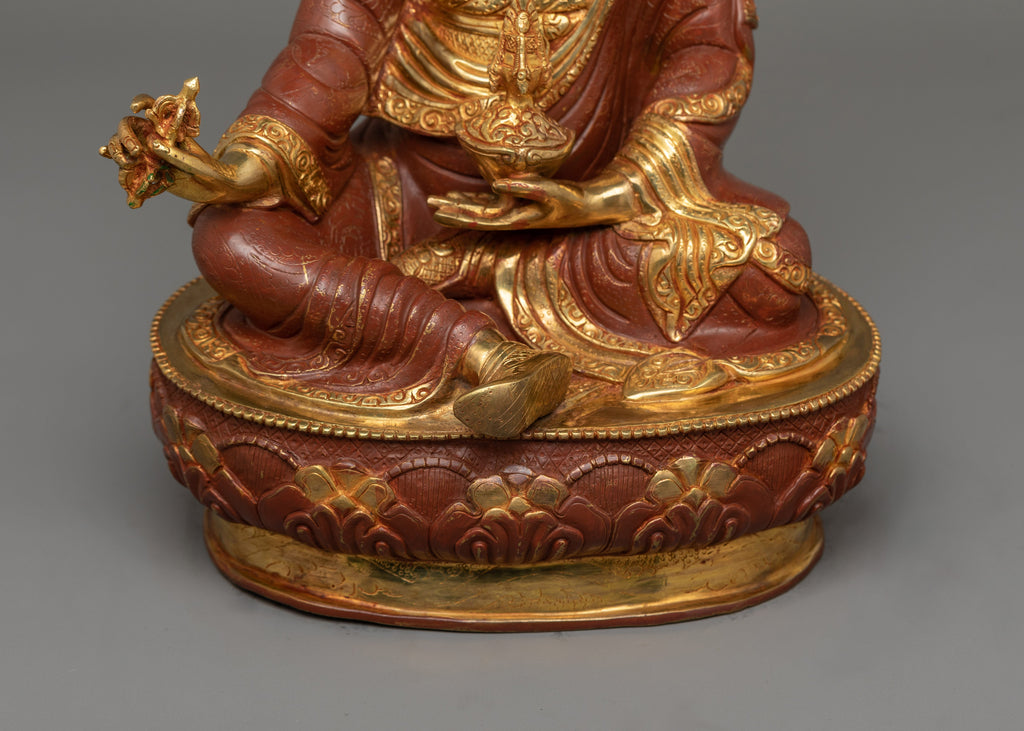 This statue is ideal for meditation altars, personal shrines, or as a thoughtful gift for spiritual practitioners. It promotes mindfulness, resilience, and a connection to the profound teachings of Tibetan Buddhism. The combination of oxidized copper and 24K gold ensures its long-lasting beauty, making it a valued centerpiece for future generations.