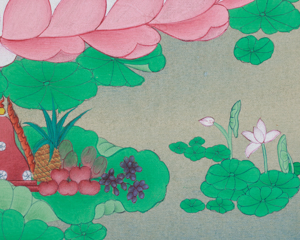 This thangka of Guru Rinpoche with Mandarva and Yeshe Tsogyal elegantly captures the divine essence and spiritual potency of Tibetan Buddhism. The artwork is executed on durable cotton canvas, providing an ideal medium for detailed craftsmanship that endures over time. Vibrant hues are achieved through natural stone pigments derived from crushed minerals such as lapis lazuli, malachite, and azurite, resulting in an enduring, spiritually meaningful creation. Authentic 24K gold accents are meticulously applied to highlight key elements, including the deity's robes, jewelry, and halo, thereby symbolizing his enlightened state and his divine connection to the Dharma.