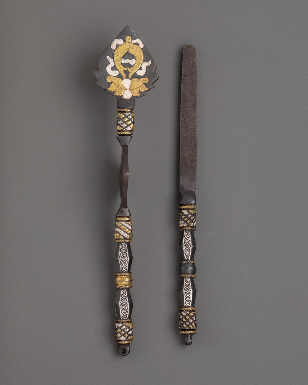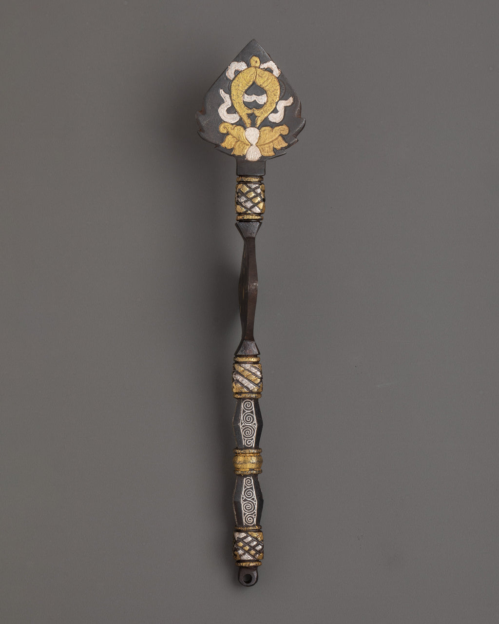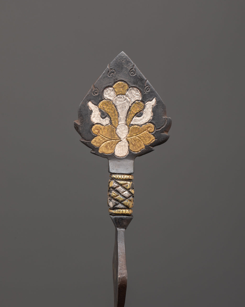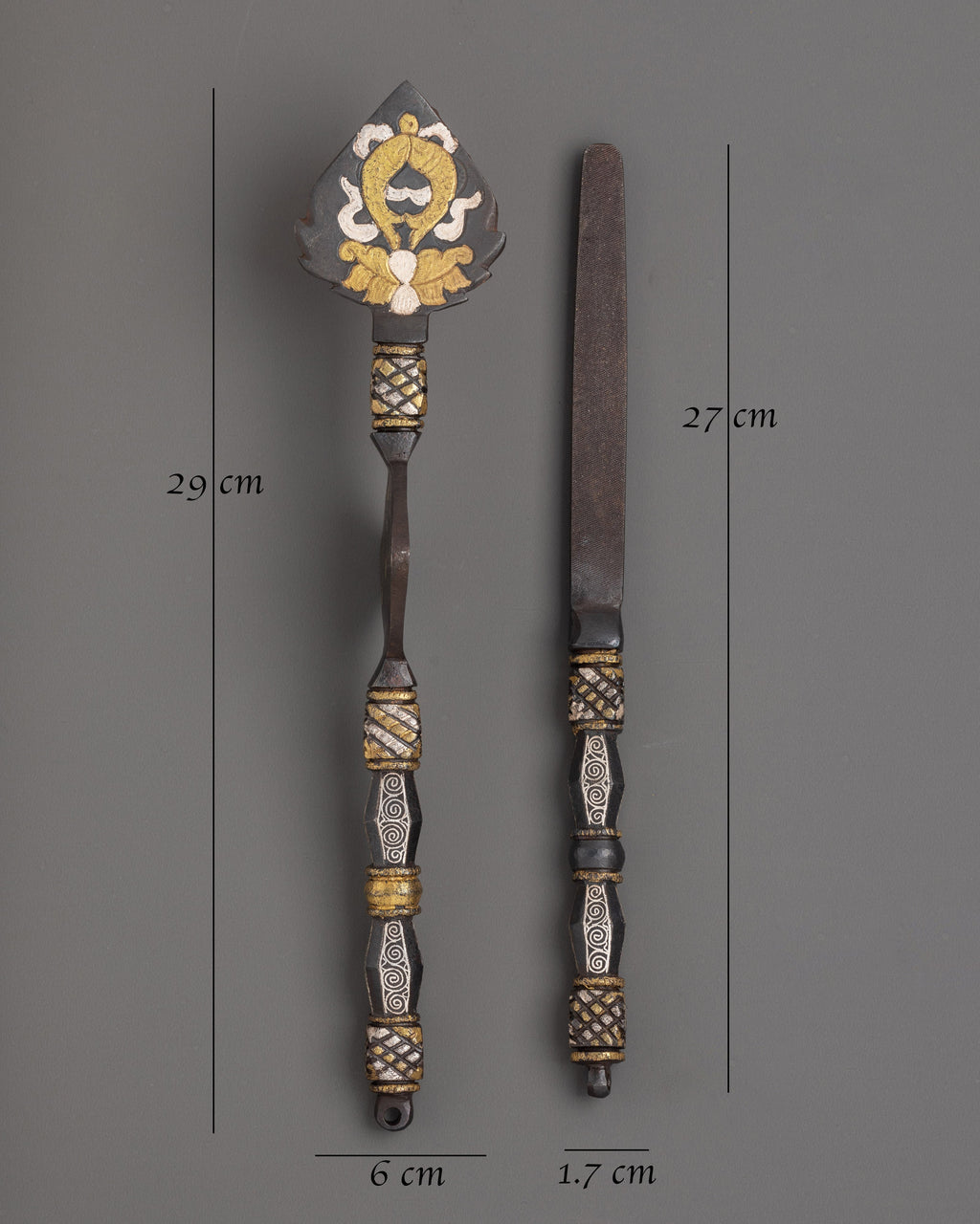 The Flat Daru, commonly viewed as a symbolic ceremonial blade, represents the act of cutting through illusion, ego, and ignorance, which is central to Buddhist teachings. This piece is used in empowerment rites (wangkur) to signify clarity and discernment. Together, the Rinzin Daru set serves as not only a functional component of holy practice but also a profound depiction of spiritual journey and development. Suitable for committed practitioners, ritual leaders, and collectors of genuine Vajrayana instruments.