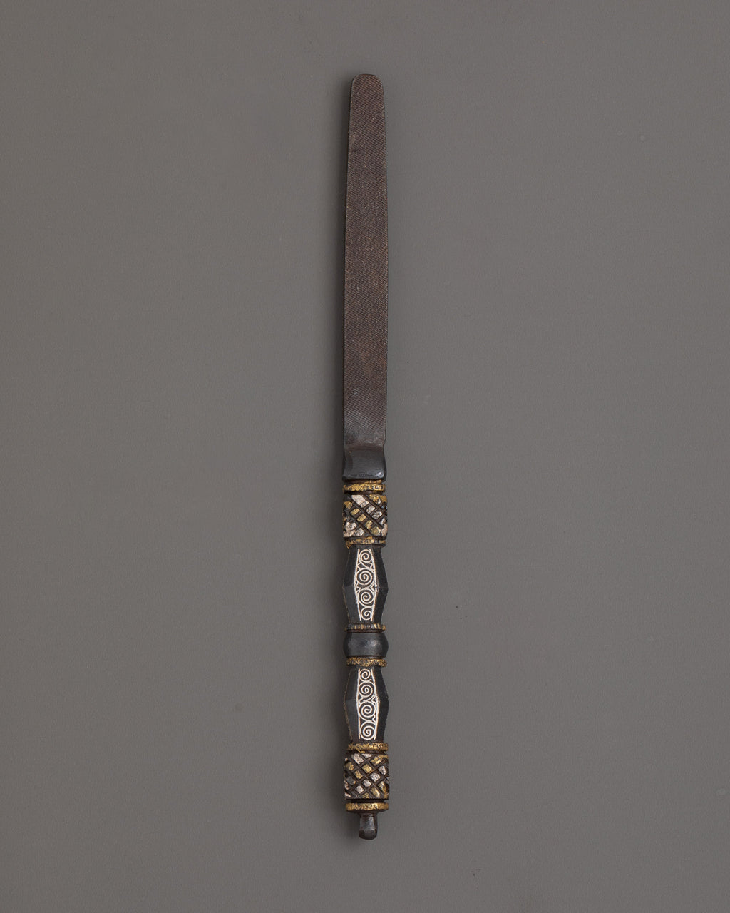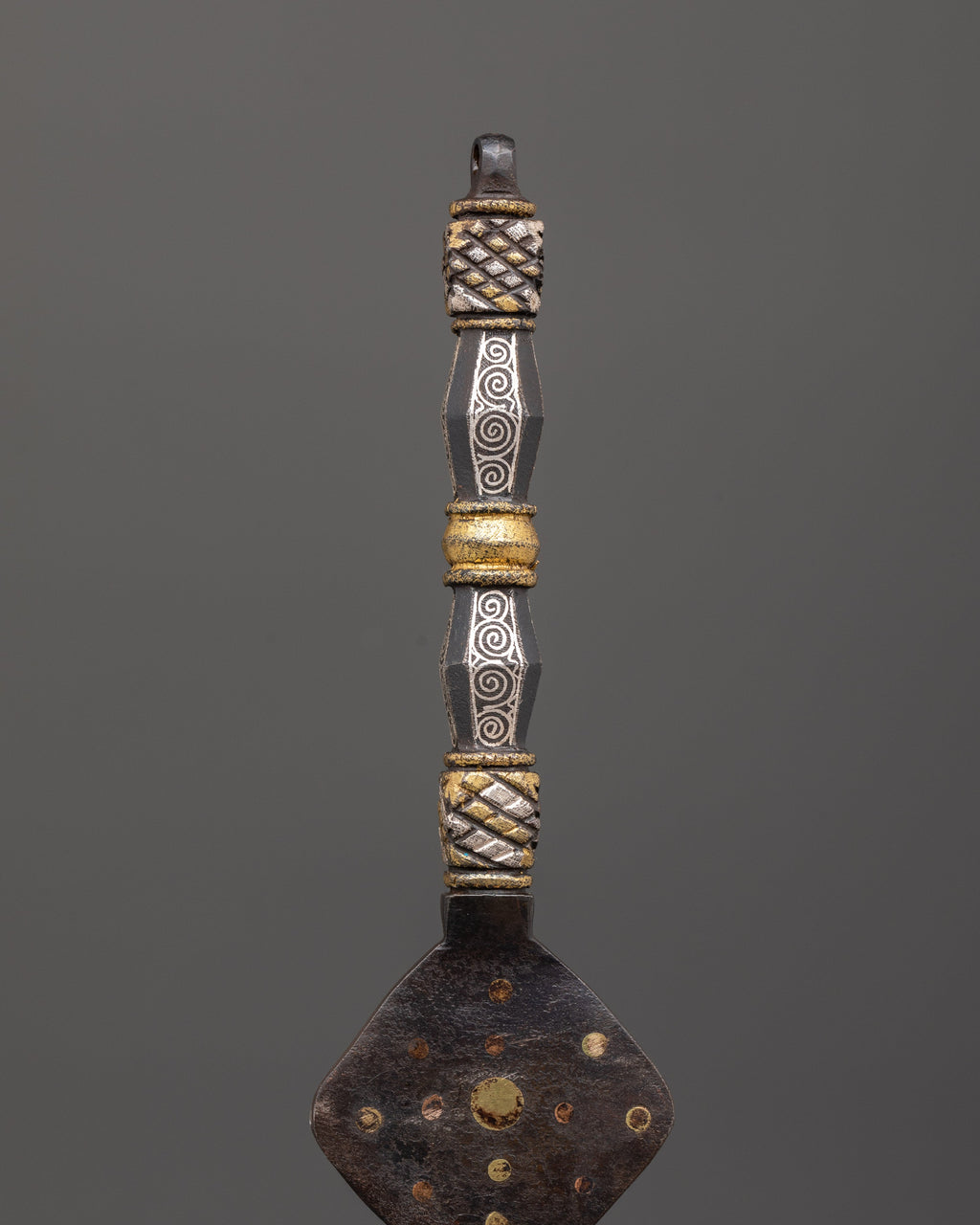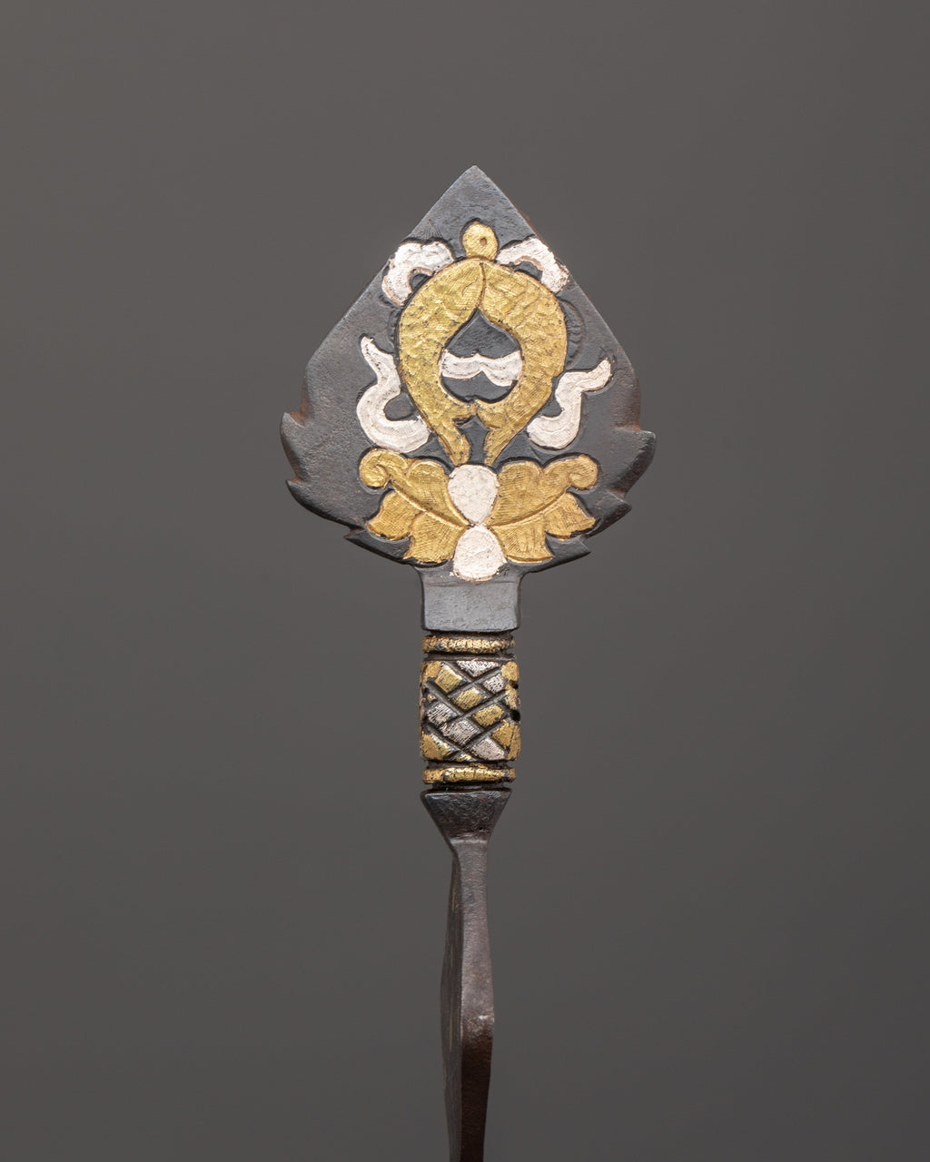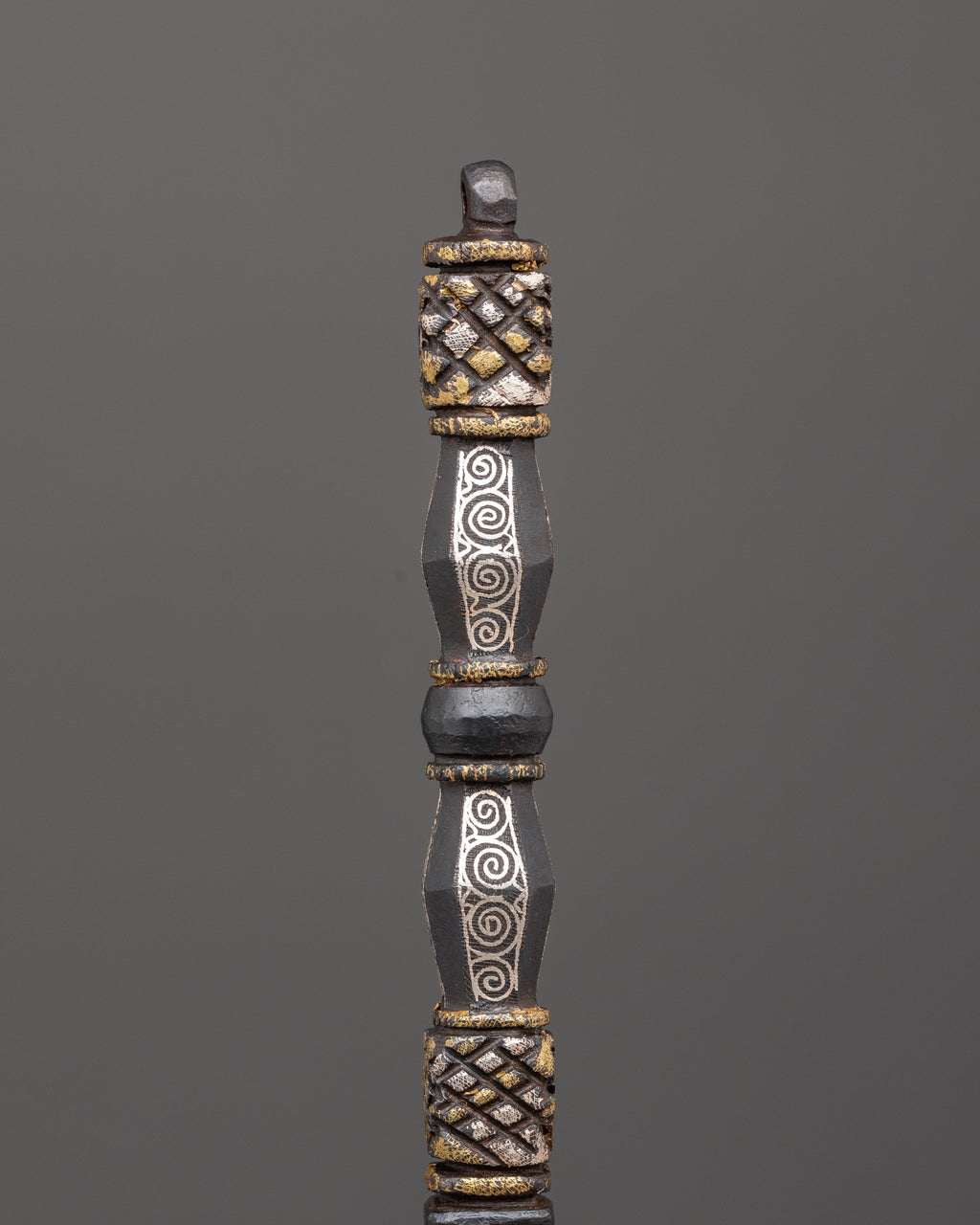 The Flat Daru, commonly viewed as a symbolic ceremonial blade, represents the act of cutting through illusion, ego, and ignorance, which is central to Buddhist teachings. This piece is used in empowerment rites (wangkur) to signify clarity and discernment. Together, the Rinzin Daru set serves as not only a functional component of holy practice but also a profound depiction of spiritual journey and development. Suitable for committed practitioners, ritual leaders, and collectors of genuine Vajrayana instruments.