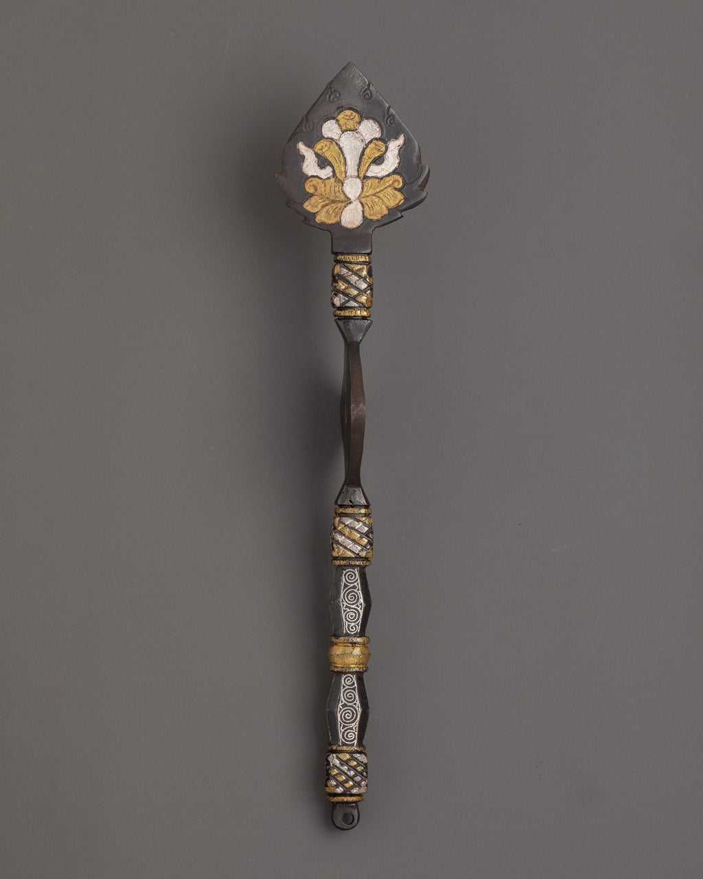 In Tibetan Vajrayana ceremonies, the Daru serves as a sacred offering instrument that symbolizes empowerment and transformation. The Golden Fish emblem on the Emblem Daru is one of the eight auspicious symbols (Ashtamangala), representing spiritual freedom, bravery, and liberation from suffering. The twisted handle and precise craftsmanship reflect the deep intention embedded in these sacred instruments, which are meant to be held during rituals of blessing, protection, or spiritual energy transfer.