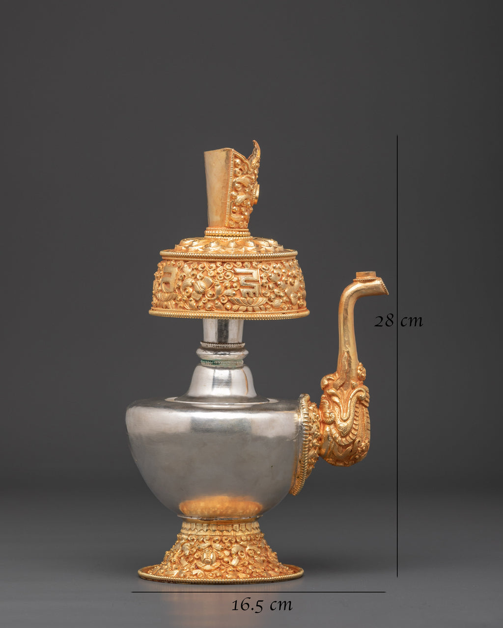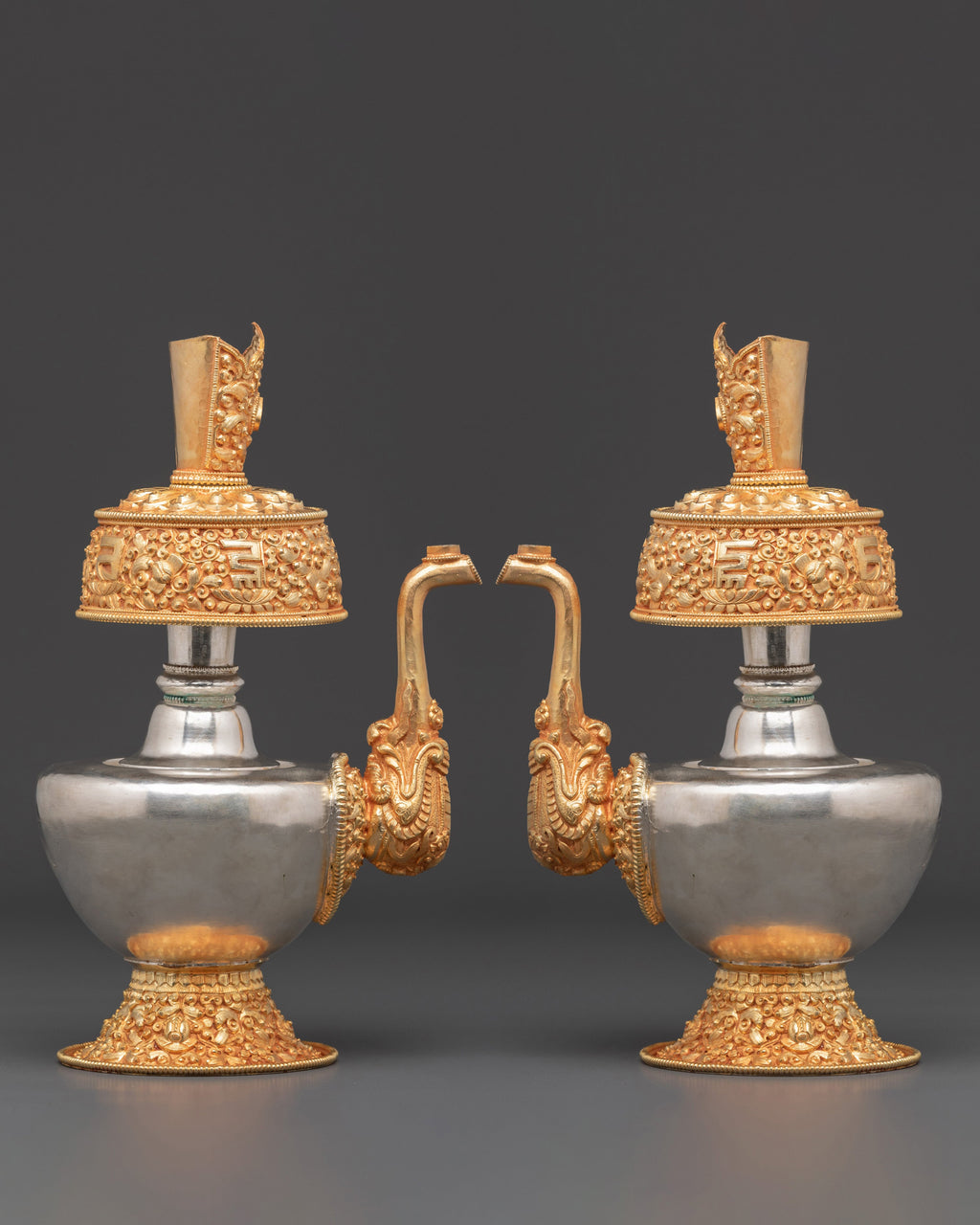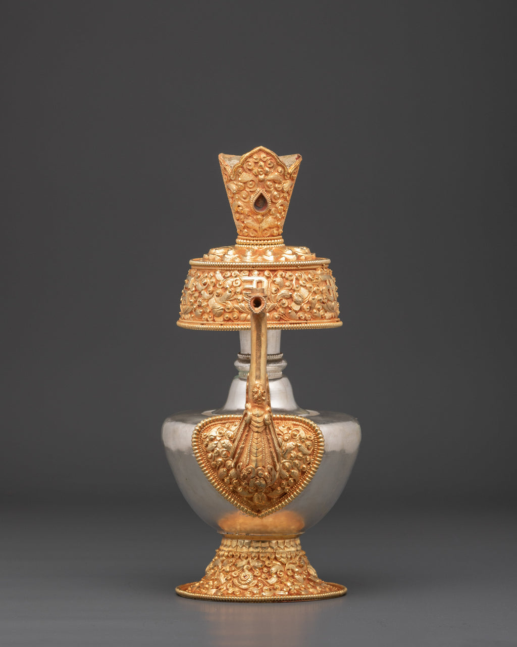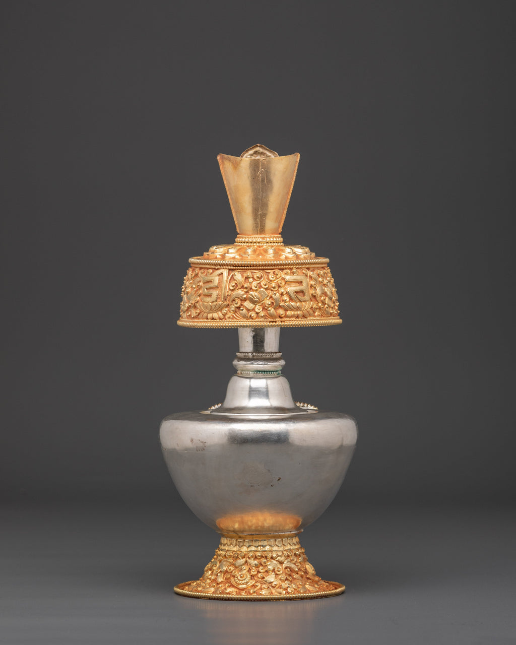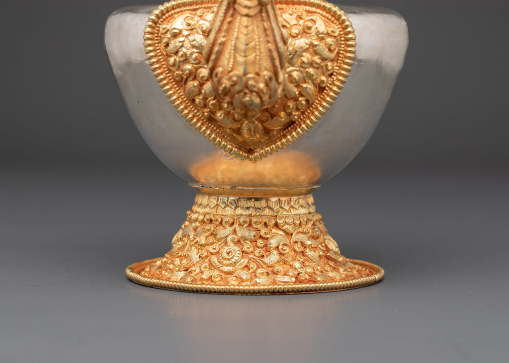 The silver and gold plating on this Ritual Bhumba not only enhances its visual appeal but also deepens its spiritual significance, making it a powerful addition to your sacred space. Ideally suited for Tibetan altars or meditation areas, this vessel elevates your rituals by fostering a stronger connection to the divine. Its presence encourages positive energy flow and spiritual purification, helping you create a serene and focused environment for your practice. Crafted with care and reverence, this offering vessel is a vital tool for anyone seeking to deepen their spiritual journey and bring harmony into their daily rituals. This set of bhumba is best for offering.