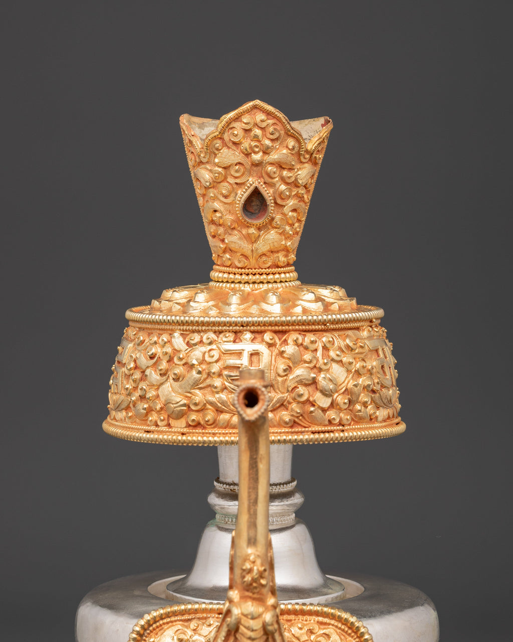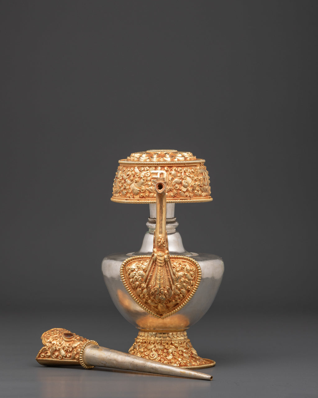 Water is essential in both Hindu and Buddhist rites, and it is always present on the altar, either in a pricey pot or in another container. Bhumba is a pot shaped like a flat jar, featuring a pipe to draw out the water, and is elaborately embellished with valuable stones and metal.