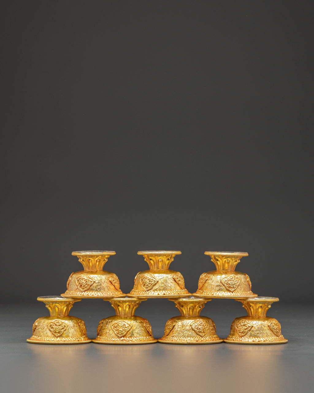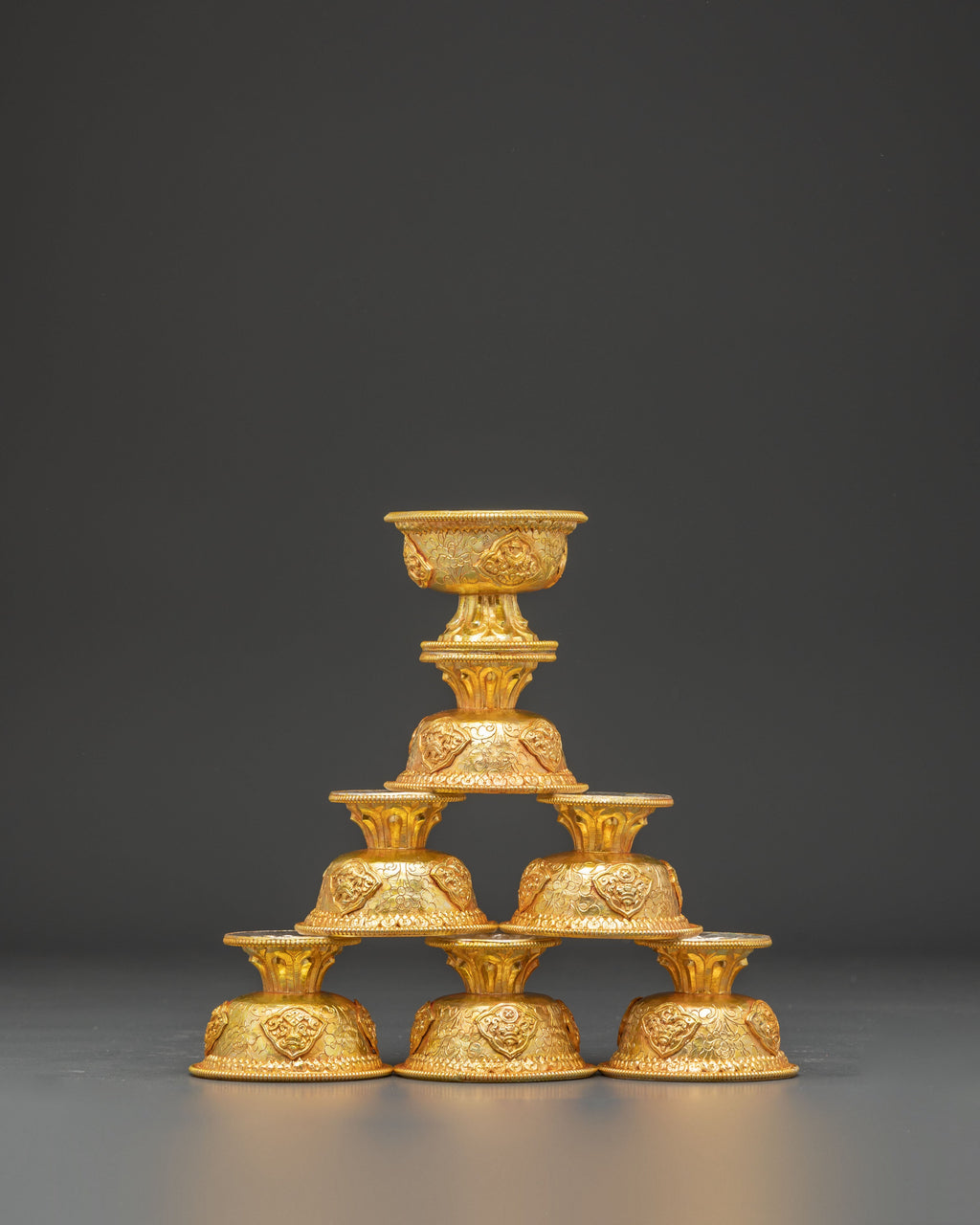 In Tibetan Buddhism, seven giving bowls are put on an altar to represent generosity, devotion, and reverence. Traditionally, they are filled with water to represent purity, clarity, and the presentation of offerings to enlightened spirits. Aside from water, practitioners may utilize grains, flowers, or other symbolic offerings to evoke blessings of harmony, wealth, and wisdom. The warm copper tones mixed with the bright gold plating give these bowls a mystical aura, elevating them above ritual objects and into works of art.