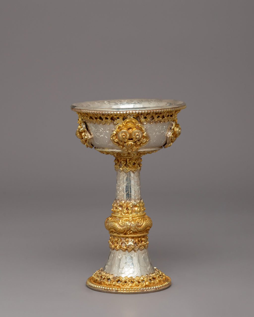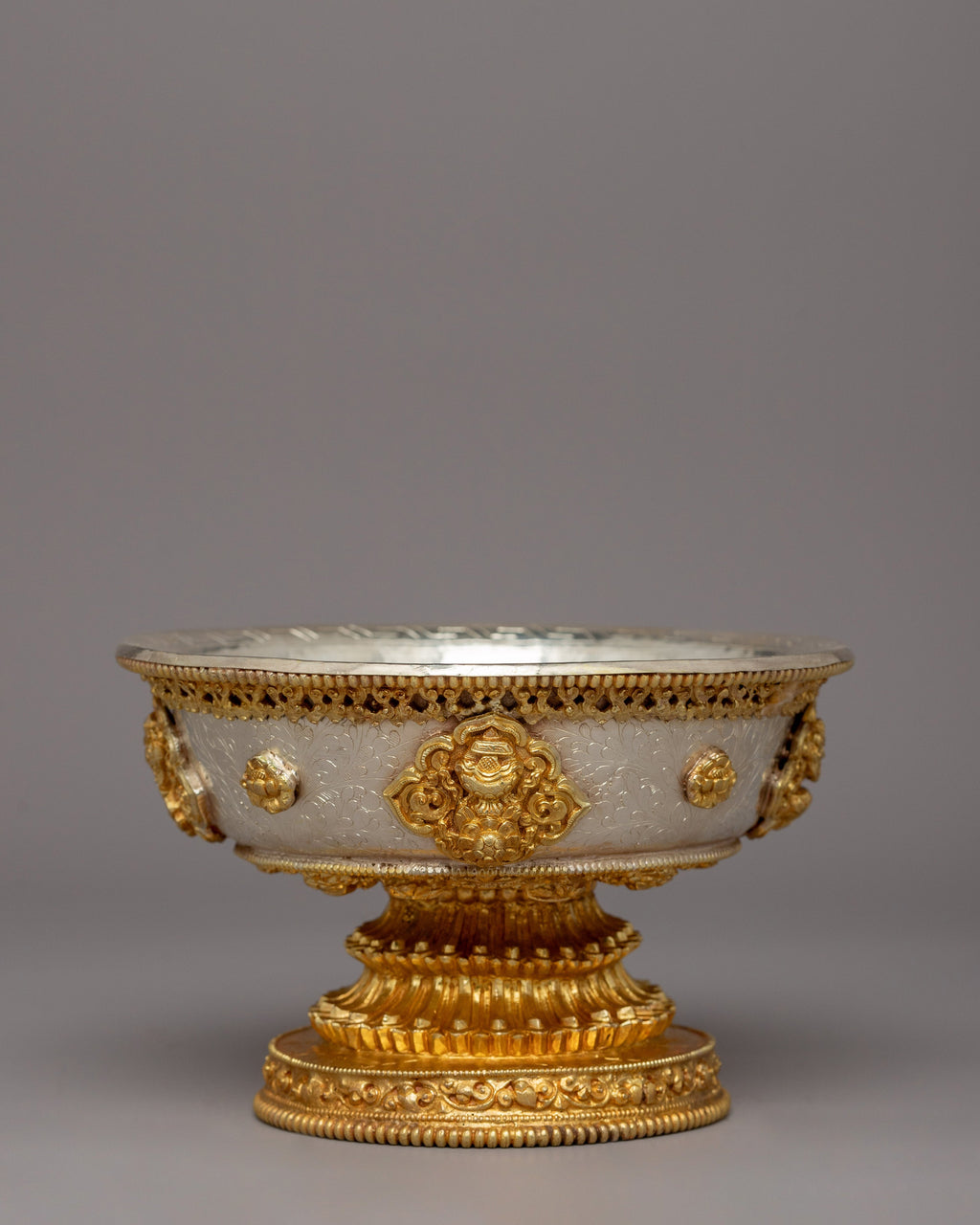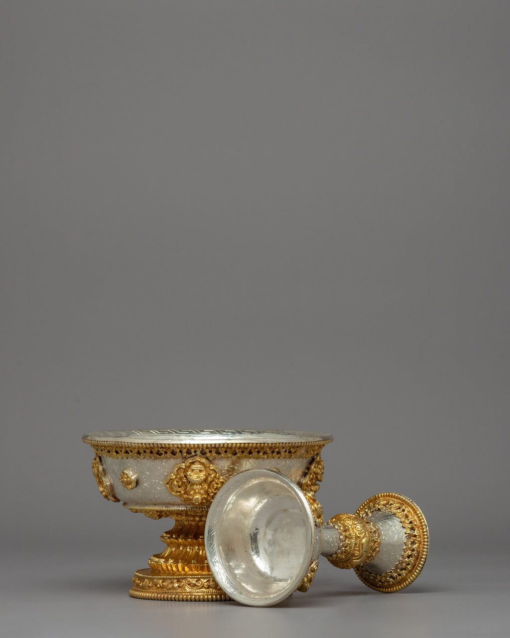 One of the main rituals in Buddhist ceremonies, devotional offering, is symbolized by the Serkyem Set in Buddhist symbolism. This set's offering bowls are used to ask for divine benefits; each offering represents thankfulness, purity, and the removal of barriers. While the silver plating raises the object's spiritual vibration, the gold plating represents the object's noble and enlightened state. With its two-tiered structure, the set's design might be seen as symbolizing the dual character of the Buddhist path, which is compassion and wisdom, both of which are necessary for enlightenment and spiritual development.