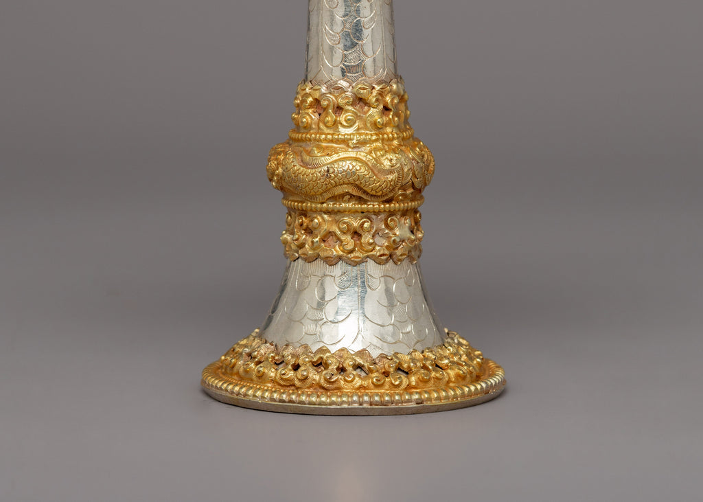This gorgeous Serkyem Set weighs 1.05 kg and is 19 cm in height by 15.5 cm in width. This offering set, which has a copper body and is beautifully silver and gold-plated, is an excellent complement to any Buddhist altar. In Buddhist ceremonies, the Serkyem offers alcohol or nectar to the gods during holy rites, signifying purity, dedication, and reverence for the divine. For those who practice and make offerings, silver and gold plating heightens their spiritual importance by conjuring up images of purity and spiritual richness.