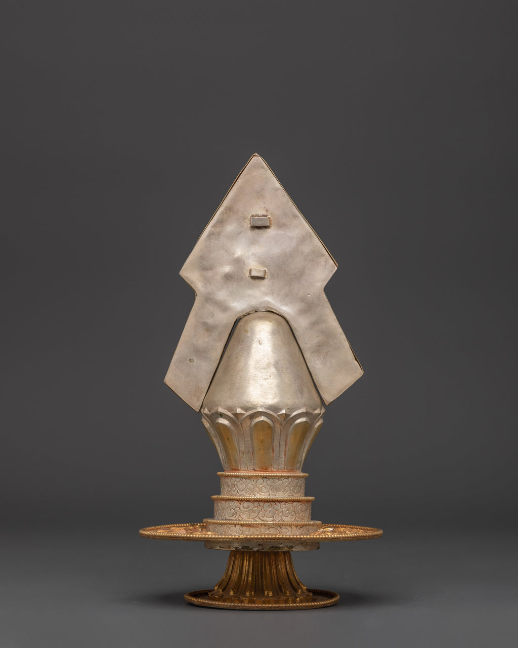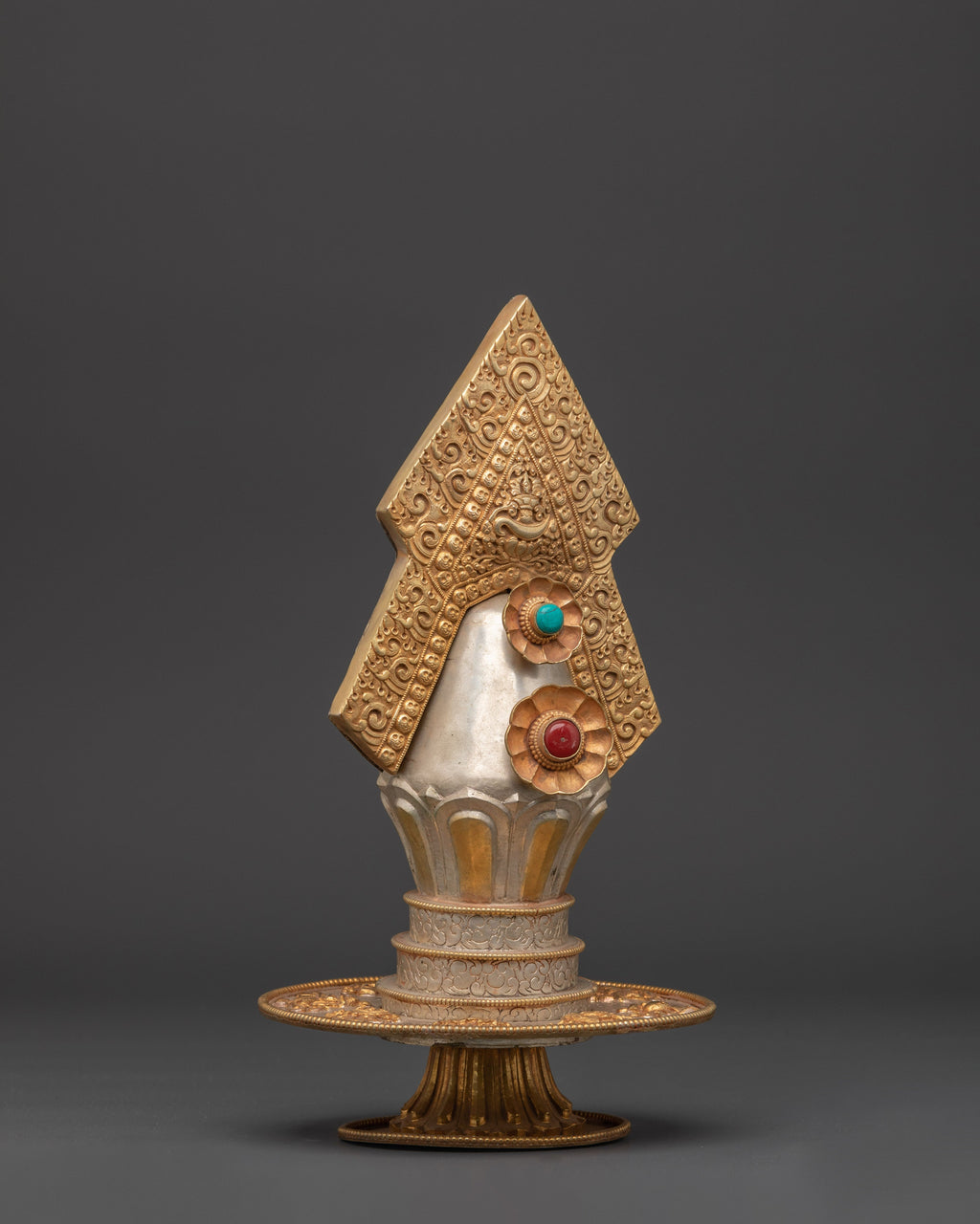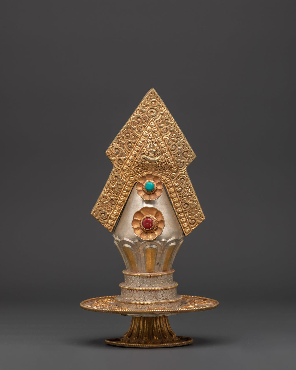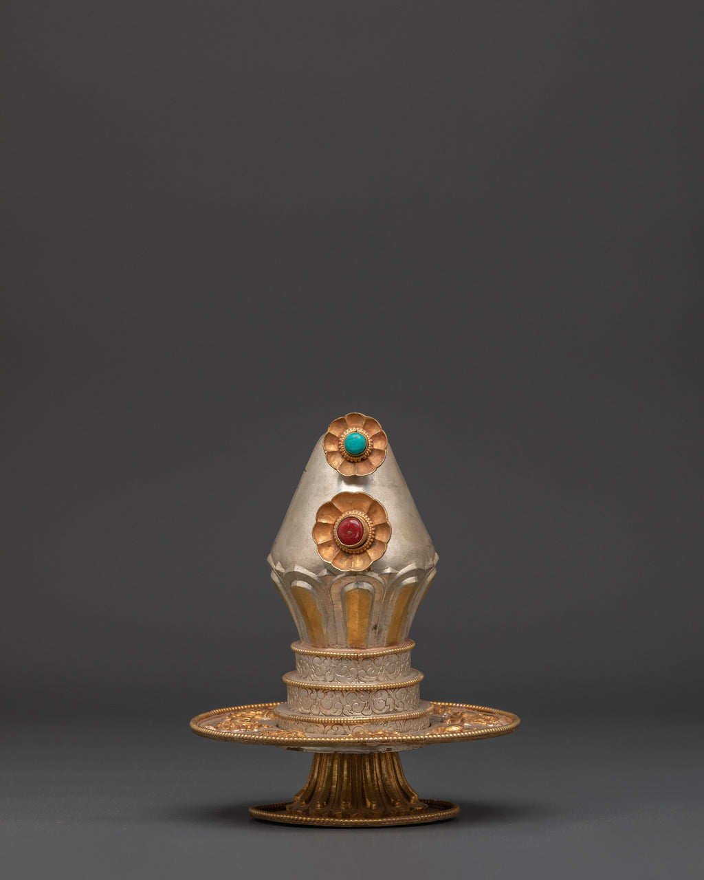 This beautifully crafted Ritual Offering Torma is an essential addition to any altar or meditation space, infusing your environment with a profound spiritual presence. Expertly made from copper and enhanced with both gold and silver plating, it radiates elegance and sacredness. The carefully chosen gemstones not only elevate their aesthetic appeal but also deepen their spiritual significance, symbolizing purity and balance. Its exquisite design reflects traditional craftsmanship, making it a timeless piece for Buddhist practitioners. Whether incorporated into meditation sessions or ritual offerings, this Torma embodies devotion and spiritual harmony, helping you cultivate inner peace and connection with the divine.