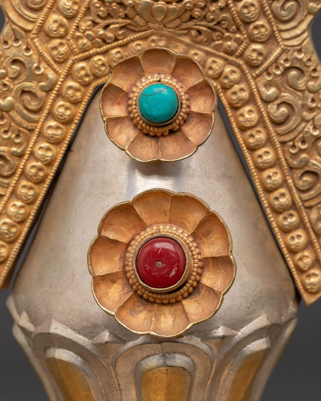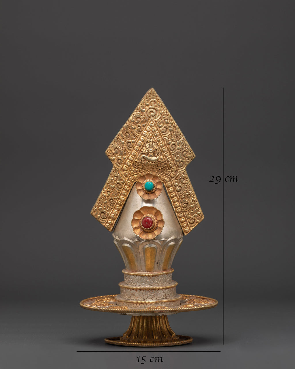 Enhance your sacred space with this Tibetan Ritual Offering Torma, explicitly crafted for Buddhist rituals and spiritual ceremonies. Measuring 29 cm in height and 15 cm in width, it is made from copper with gold and silver plating, and decorated with turquoise and artificial coral stones that represent purity, protection, and spiritual energy. Traditionally used in Tibetan Buddhism as an offering to deities, this Torma supports the flow of blessings and purification throughout your ceremonies.