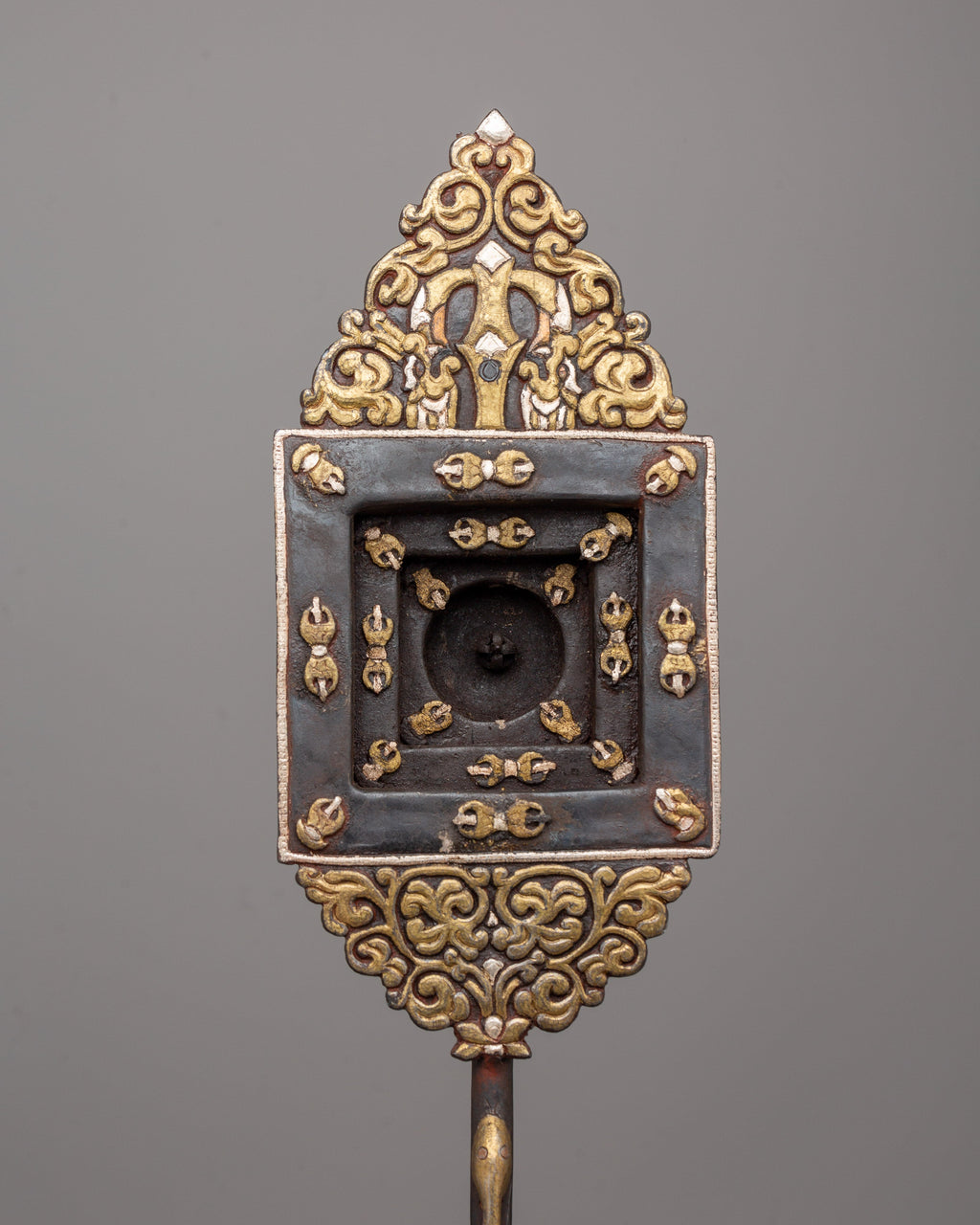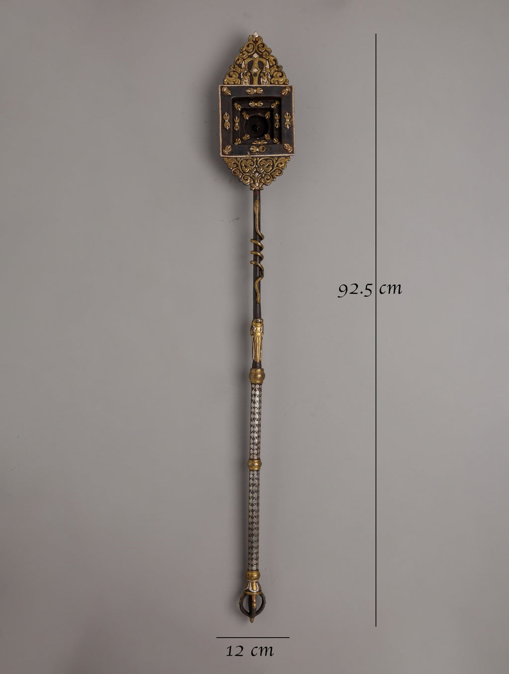 Immerse yourself in the holy traditions of Buddhist ceremonies with this Fire Offering Ritual Spoon Set, a work of spiritual art. This set emanates devotion and beauty, meticulously crafted from iron and embellished with 90% silver and brass inlays. The square spoon is 92.5 cm long, and the round spoon is 81.5 cm tall, with a total weight of 2.96 kg, ensuring both durability and elegance. These spoons are more than simply tools; they are holy containers that represent the purity of your gifts, giving your ceremonies tremendous meaning.