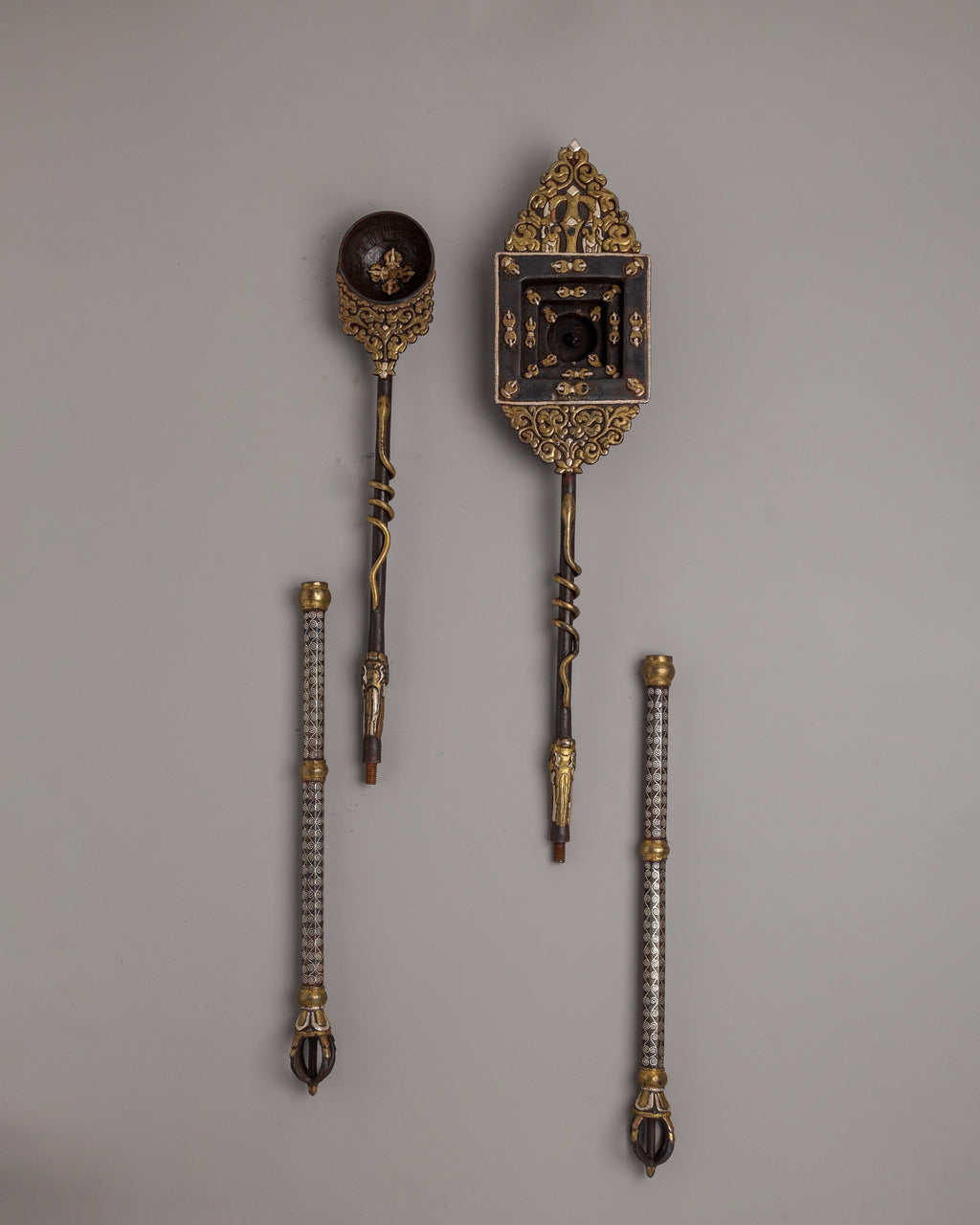 Every piece of this set demonstrates its creators' eternal creativity and spiritual passion. The exquisite inlays represent passion and care, making this set utilitarian and a beautiful piece of art. Whether you are a committed practitioner or a fan of Buddhist culture, this ritual spoon set is an excellent addition to your altar or collection. It serves as a reminder of the transformational power of fire offerings, linking you to centuries-old traditions while increasing your spiritual practice's purity.