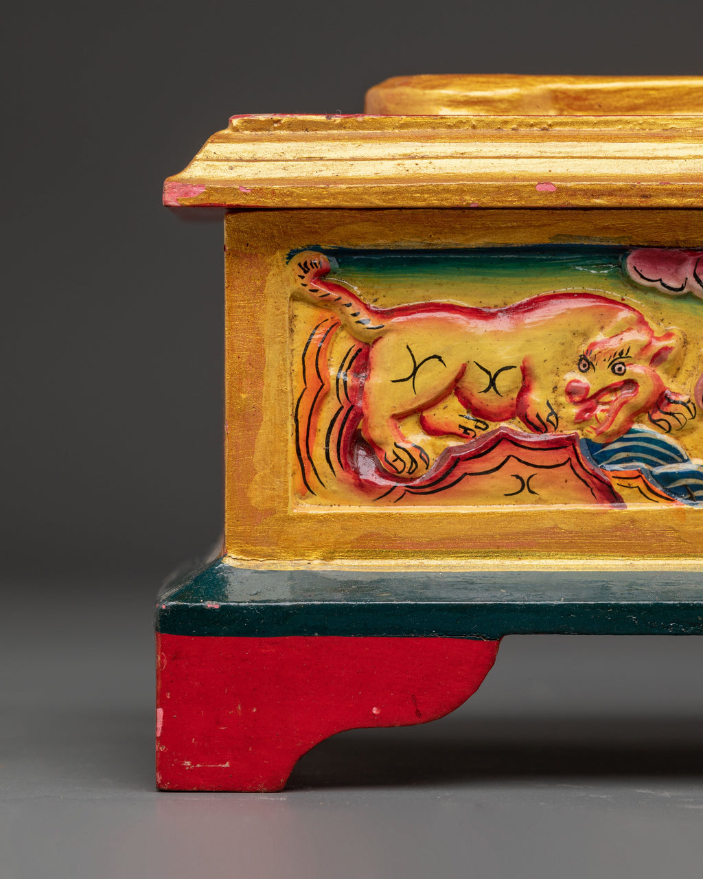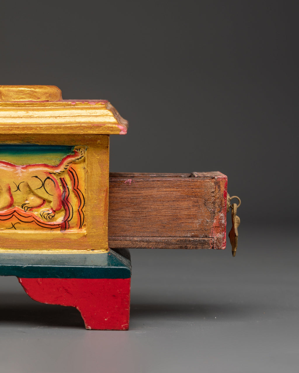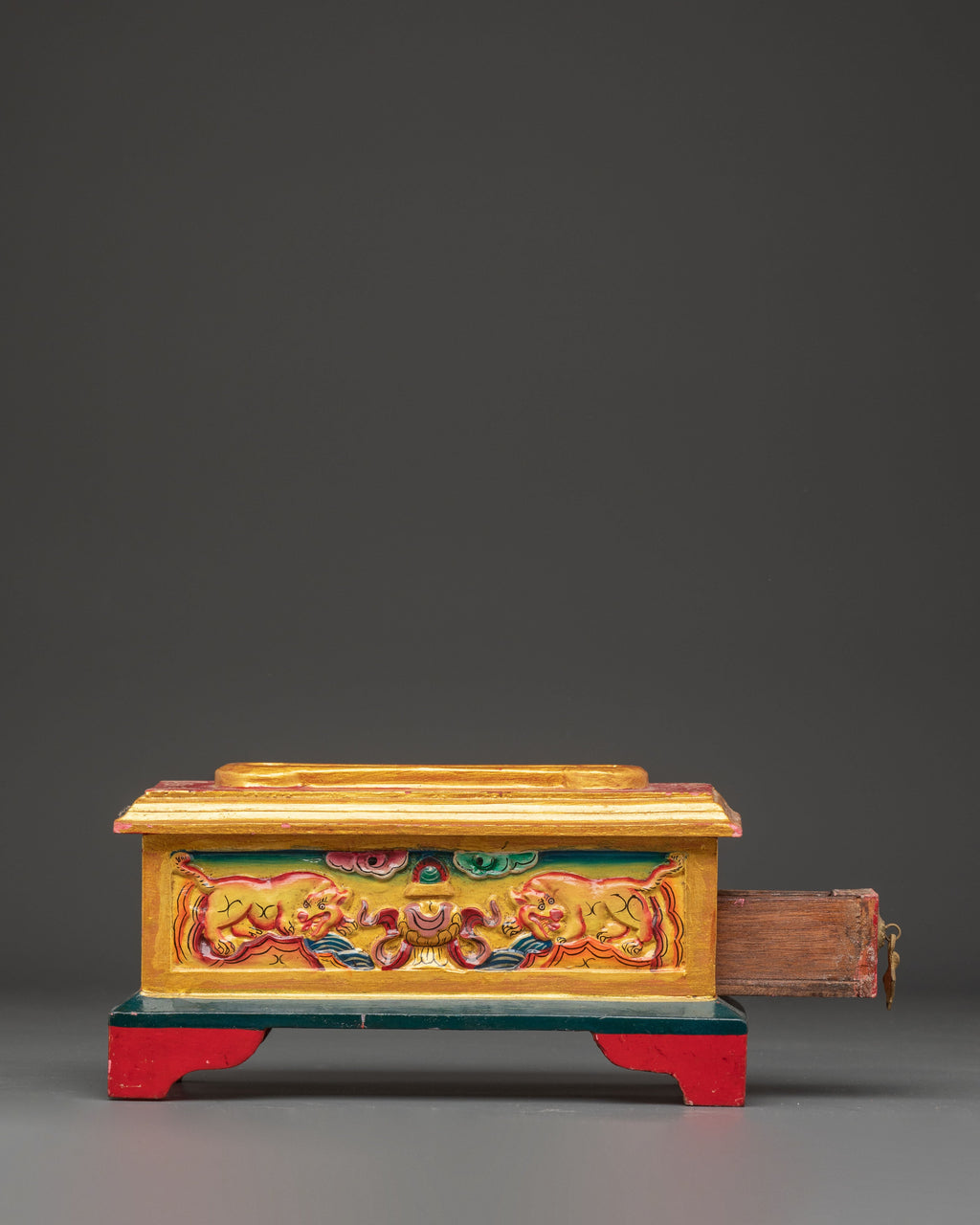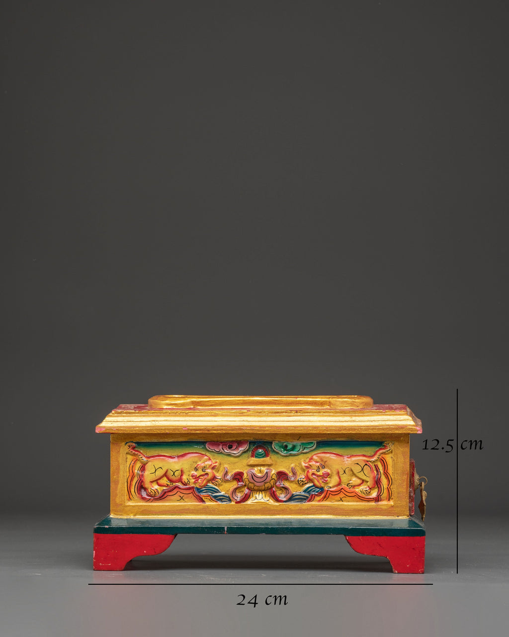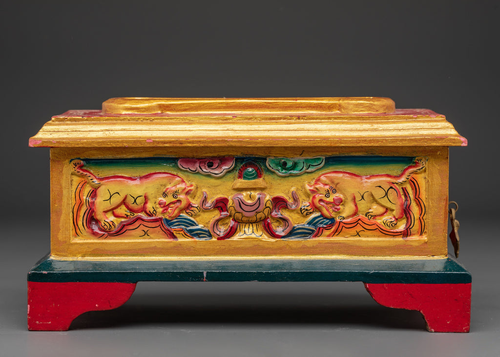 This Ritual Wooden Incense Burner, a handcrafted piece of Tibetan creativity that combines cultural symbolism with spiritual design, will elevate your meditation and prayer practices. This incense holder, 12.5cm in height and 24cm in width, is made of wood and hand-painted with acrylic colors, making each one unique. With a balanced weight of 0.66kg, it is the ideal centerpiece for shrines, meditation rooms, or spiritual meetings.