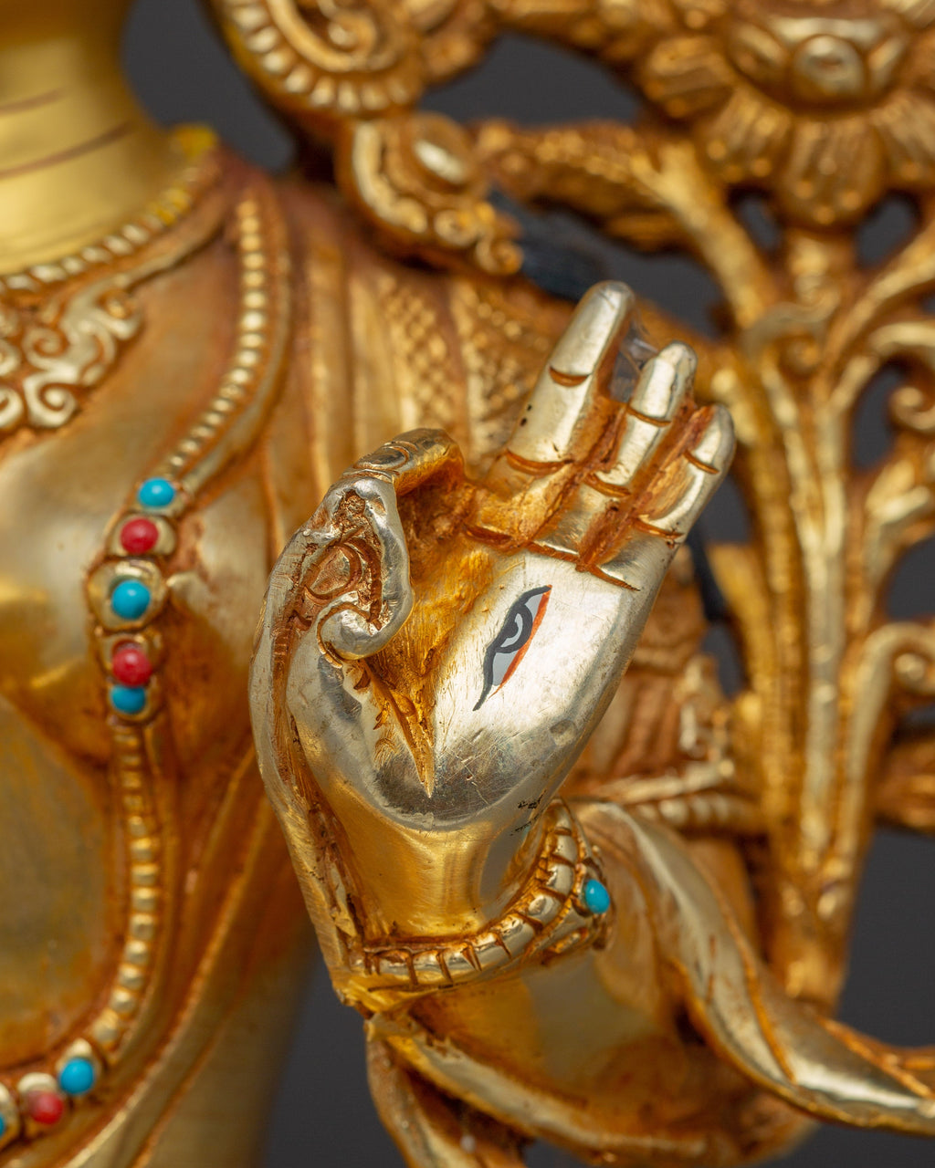 White Tara, one of the esteemed Three Long Life Deities, represents compassion and longevity. She is gracefully seated in the padmasana posture (full lotus) atop a moon disc and lotus base, symbols of purity and enlightened presence. Her right hand performs the Varada Mudra, holding the stem of the lotus, granting blessings and offering compassion to those in need. In her left hand, held in the Vitarka Mudra, the gesture of teaching and discourse, she holds a lotus, symbolizing spiritual growth and purity free from suffering. White Tara is uniquely depicted with seven eyes—two on her face, one on her forehead, and one on each hand and foot—representing her limitless perception and all-encompassing wisdom that sees the suffering of all beings. Adorned with a five-Dhyani Buddha crown, she embodies the five wisdoms that dissolve ignorance and foster enlightened awareness. Her divine adornments, including necklaces, bracelets, and flowing silks, enhance her celestial radiance and graceful form.