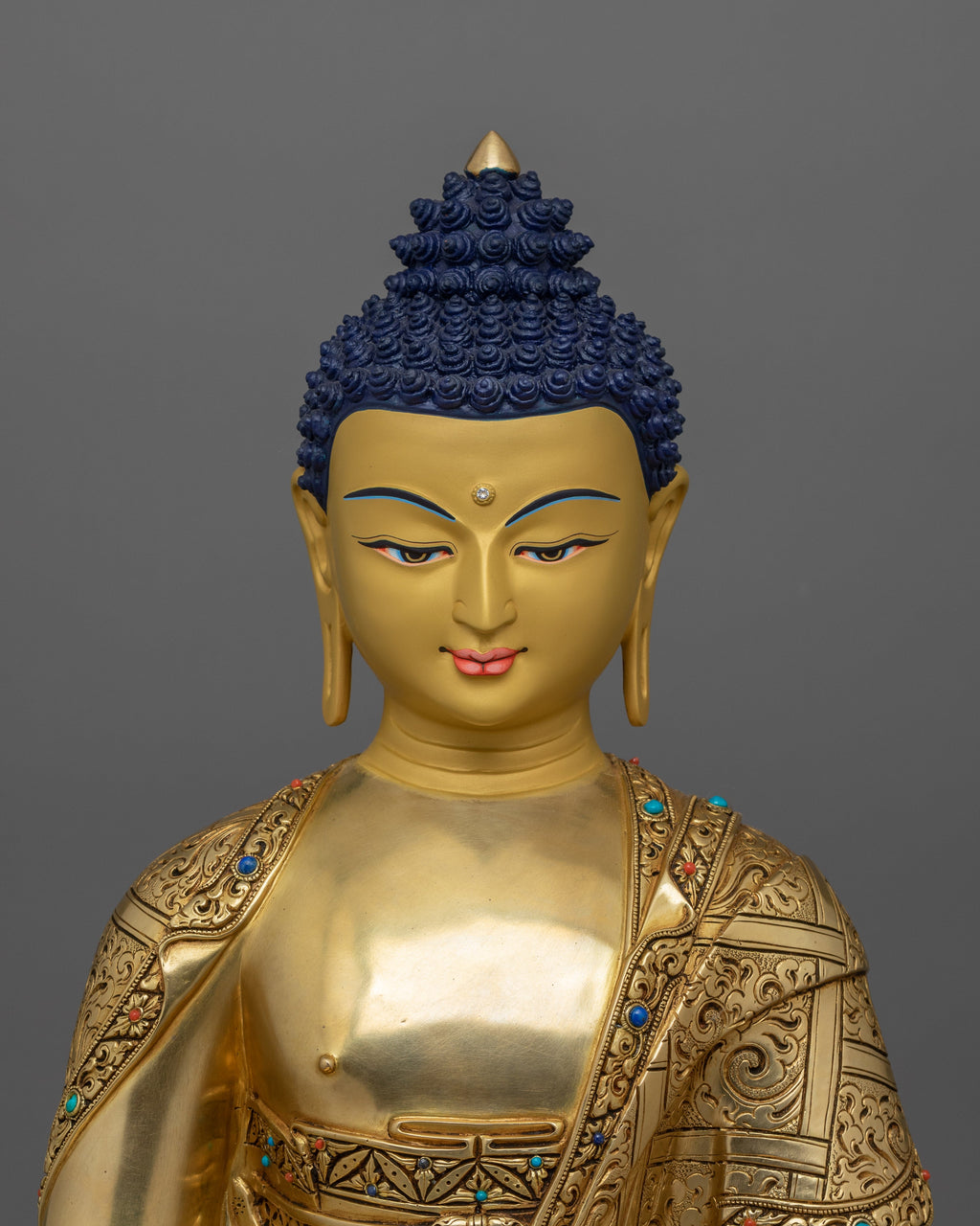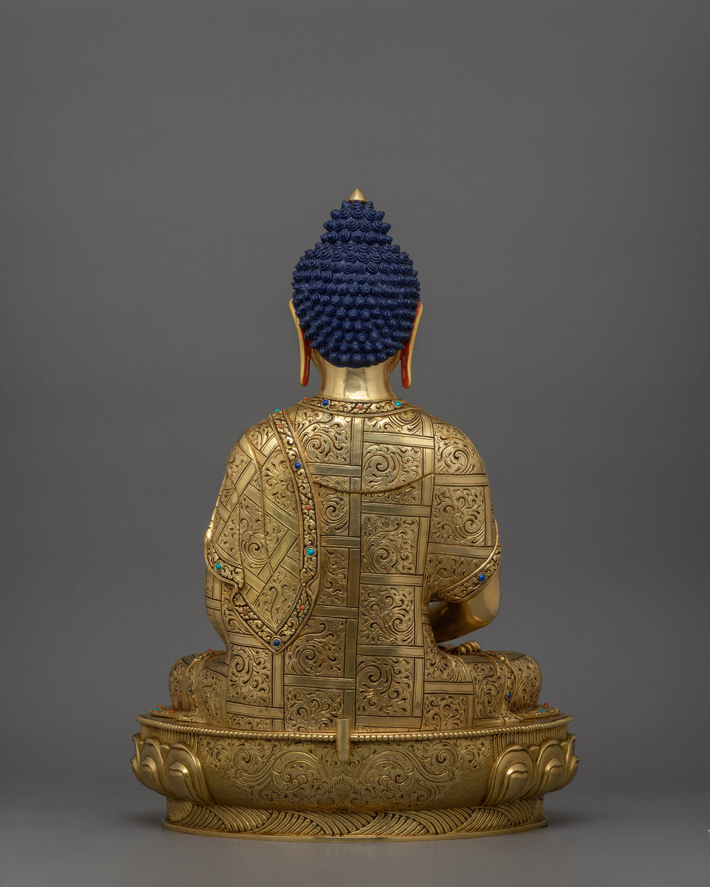 This Sacred Amitabha Infinite Light Buddha Statue stands at 19.9” (50.5cm) in height with a base width of 12.2” (31cm) and is made of copper, covered with triple layer 24K gold gilding and carved with deeply engraved carvings that produce a magnificent 3D-like effect. This sculpture, adorned with gemstones, handcrafted by expert Nepalese artisans, elegantly symbolizes Himalayan Buddhism's sacred traditions, making it an appropriate addition to altars, meditation places, or sacred collections. collections.
