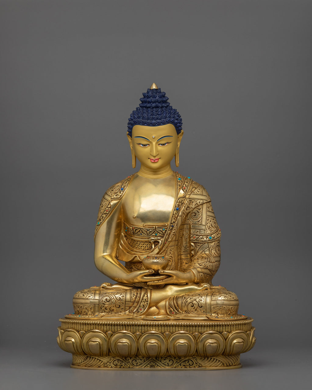 Amitabha is shown in a tranquil sitting stance, holding an alms bowl in his lap to symbolize renunciation and the simplicity of the enlightened life. His peaceful countenance represents the knowledge and compassion he bestows on individuals seeking rebirth in his Pure Land, Amitabha's dedication to assisting all creatures in achieving spiritual awareness and freedom is demonstrated by this gesture.