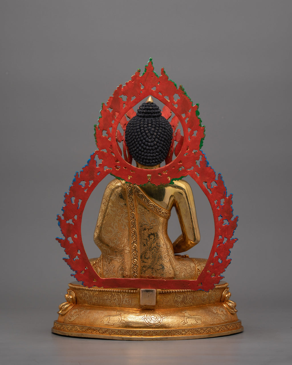 This Pure Land Buddha Amitabha Statue With Halo stands 14.2” (36cm) in height with a base width of 9.8” (25cm). Crafted from a copper body, the statue is enhanced with 24K gold gilding, giving it a radiant finish. Intricate gold and acrylic paintings bring the statue's features to life, adding color and detail to the serene depiction of Amitabha Buddha. Crafted by expert artisans, this item symbolizes the rich traditions of Himalayan Buddhism, making it an important addition to altars, meditation places, or holy collections.