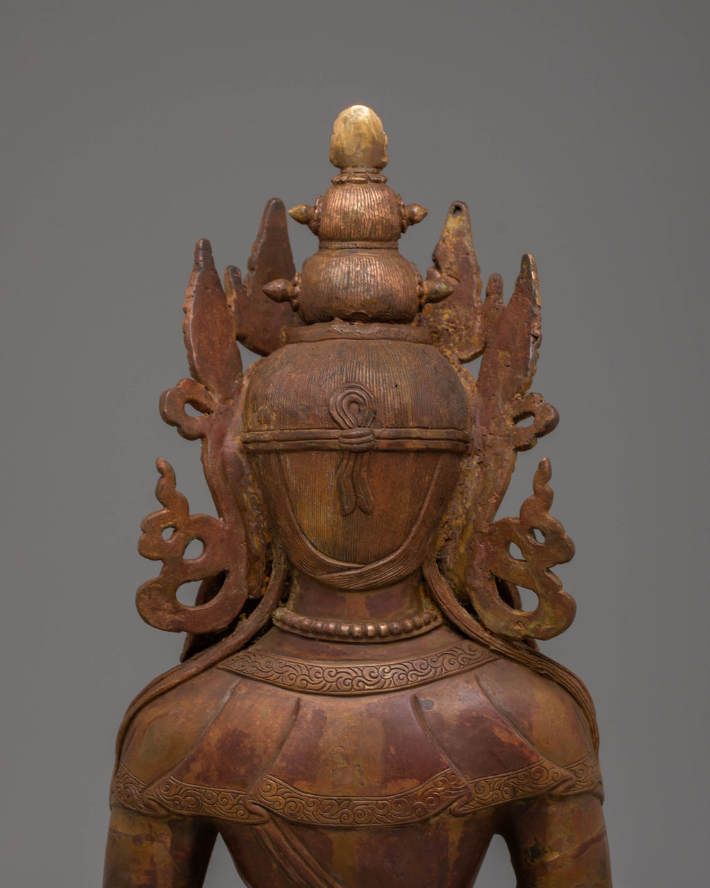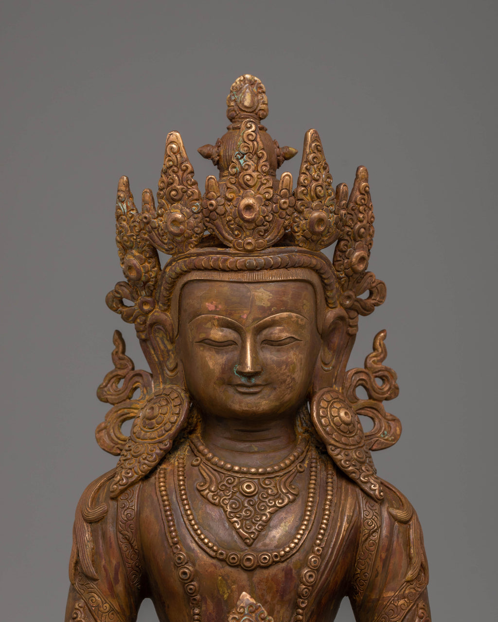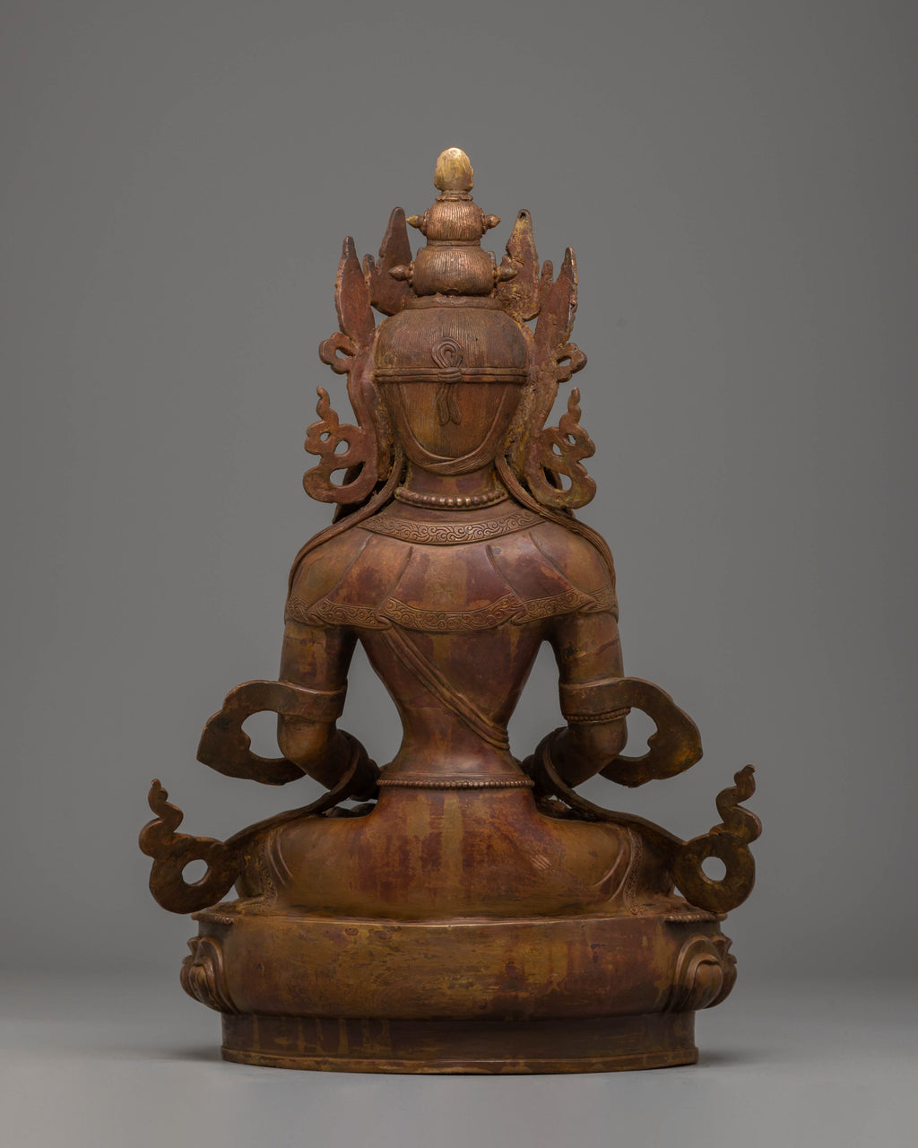 This Amitayus Enlightenment Statue features delicate motifs that symbolize purity, peace, and divine protection. The oxidized copper body gives the statue an elegant finish, enhancing its sacred, timeless appearance. The rich detailing on the figure’s crown, robes, and the lotus throne on which it sits further enhances its spiritual significance, making it an ideal focal point for meditation spaces, Buddhist altars, or as a meaningful decorative piece in any home.
