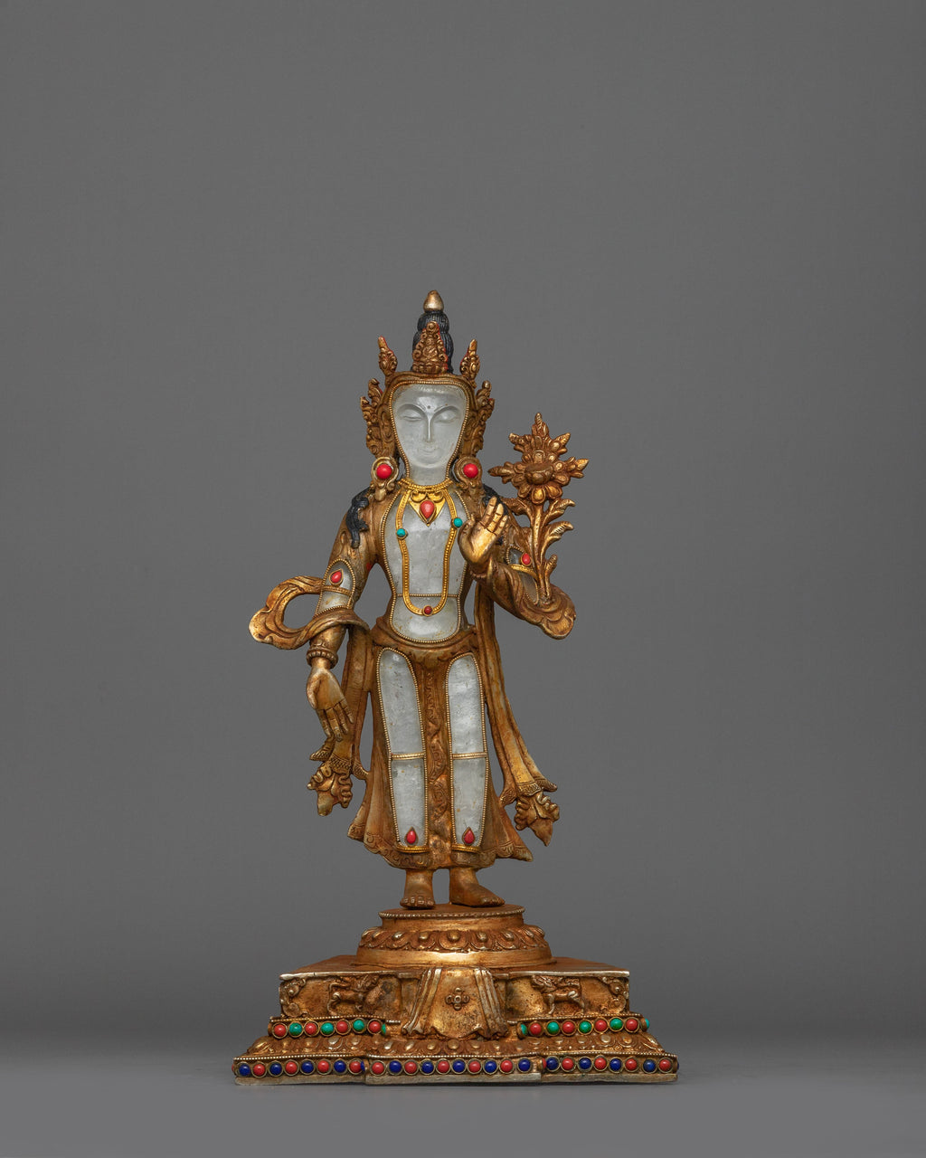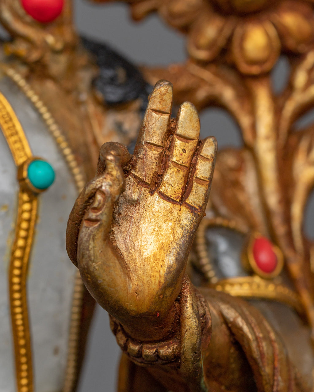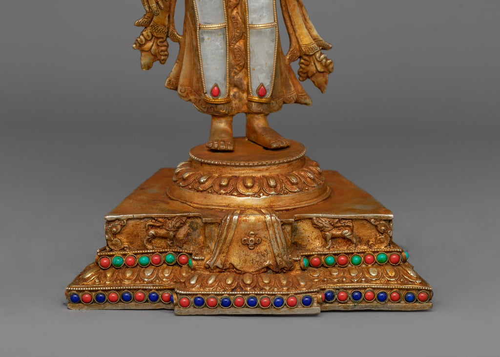 He is shown with a serene expression that reflects his infinite compassion and wisdom. Hisright hand, extended in the varada mudra, signifies generosity and his readiness to grant blessings, and his left hand, holds alotus flower, symbolizing purity, spiritual awakening, and his transcendence above worldly impurities.