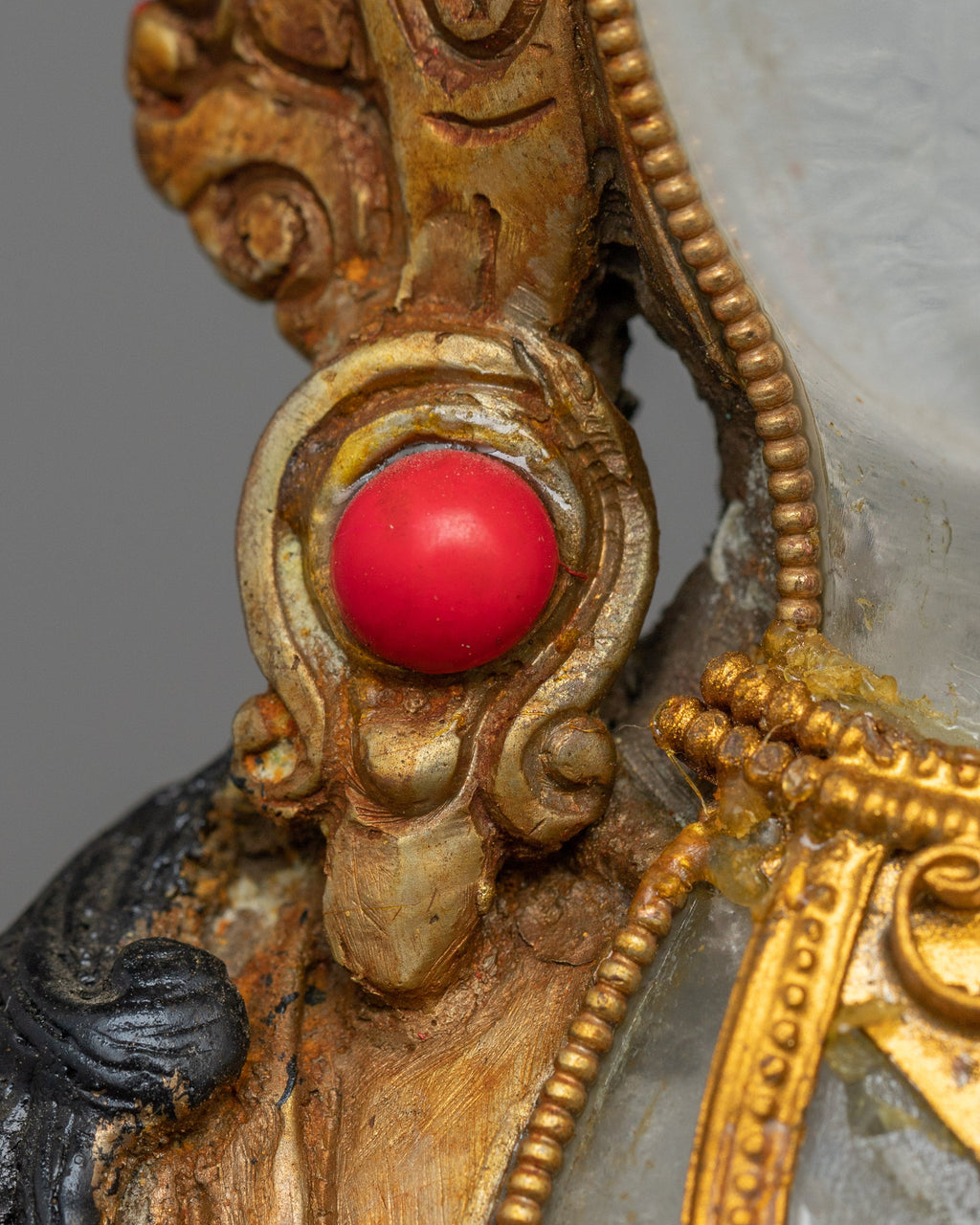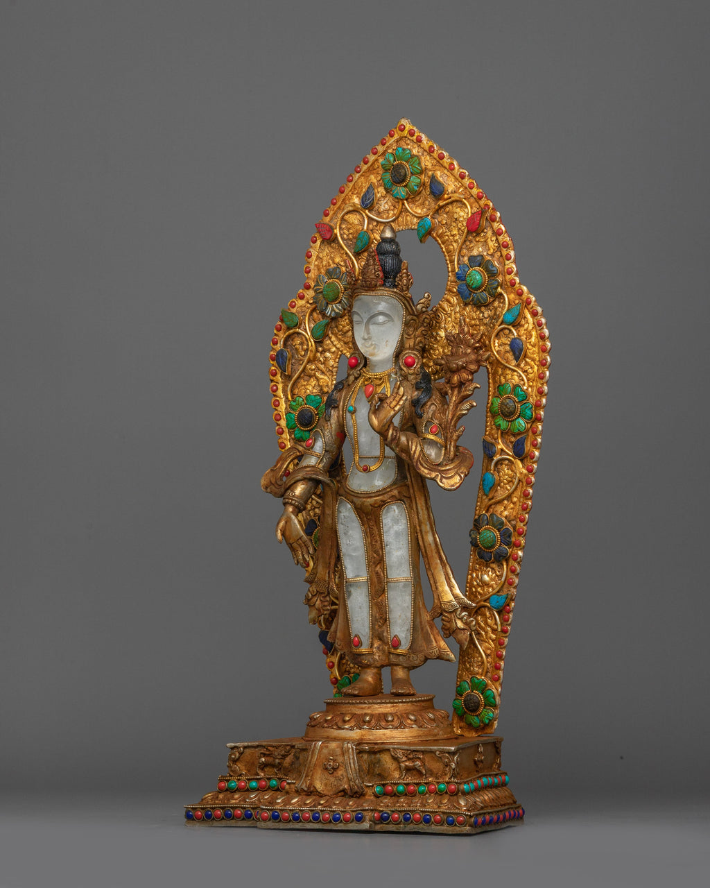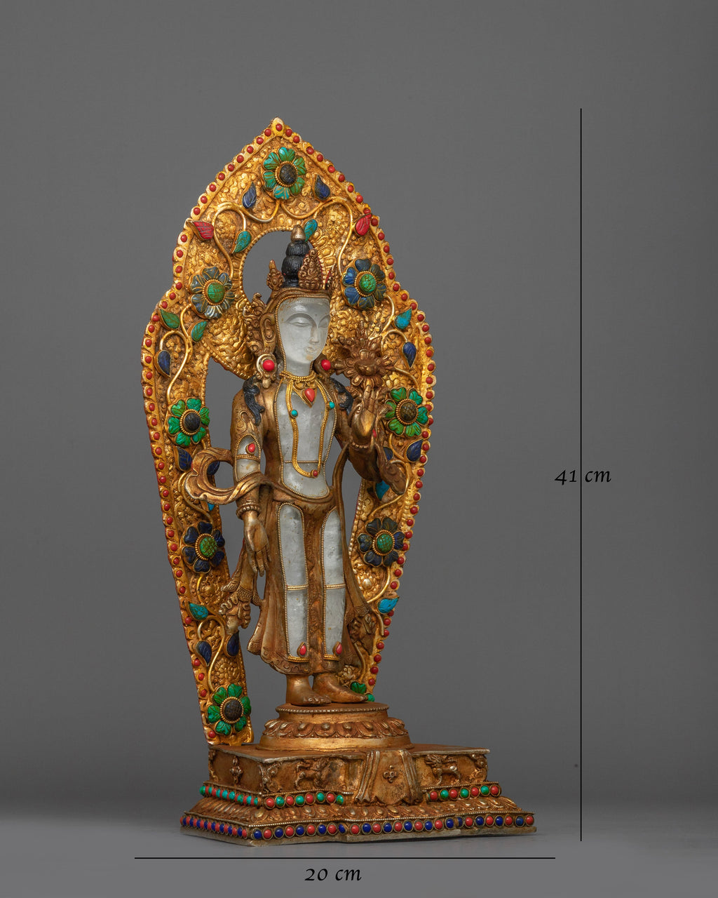 The Sacred Avalokiteshvara Sculpture stands at 16.1 inches (41 cm) in height with a base width of 7.9 inches (20 cm), showcasing a harmonious blend of artistry and spirituality. The statue features a crystal body, gold electroplating, and intricate acrylic paintings that enhance its divine beauty. Hand-carved gemstones further enrich the design, symbolizing purity and compassion.