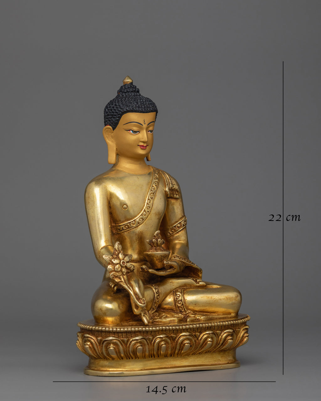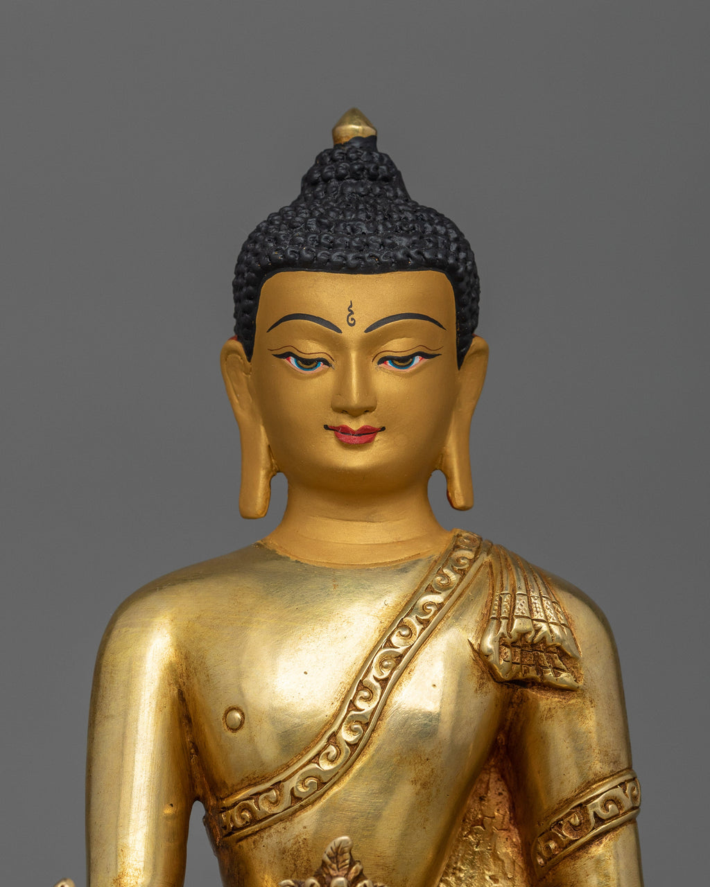 This Sacred Bhaisajyaguru Figurine, also known as the Medicine Buddha, represents healing, compassion, and alleviation of suffering in Tibetan Buddhism. This handcrafted statue, which measures 8.7" (Height) x 5.7" (Base) and weighs 1.48 kg, is made of solid copper, adorned with 24K gold gilding, and enhanced with gold and acrylic paints. This sacred sculpture, created by talented Nepalese artisans, embodies the rich traditions of Himalayan Buddhism, making it an inspiring addition to altars, meditation places, or sacred collections.