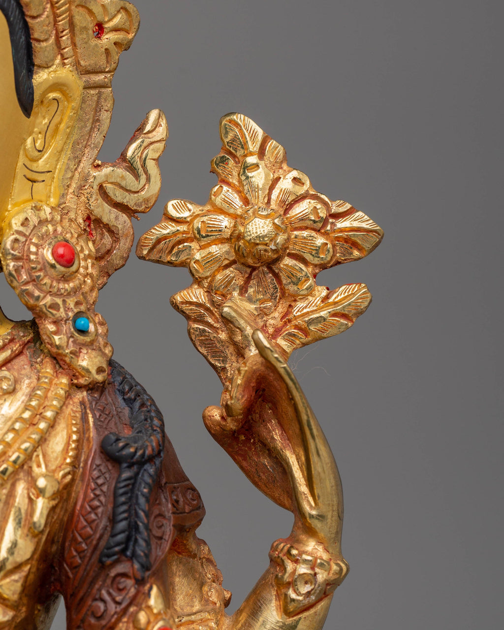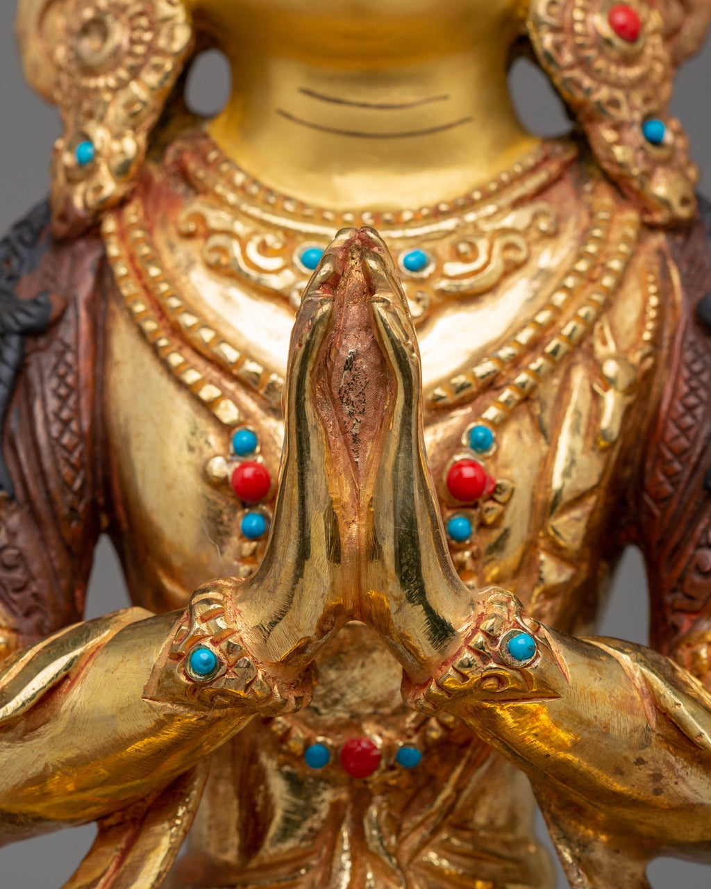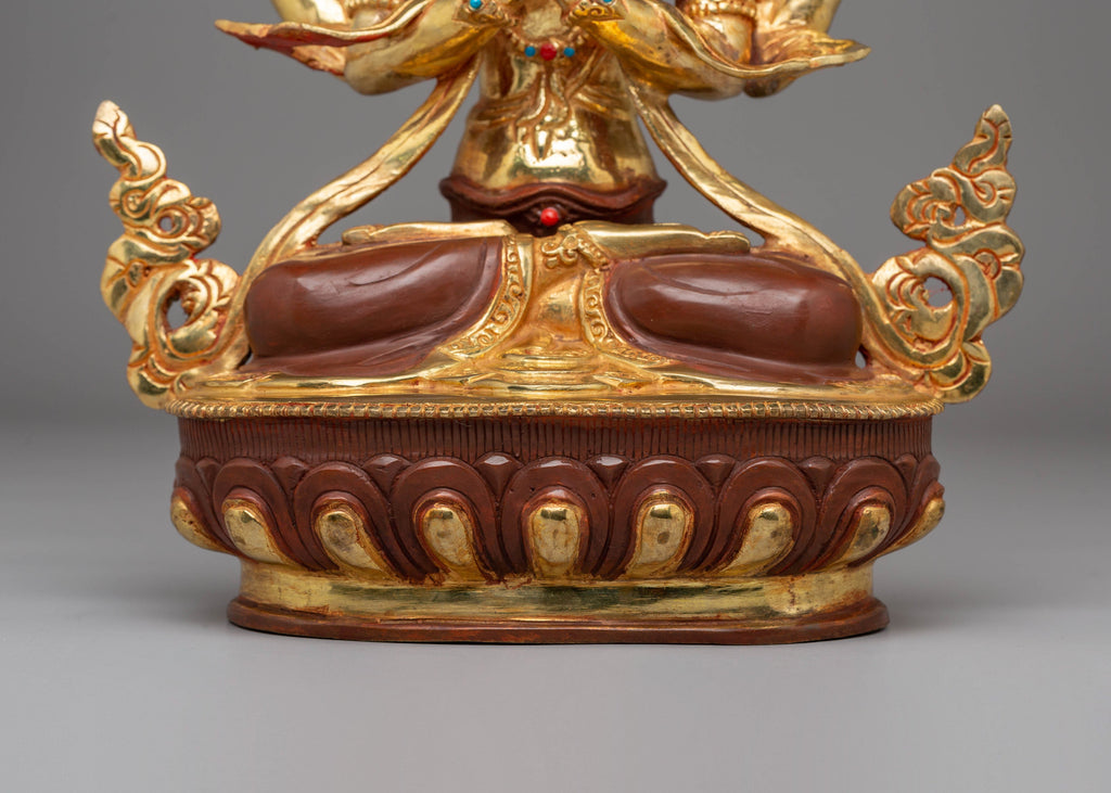 This statue depicts Chenrezig, the Bodhisattva of Compassion, a revered figure in Tibetan Buddhism known for embodying infinite mercy and wisdom. The intricate design, including the coral and turquoise stones, symbolizes purity and divine protection, enhancing the statue's spiritual power. The gold-plated finish adds a radiant glow, representing the enlightenment and compassion that Chenrezig imparts to all who seek his blessings.