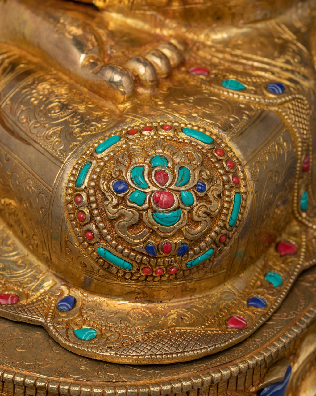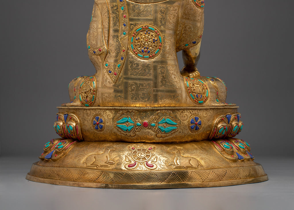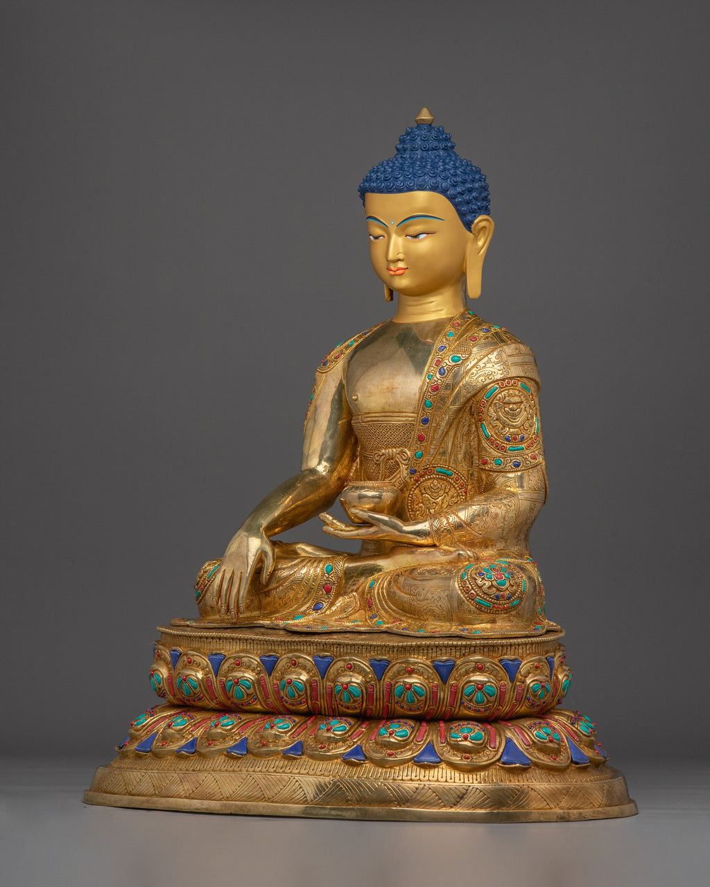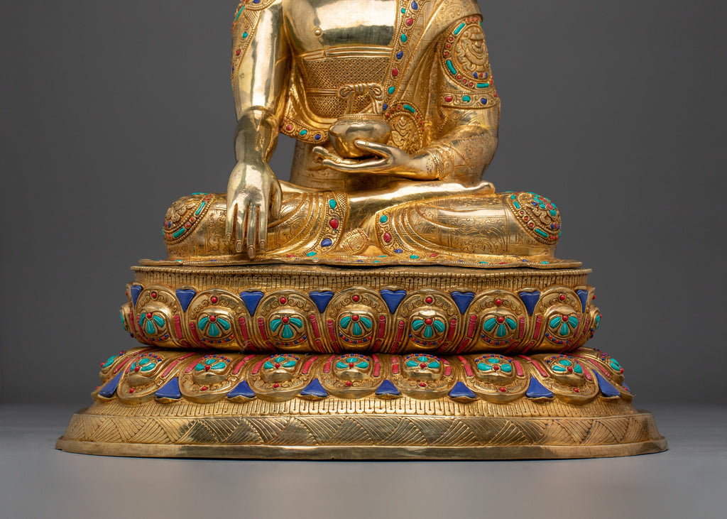 The Sacred Buddha Shakyamuni Statue is expertly handcrafted from copper and adorned with 24K gold gilding, detailed gold and acrylic paintings, and gemstones that enhance its sacred beauty. Measuring 21.1”/53.5cm in height and 19.3”/49cm at the base, it weighs 15.50 kg. Representing the historical Buddha and the embodiment of enlightenment, this statue radiates wisdom, peace, and spiritual presence, making it a powerful centerpiece for temples, altars, or meditation halls.
