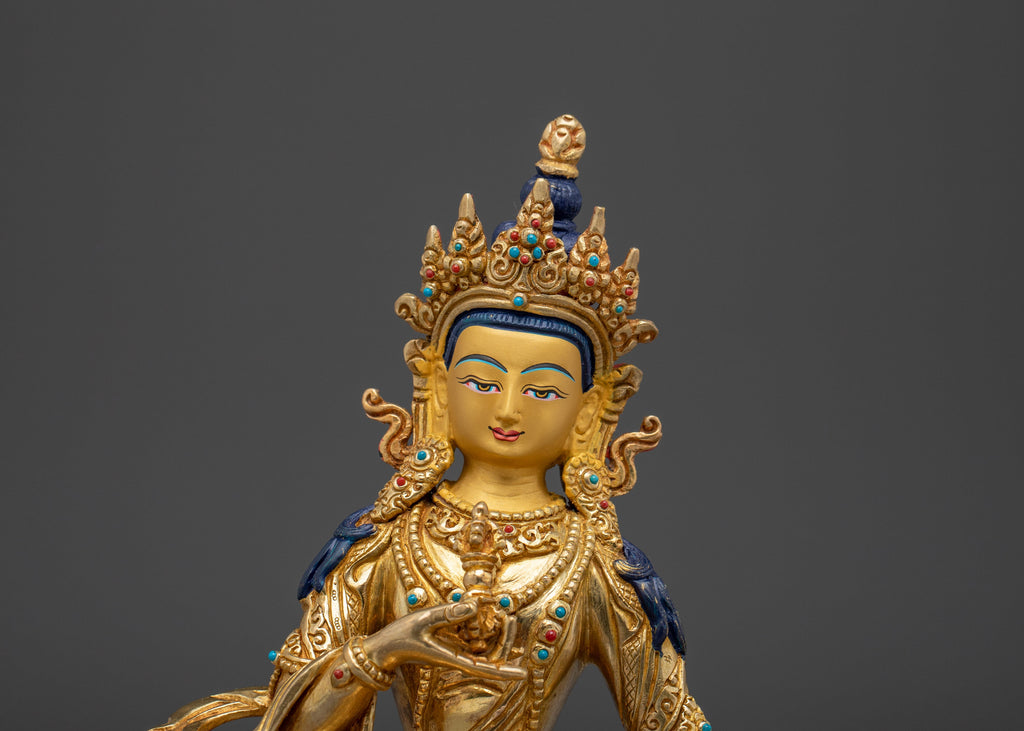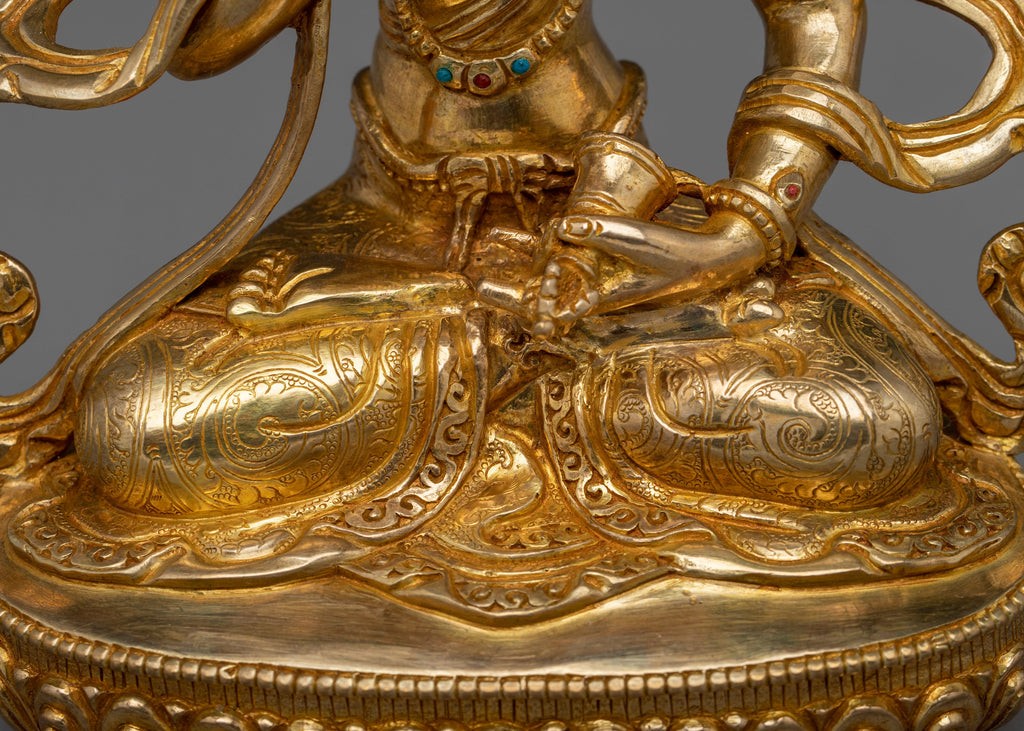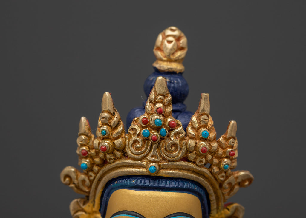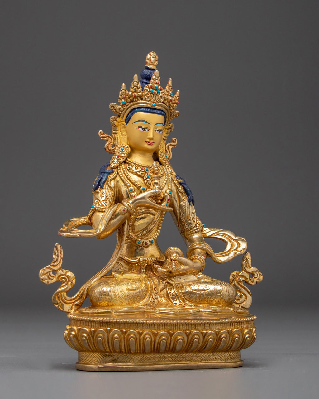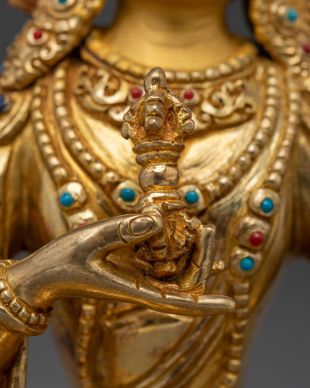Vajrasattva, a major figure in Vajrayana Buddhism, is known as the deity of purification. His appearance in the shape of this statue indicates his capacity to wash the mind, body, and spirit, removing barriers and encouraging spiritual growth. The gold-plated finish represents his divine presence, while the turquoise and coral inlays symbolize additional protection, healing, and vigor. These symbolic aspects make this statue an effective instrument for meditation, prayer, and spiritual practice, promoting clarity, calm, and good transformation.