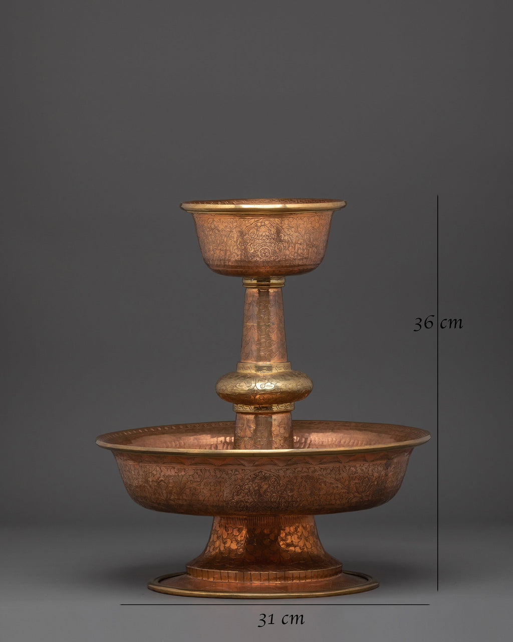 This offering set, which is 36cm tall, 31cm wide, and weighs 3.24kg, exemplifies Tibetan craftsmanship. The copper body is meticulously carved and polished, evoking both cultural significance and spiritual meaning. The serkyem set, when used in puja ceremonies, everyday prayers, or special rituals, not only boosts offerings, but also adds spiritual presence and harmony to the surrounding atmosphere. This Sacred Buddhist Serkyem Offering Set is great for practitioners, collectors of Buddhist ritualware, or anybody looking to deepen their spiritual practice. As an altar centerpiece, it symbolizes devotion, charity, and a link to Tibetan Buddhist traditions. This copper serkyem offering set, ideal for ritual or spiritual decor, combines religious meaning with handcrafted elegance.