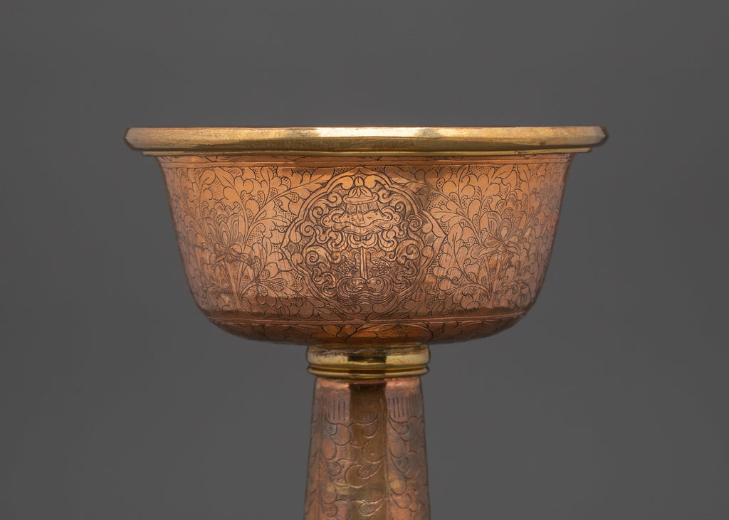 The Serkyem, a sacred offering vessel, is deeply embedded in Tibetan Buddhist rituals, representing both reverence and devotion. Used in ceremonies to offer drinks such as tea or butter to the divine, the Serkyem symbolizes purity and spiritual connection. Its ornate design, often adorned with gold and silver, reflects the profound respect given to these sacred acts. As the Serkyem is placed on an altar or offered during prayers, it serves as a reminder of the importance of generosity, gratitude, and the bond between the material and spiritual worlds. Each offering made with the Serkyem is an act of devotion, a step toward cultivating inner peace and aligning with the teachings of Buddhism.