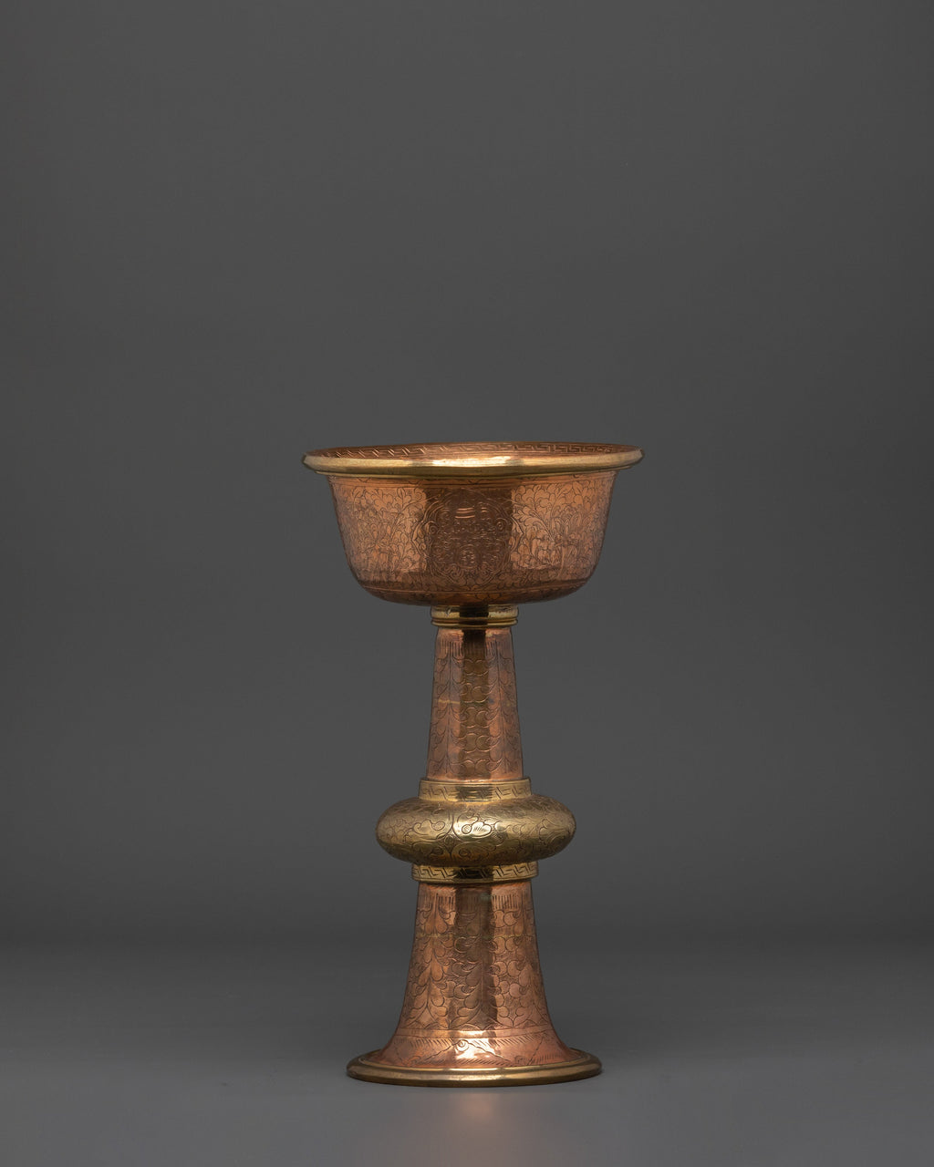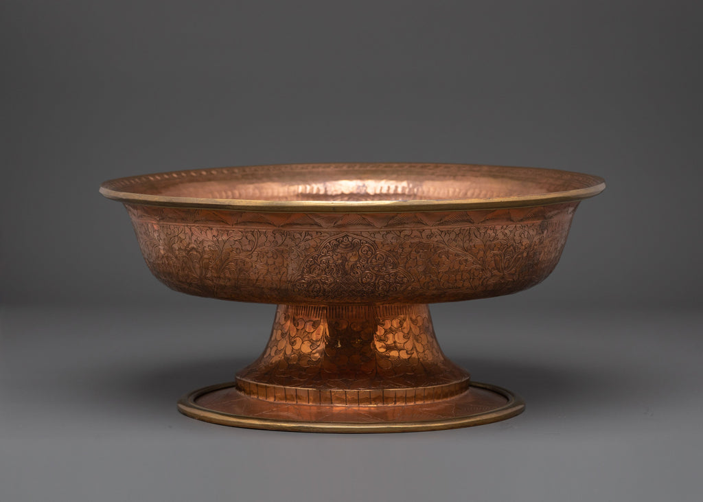 This sacred Buddhist Serkyem Offering Set will add true Himalayan creativity and spiritual depth to your divine place. The serkyem set, which has traditionally been utilized in Tibetan Buddhist rituals, is a symbolic vessel for presenting liquor or other sacred substances to enlightened beings and dharma guardians. This handcrafted copper set exudes commitment and respect, making it an important complement to any altar or meditation practice.