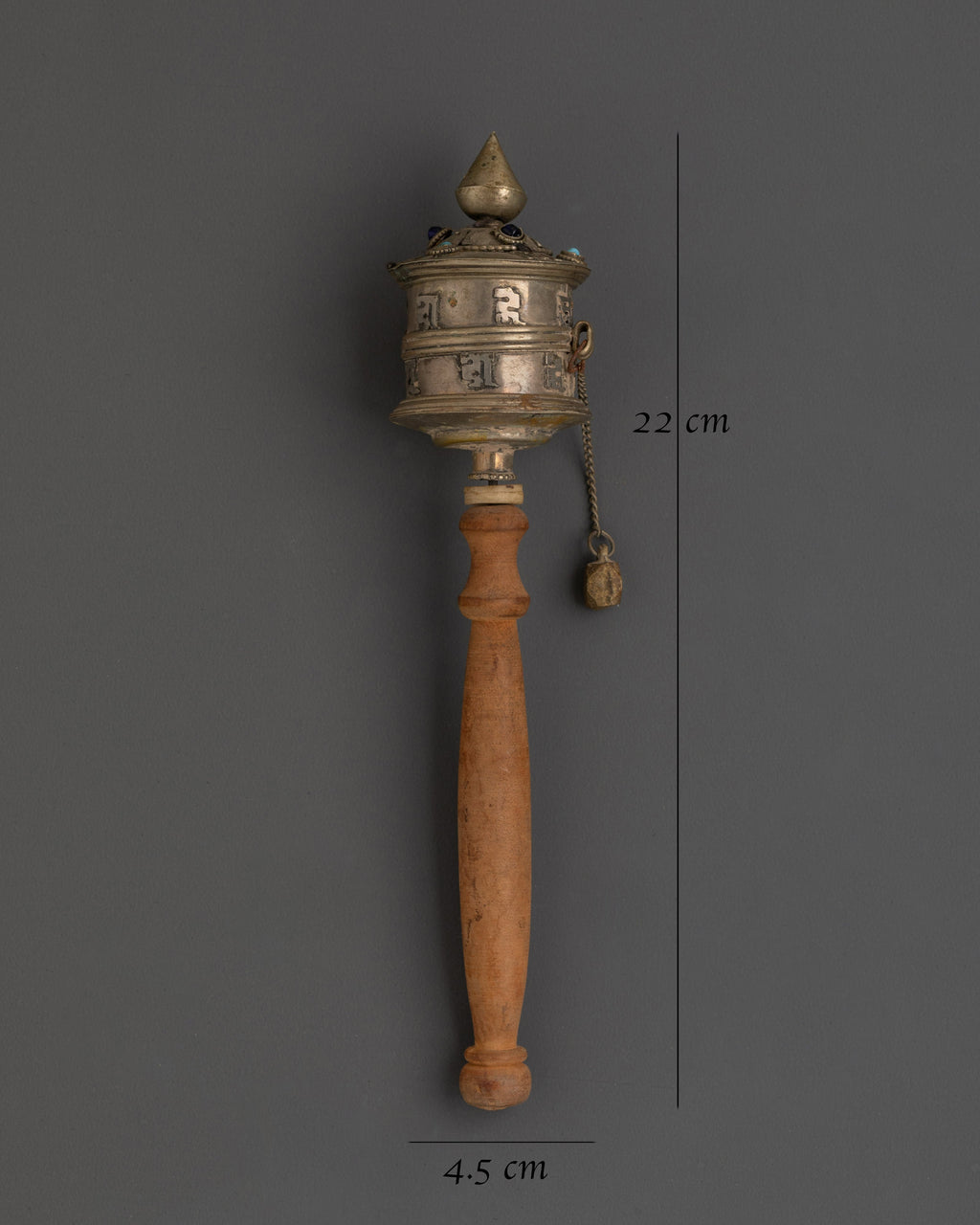 This beautifully designed Buddhist prayer wheel blends spiritual tradition with artistic craftsmanship. Standing 22 cm tall and 4.5 cm wide, it features a finely detailed white metal wheel accented with artificial turquoise stones. The wooden handle provides a comfortable grip, making it ideal for meditation and ritual use. More than just a decorative item, this prayer wheel is a powerful spiritual tool that supports mantra recitation and the invocation of blessings during Buddhist ceremonies. Whether you are an experienced practitioner or new to the practice, it enhances your meditation journey.