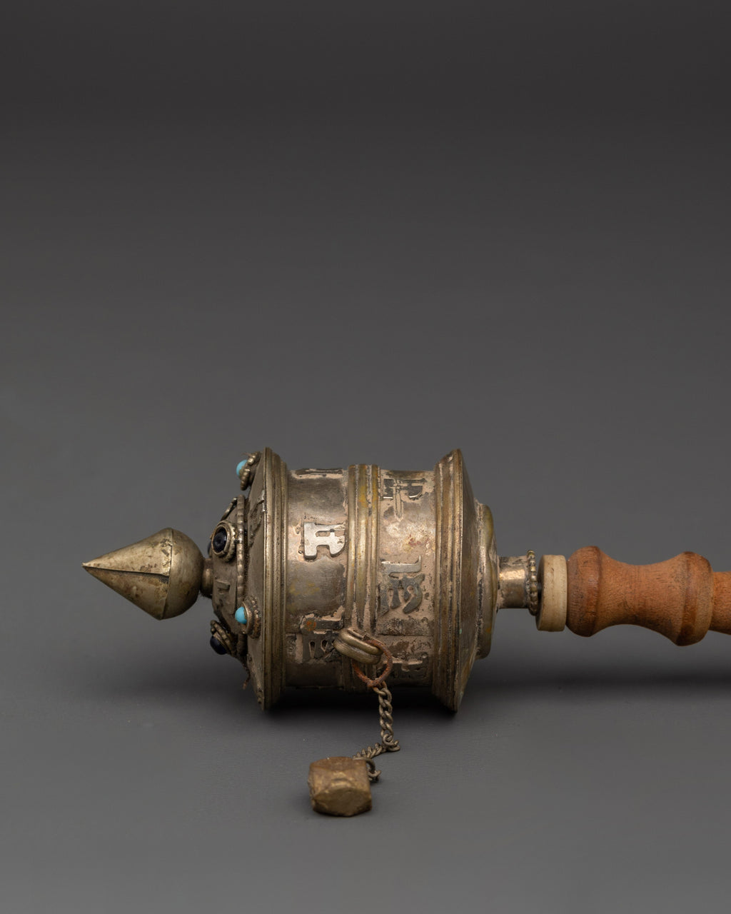 This prayer wheel is carefully crafted using traditional methods to preserve its authenticity and spiritual power. Featuring a natural wooden handle, a metal casing, and turquoise stones, it symbolizes protection and spiritual growth. Serving as a reminder of the interconnectedness of all beings, it helps cultivate good karma, peace, and well-being. An essential addition to any Buddhist altar or personal meditation space, this prayer wheel supports your spiritual journey with meaningful presence.
