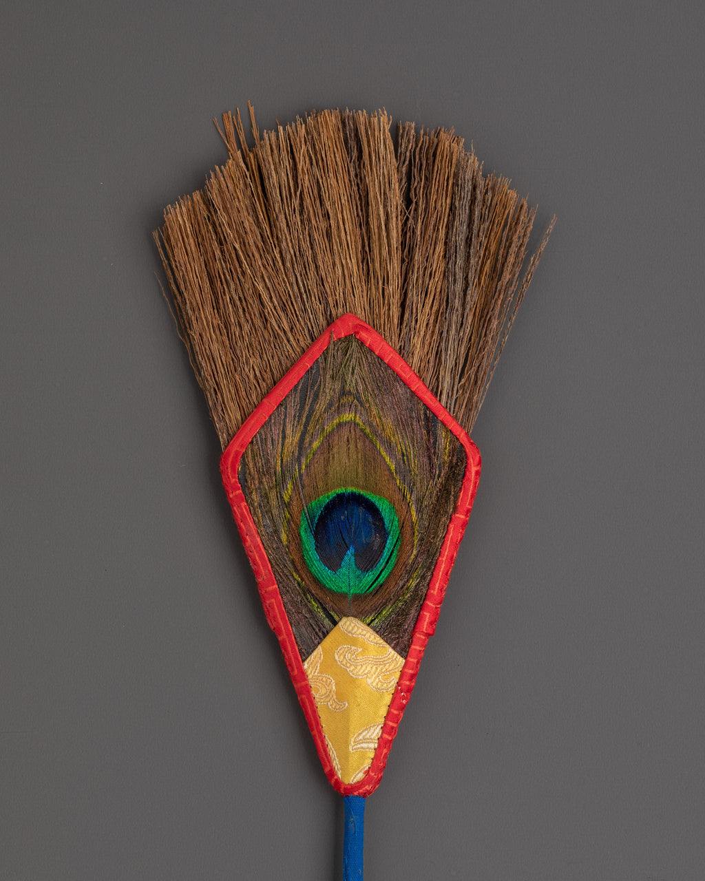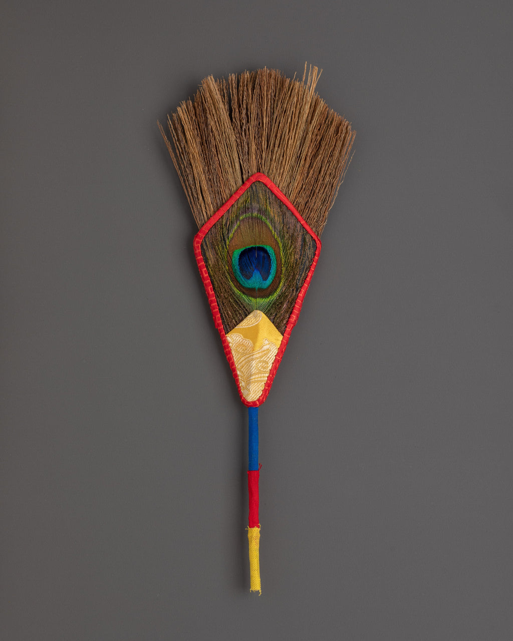 This ritual broom, made with care, combines bast fiber with a stunning peacock feather centerpiece, which is widely adored in Buddhist tradition as a symbol of compassion, vision, and divine protection. Its lightweight construction allows for simple handling during ceremonial use, while the bold, elaborate wrapping adds to the authentic and traditional atmosphere of your spiritual practice.