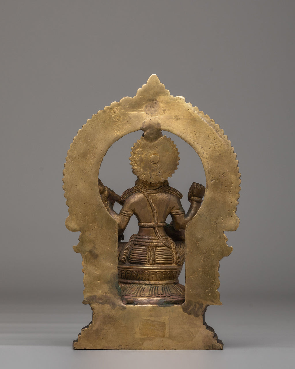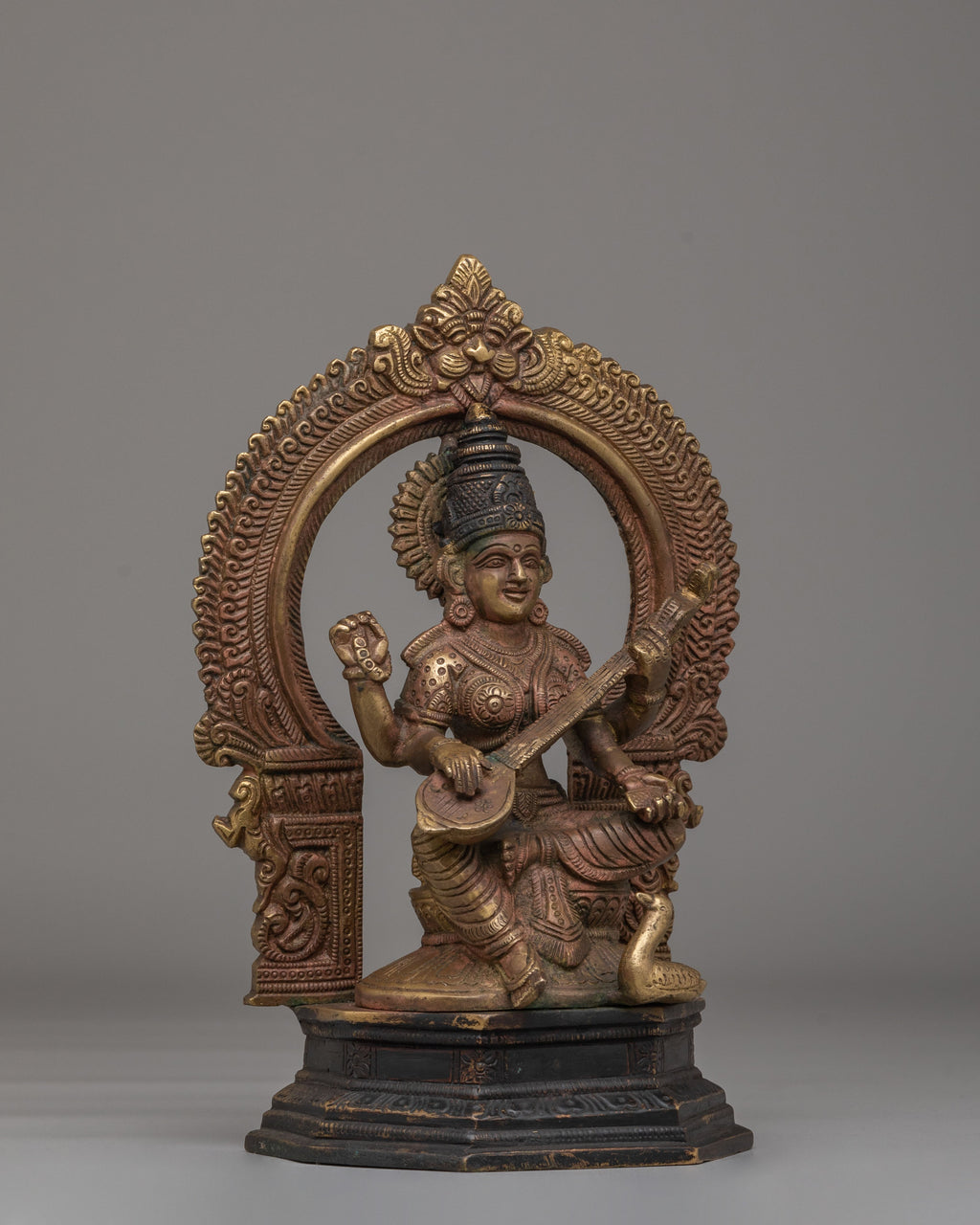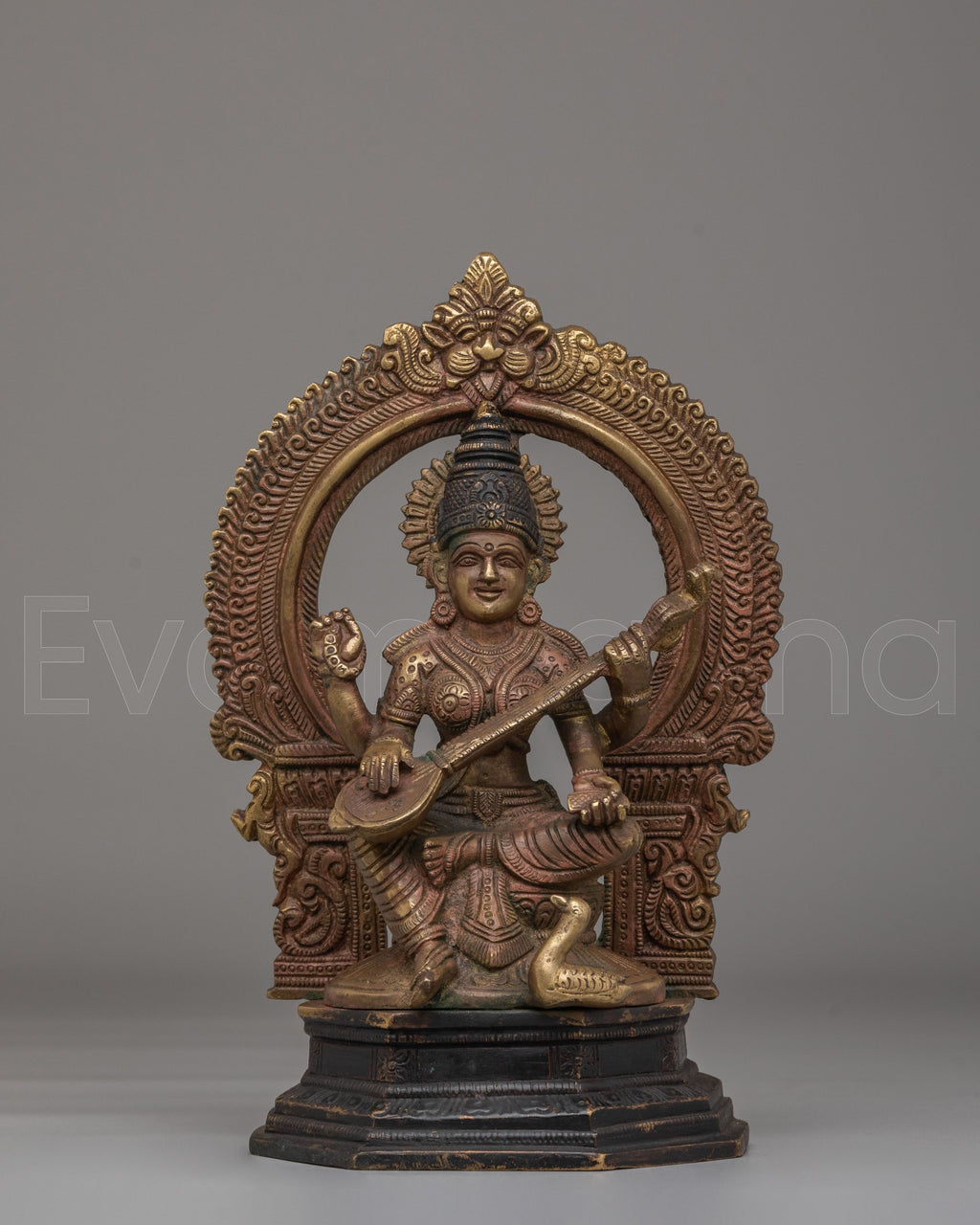 The statue depicts Saraswati seated gracefully, her right leg extended on a lotus base that features a swan, symbolizing purity and discernment. She holds a vina in both hands, representing mastery of music, knowledge, and the arts. She embodies wisdom, creativity, and spiritual refinement, radiating serenity and inspiration.