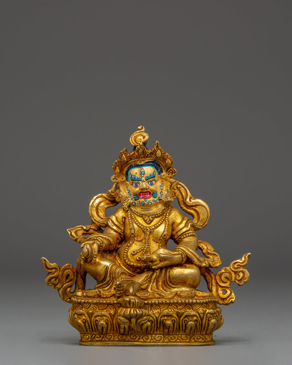 The Dzambala Statue for Abundance is a captivating figure of wealth and prosperity, skillfully crafted from copper and gilded with gold. Standing at 12.5 cm in height and 12.5 cm in width, this detailed statue showcases Dzambala in a dynamic seated pose, radiating both strength and generosity. His fierce expression, with turquoise-like beads adorning his face, is balanced by a golden crown and elaborate flames surrounding him, symbolizing spiritual power and an abundance of wealth. The fine acrylic color highlights the intricate details of the design, enhancing the statue's beauty and charm.