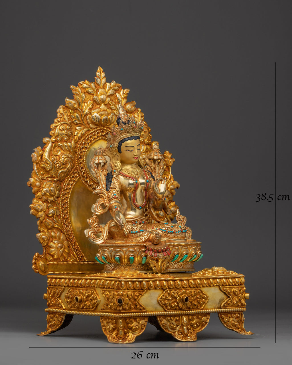 This Sacred Feminine Artwork of Green Tara represents protection, healing, and spiritual enlightenment. This handcrafted statue, which measures 15.2" (Height) x 10.2" (Base) and weighs 4.30 kg, is made of copper and has a durable and spiritual appeal. Crafted by expert artisans, this item symbolizes the rich traditions of Himalayan Buddhism, making it an important addition to altars, meditation places, or holy collections.