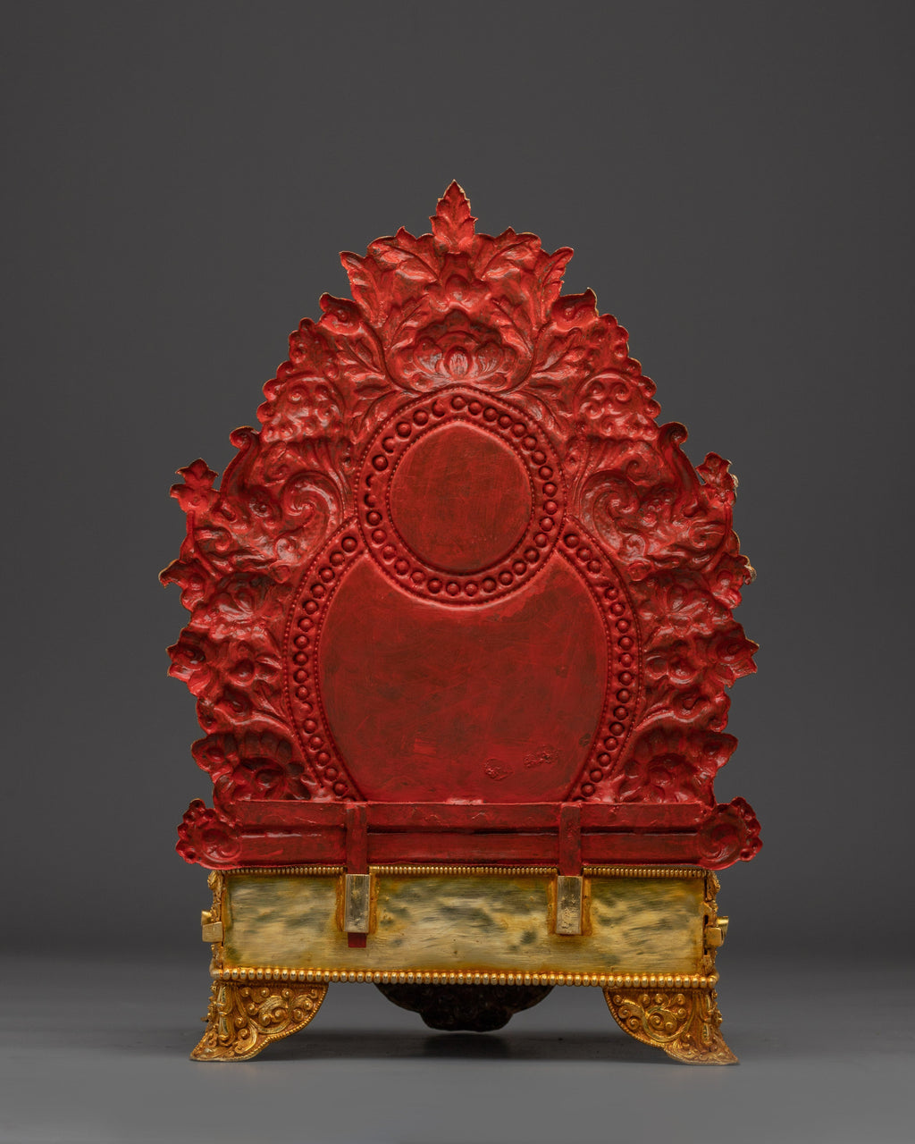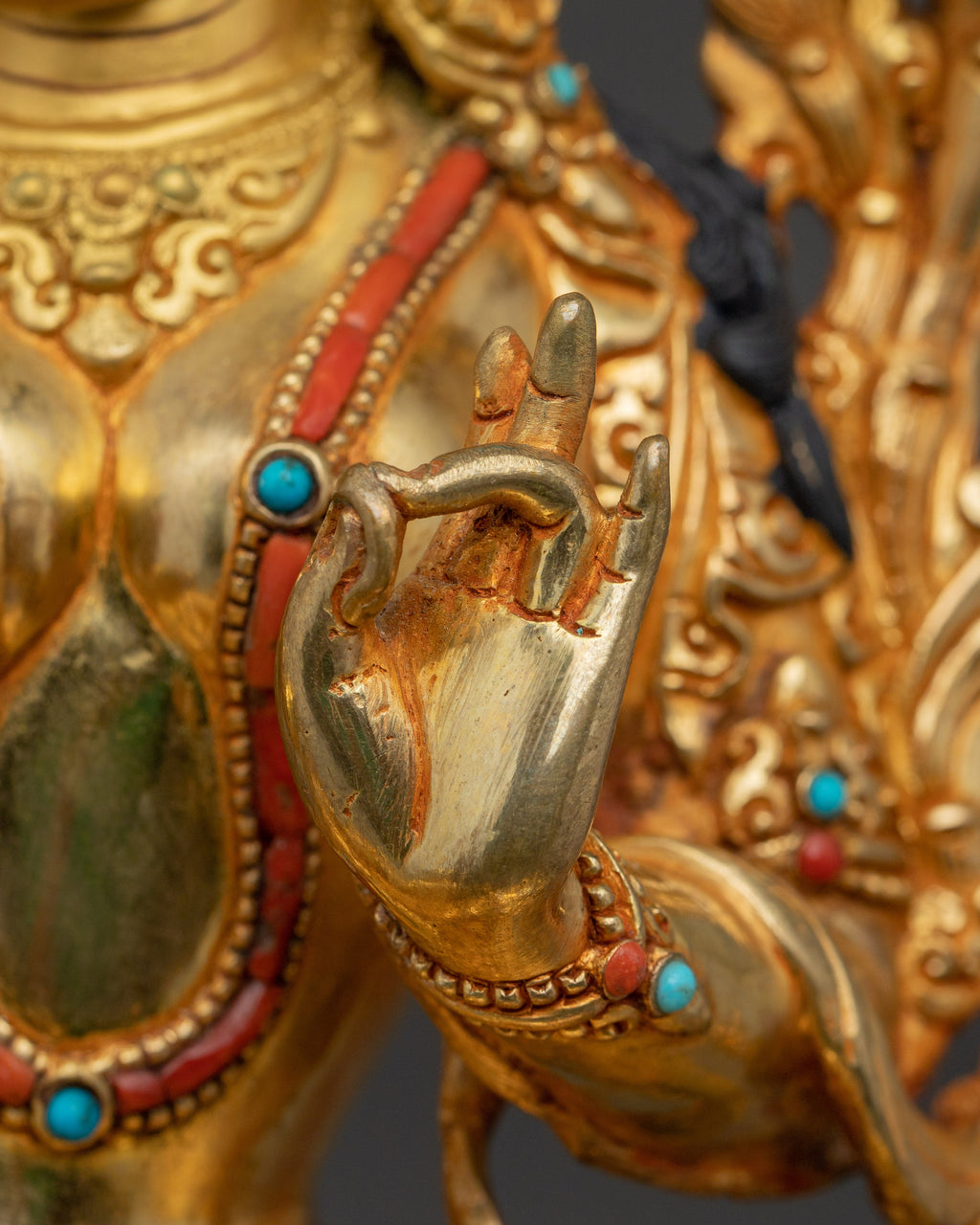 As depicted, Green Tara is shown seated on a lotus throne with her right leg typically extended forward, signifying her active compassion and willingness to help. Her hands express profound meaning through their gestures, the right hand is displayed in the "gesture of giving" (Varada Mudra), symbolizing her boundless generosity and willingness to provide blessings. Meanwhile, her left hand delicately holds a blue lotus (Utpala), a symbol of purity and spiritual awakening, offering protection and reassurance to those who seek her guidance.