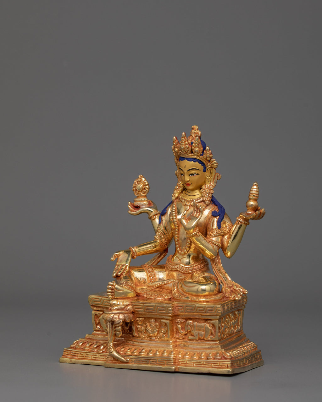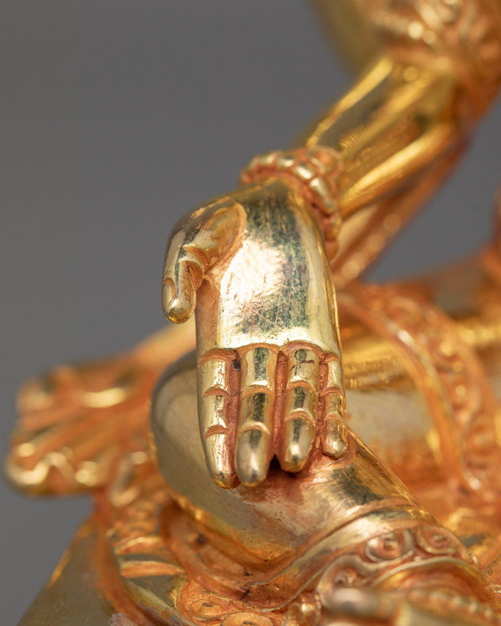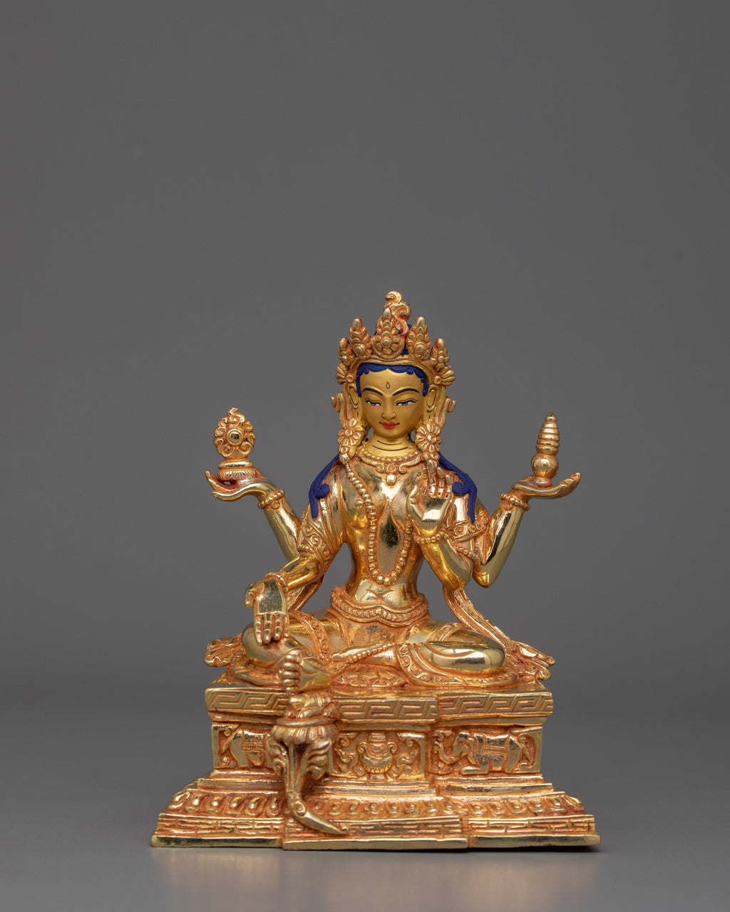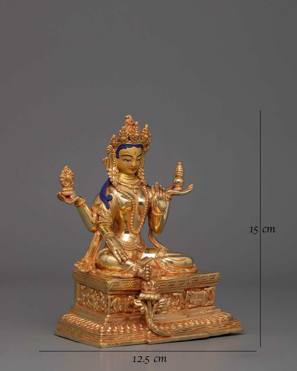 The Sacred Figurine of Divine Goddess Laxmi stands at 5.9”/15 cm in height with a 4.9”/12.5 cm base and weighs 0.83 kg. This statue represents Goddess Laxmi, the Hindu deity of wealth, prosperity, and abundance. The figure is mercury gold plated, gold and acrylic paintings, copper body. Designed by talented Nepalese artisans, this detailed sculpture is ideal for altars, meditation areas, or as a meaningful decor item for individuals seeking awareness in their daily life.