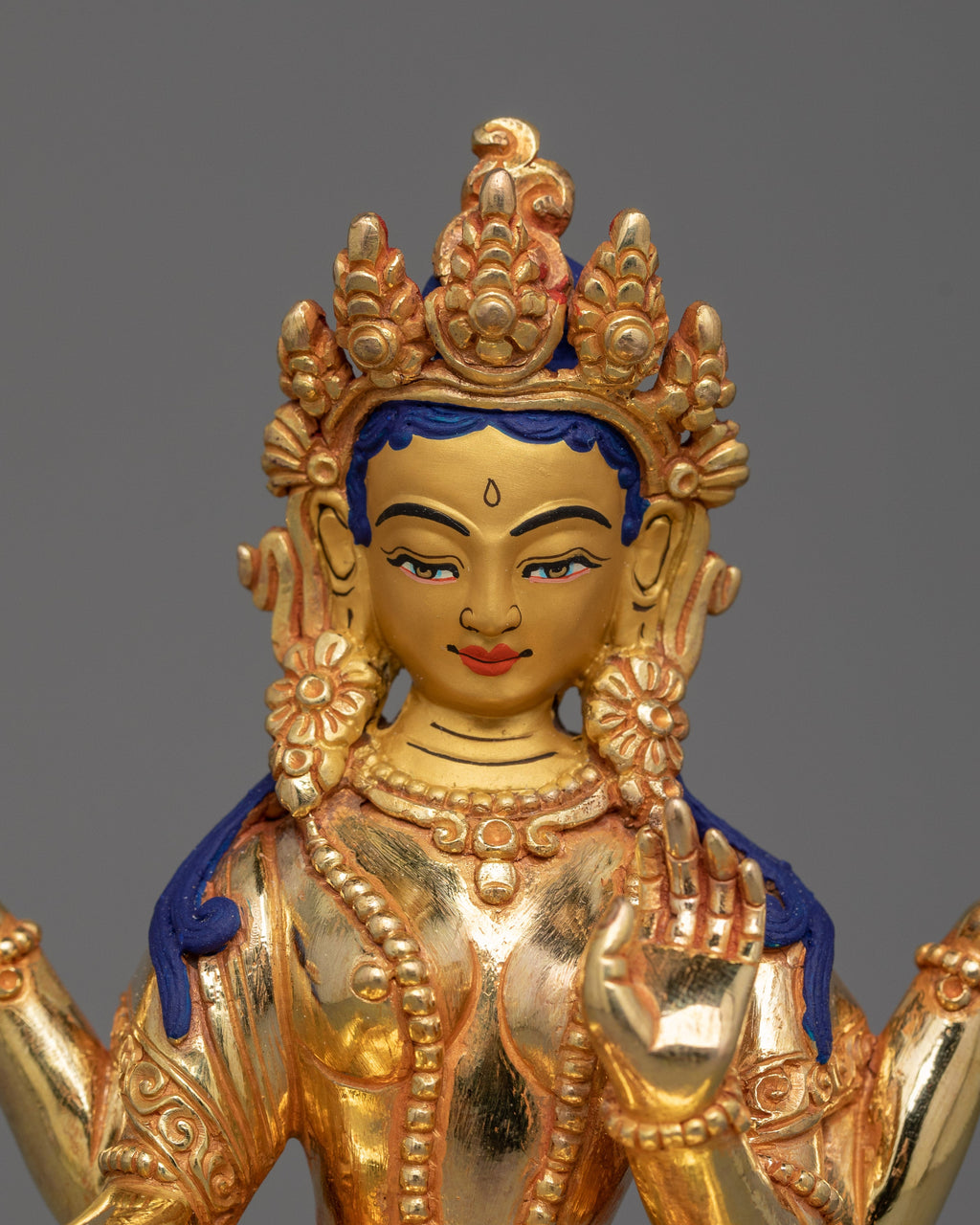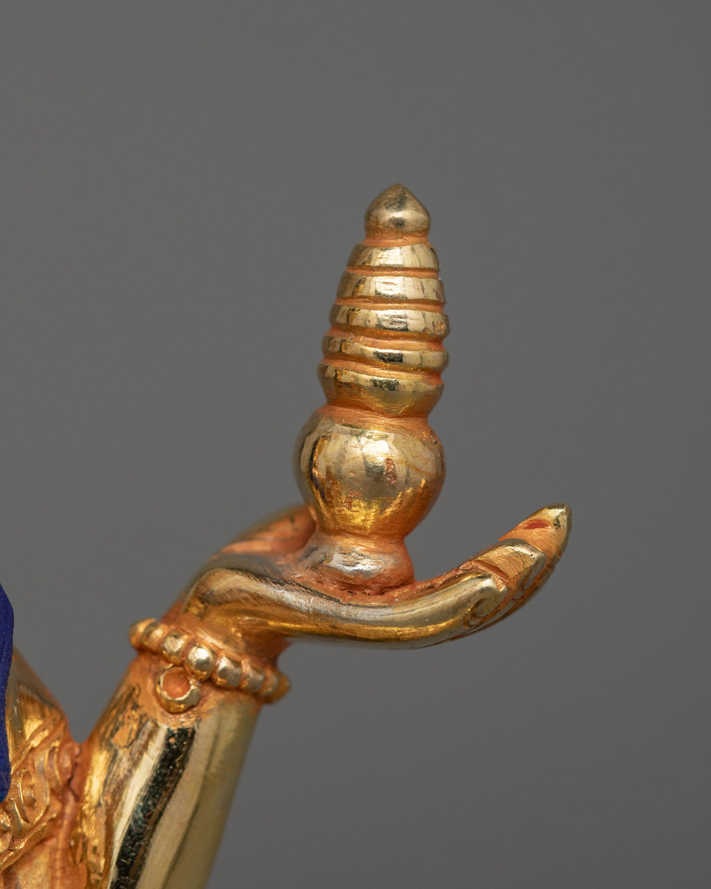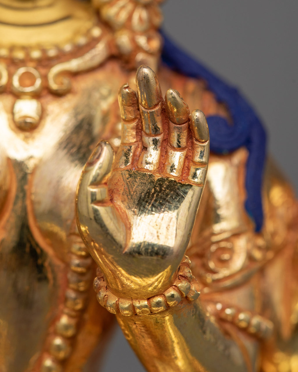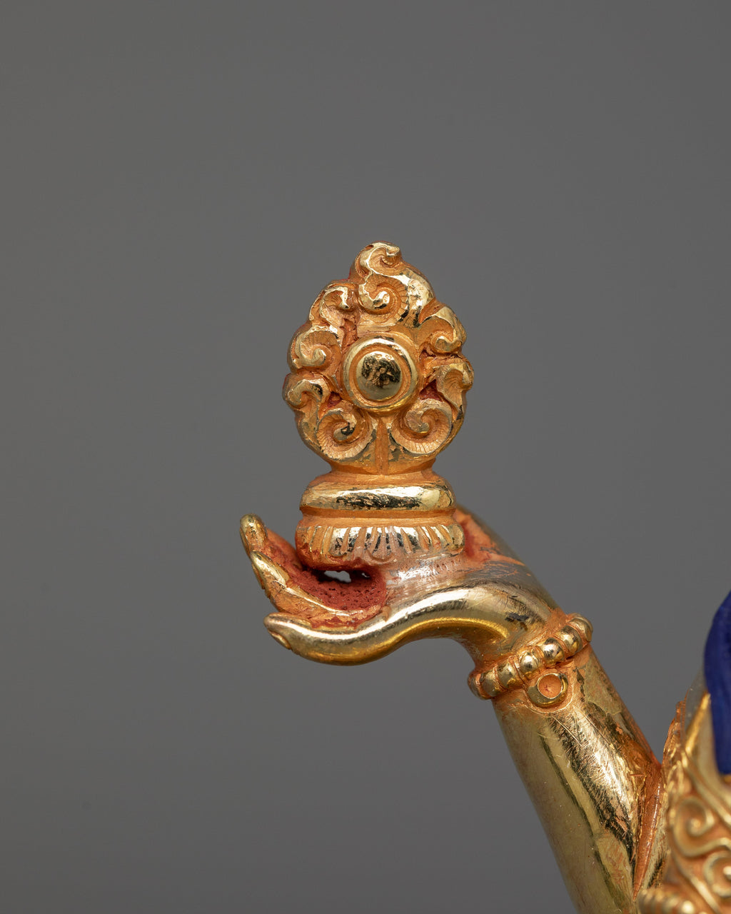 The Sacred Figurine of Divine Goddess Laxmi stands at 5.9”/15 cm in height with a 4.9”/12.5 cm base and weighs 0.83 kg. This statue represents Goddess Laxmi, the Hindu deity of wealth, prosperity, and abundance. The figure is mercury gold plated, gold and acrylic paintings, copper body. Designed by talented Nepalese artisans, this detailed sculpture is ideal for altars, meditation areas, or as a meaningful decor item for individuals seeking awareness in their daily life.