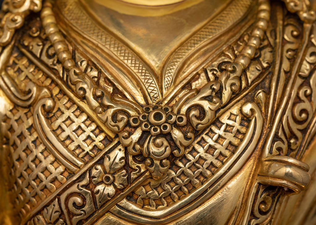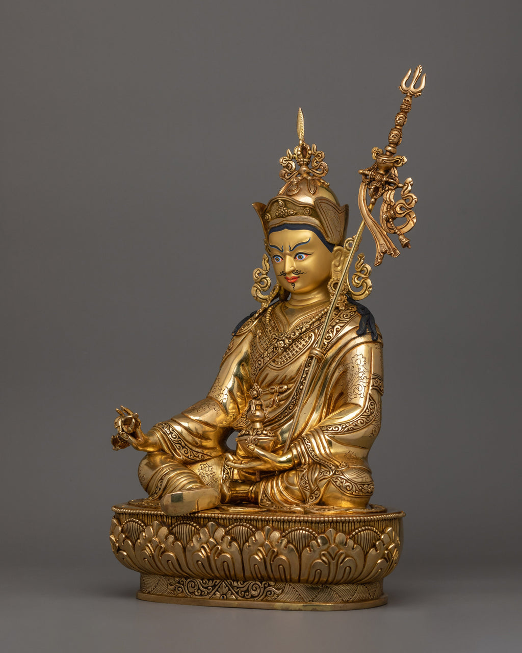 The Sacred Figurine of Lord Padmasambhava stands at 16.1”/41 cm in height with a 9.4”/24 cm base and weighs 4.95 kg. This statue represents Lord Padmasambhava (Guru Rinpoche), the spiritual master who is credited with bringing Buddhism to Tibet. The statue is made of copper, covered with a triple layer of 24K gold gilding, and carved with deeply engraved carvings that produce a magnificent 3D-like effect. This sculpture, handcrafted by expert Nepalese artisans, elegantly symbolizes Himalayan Buddhism's sacred traditions, making it an appropriate addition to altars, meditation places, or sacred collections.