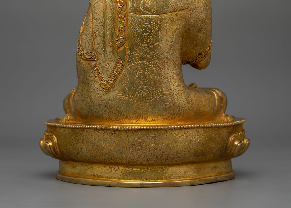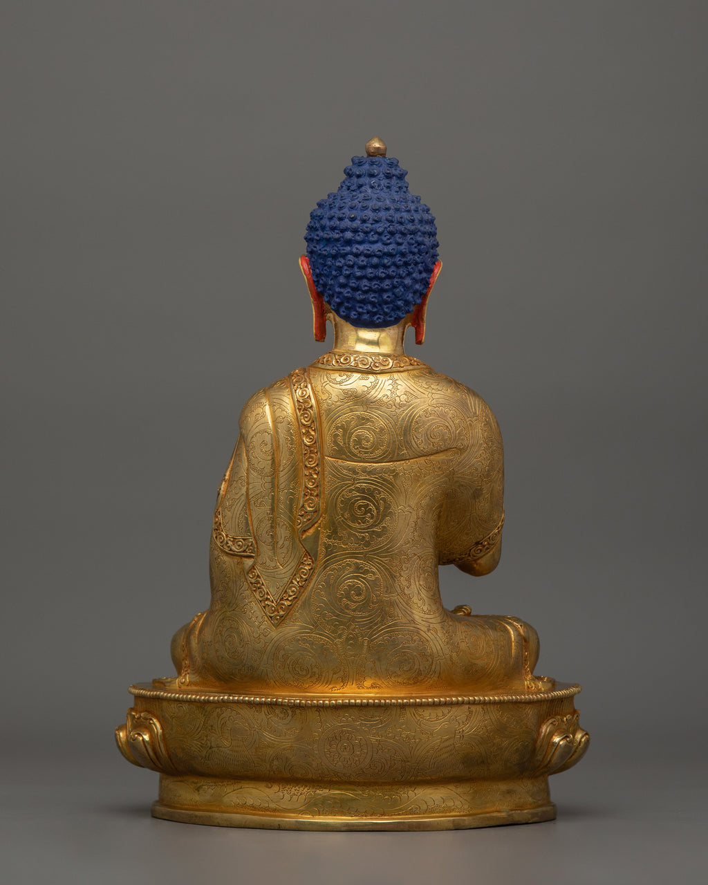 The Figurine of Meditating Buddha Vairocana stands at 12.99”/33 cm in height with a 9.25”/23.5 cm base and weighs 4.33 kg. This statue represents Vairocana, the central figure among the five wisdom Buddhas in Vajrayana Buddhism, embodying the cosmic Buddha of wisdom and the source of all Buddhas. The statue is gilded with 24K gold, gold and acrylic paintings, and a copper body. Designed by talented Nepalese artisans, this detailed sculpture is ideal for altars, meditation areas, or as a meaningful decor item for individuals seeking awareness in their daily life.