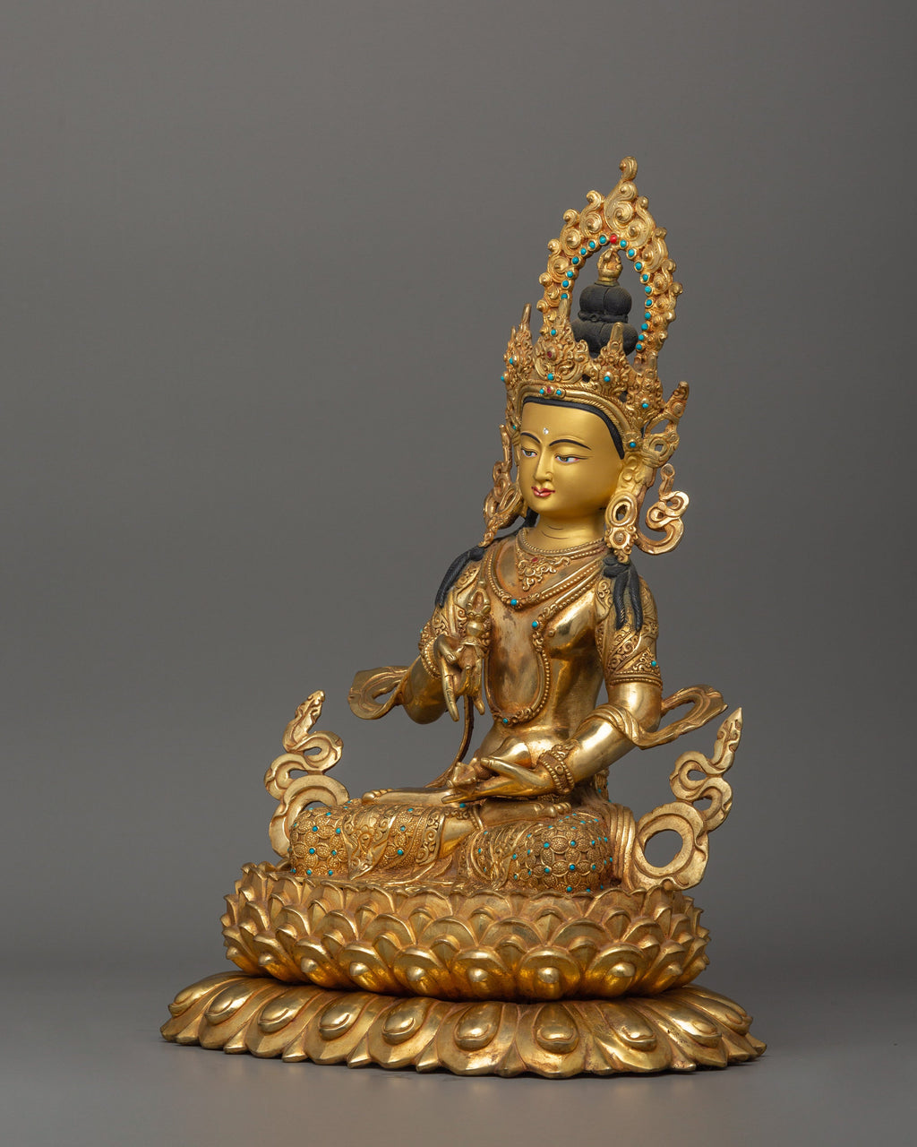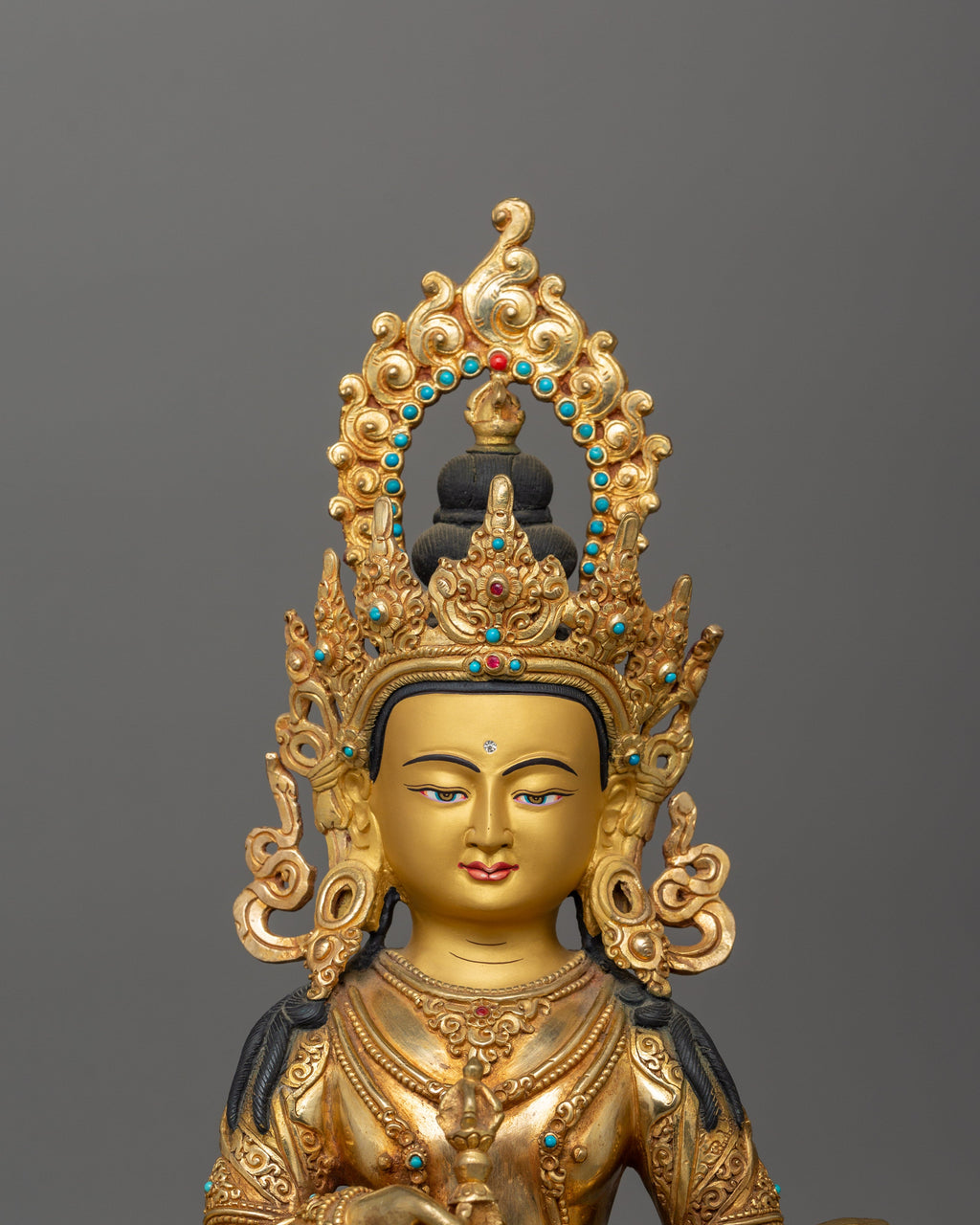 The Sacred Figurine of Purity Deity Vajrasattva stands at 14.2”/36 cm in height with a 10.4”/26.5 cm base and weighs 4.56 kg. This statue represents Vajrasattva, the Bodhisattva of Purification, known for his role in purifying negative karma. The figurine is gilded with 24K gold, gold, and acrylic paintings, and a copper body. Designed by talented Nepalese artisans, this detailed sculpture is ideal for altars, meditation areas, or as a meaningful decor item for individuals seeking awareness in their daily life.