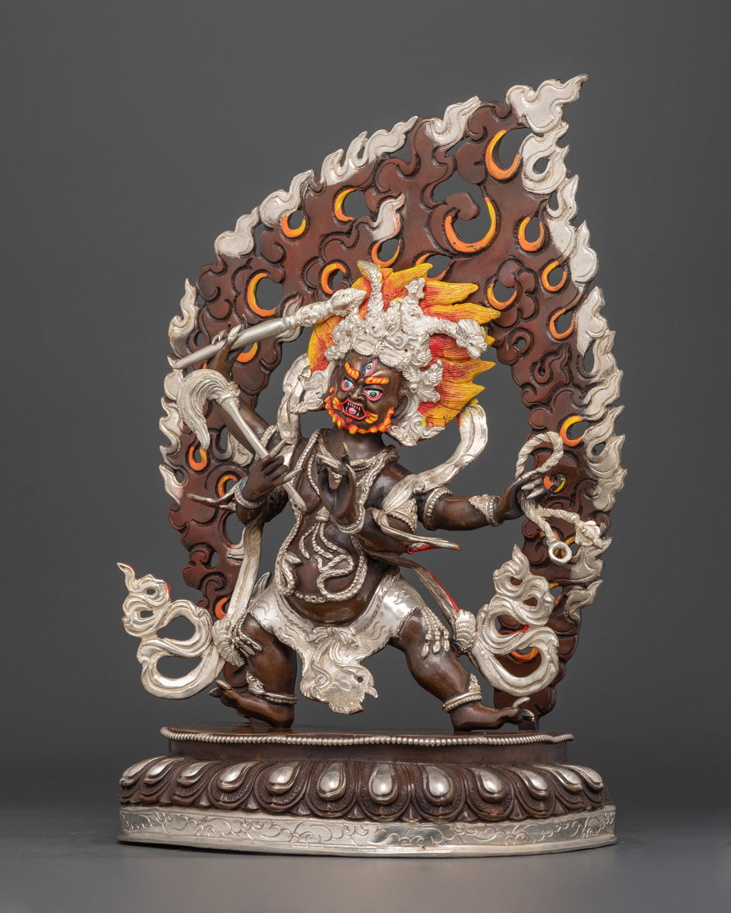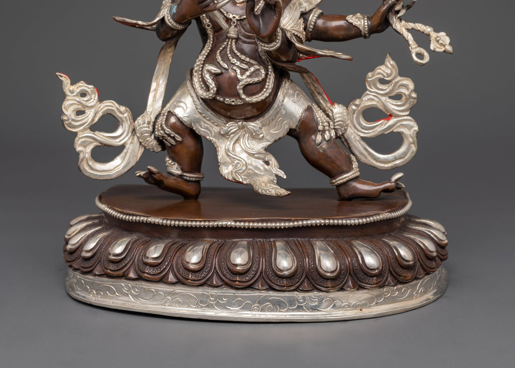 Mahakala, a powerful guardian god in Tibetan Buddhism, is represented with four arms, each carrying symbolic items representing his ability to remove impediments, control harmful forces, and defend the Dharma. His terrifying visage and dynamic stance emanate a powerful force, representing the ferocious compassion that removes impediments to enlightenment.