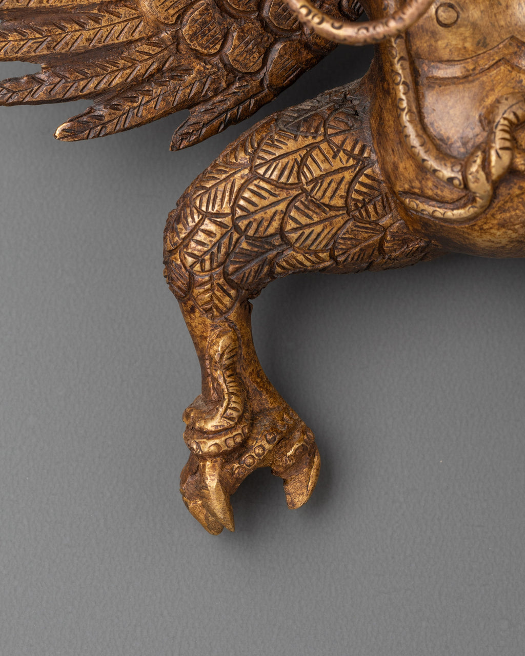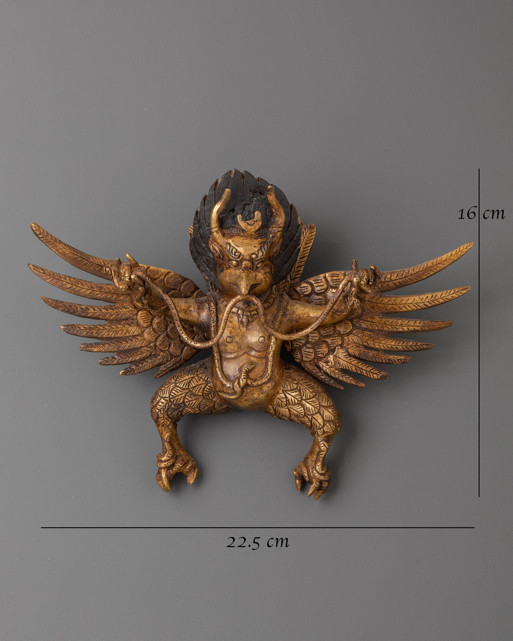 The design captures Garuda mid-flight, wings wide open and claws extended, grasping serpents in each hand — a visual representation of his role as the vanquisher of negative forces. Fine details like the layered feathers, scaled limbs, and expressive facial features highlight traditional craftsmanship and cultural symbolism. The back reveals beautifully textured wings and talons, completing the sculpture’s visual story from all sides.