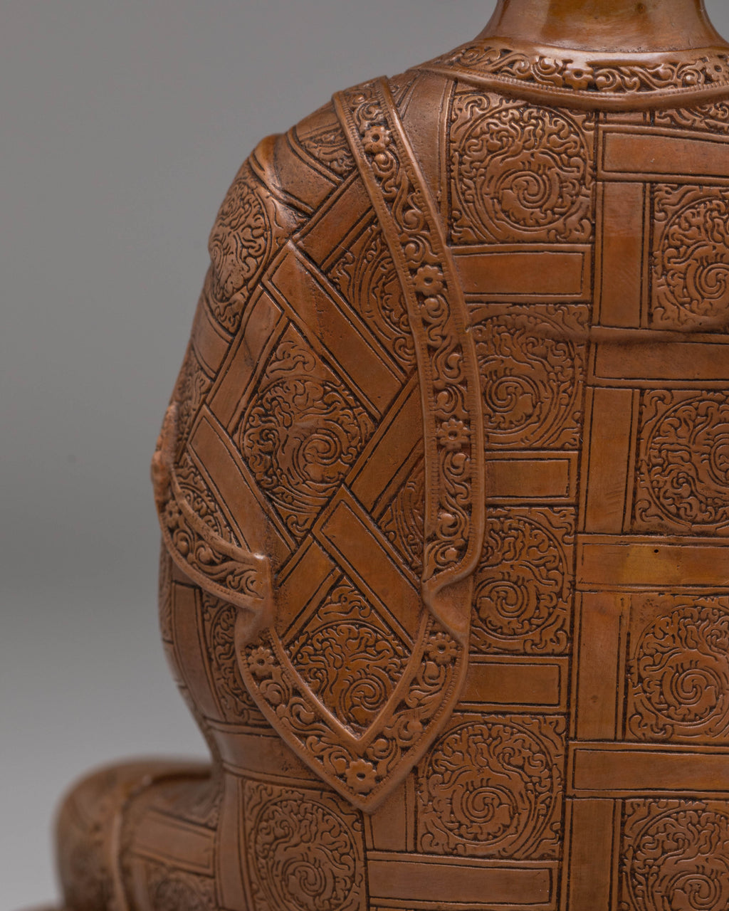 The fine details of the Buddha’s peaceful expression, flowing robes, and seated meditation pose highlight the skill and devotion of the artisan. The oxidized copper surface gives the statue a natural, earthy appearance that complements meditation rooms, prayer areas, or home altars.