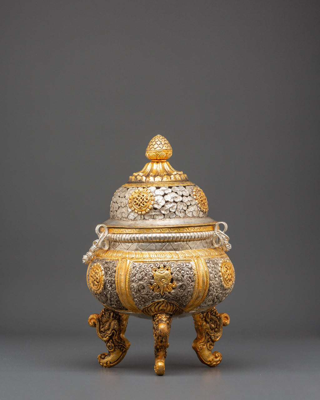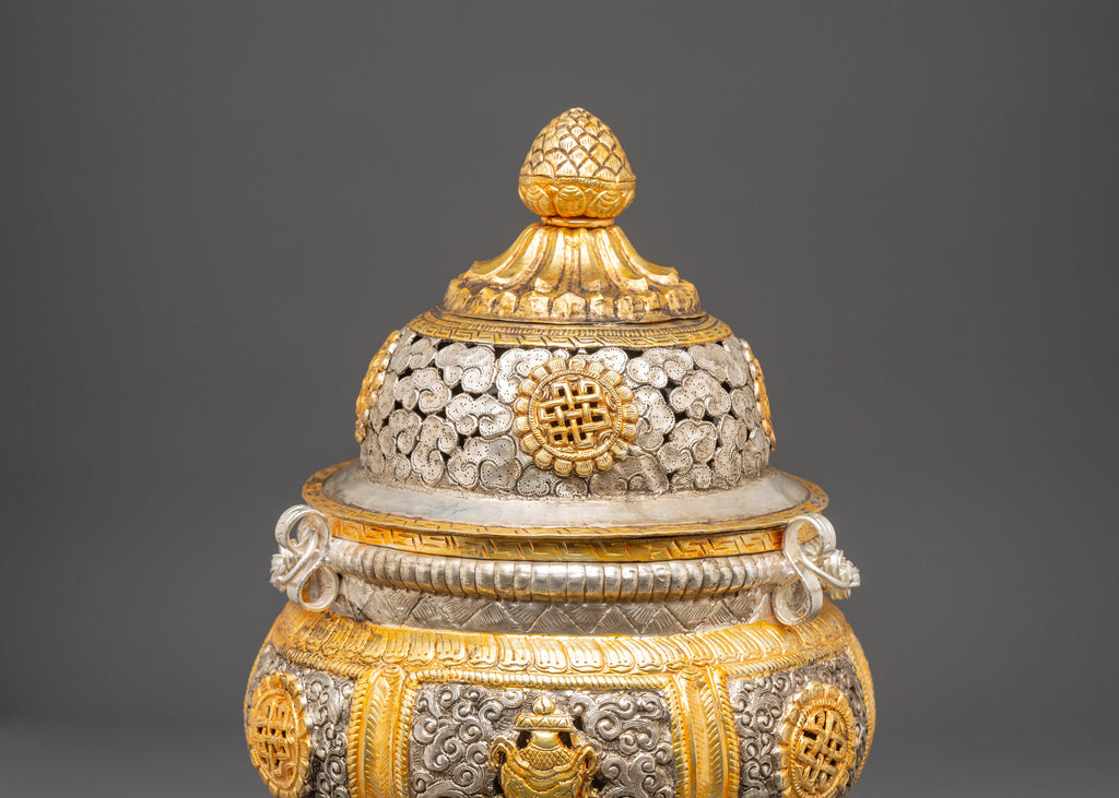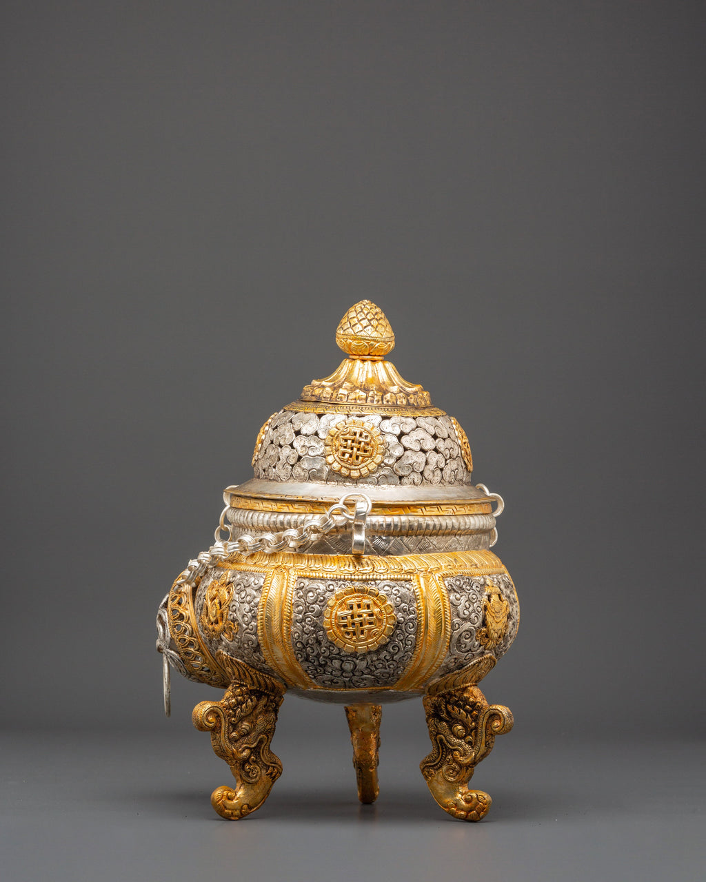 This incense burner is made of copper and plated with gold and silver. It has incredible detailing of auspicious symbols and complex flower designs. Its three lion-shaped legs symbolize protection, while the etched unending knots and lotus motifs represent purity, compassion, and all beings' connectivity. The removable lid and chain design allow the burner to be suspended, allowing fragrant incense smoke to rise and fill the surrounding area with a sense of purification.