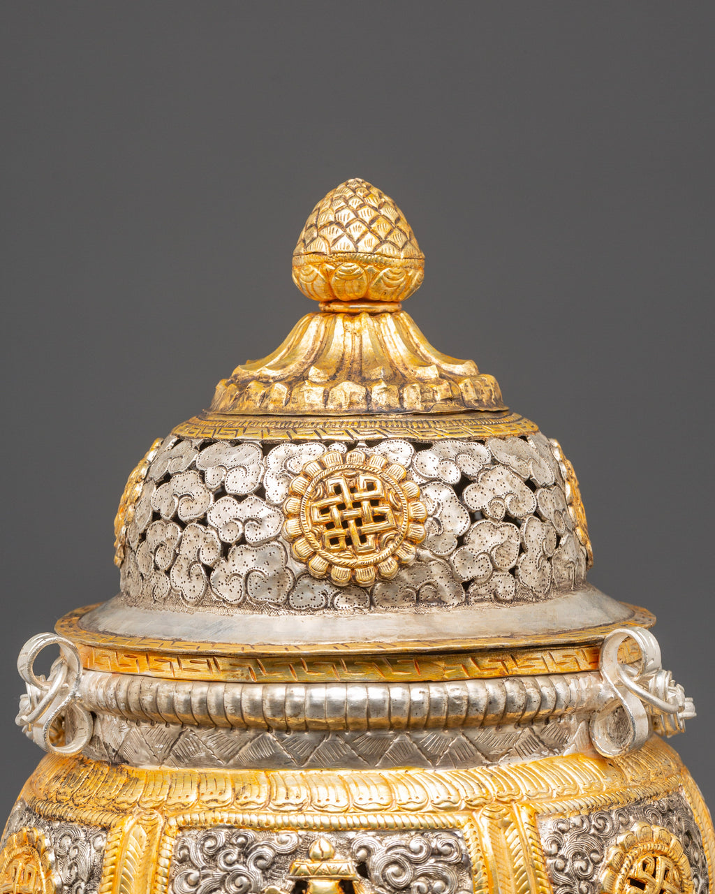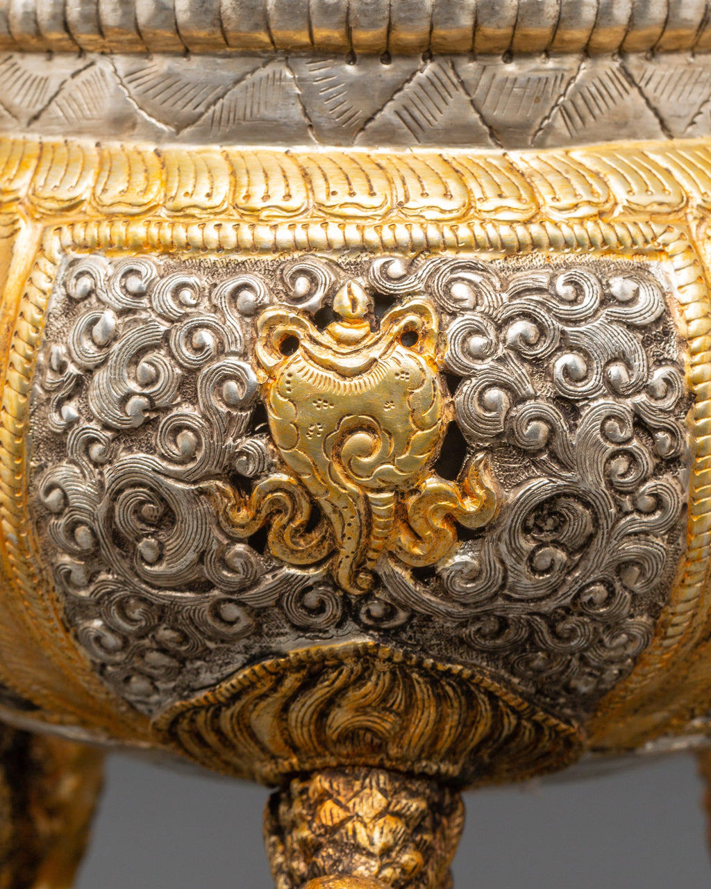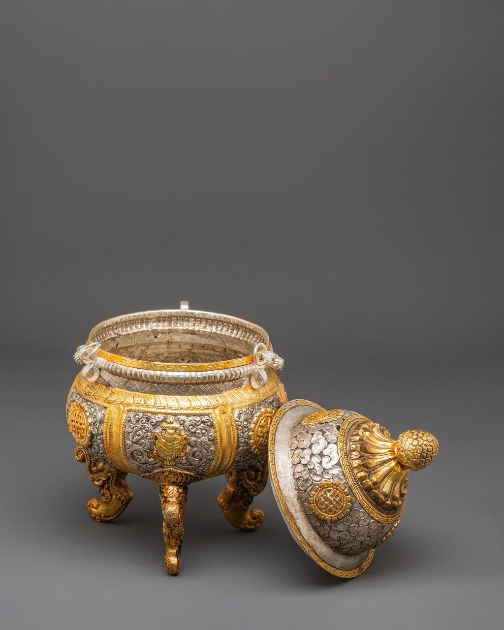 This incense burner is made of copper and plated with gold and silver. It has incredible detailing of auspicious symbols and complex flower designs. Its three lion-shaped legs symbolize protection, while the etched unending knots and lotus motifs represent purity, compassion, and all beings' connectivity. The removable lid and chain design allow the burner to be suspended, allowing fragrant incense smoke to rise and fill the surrounding area with a sense of purification.