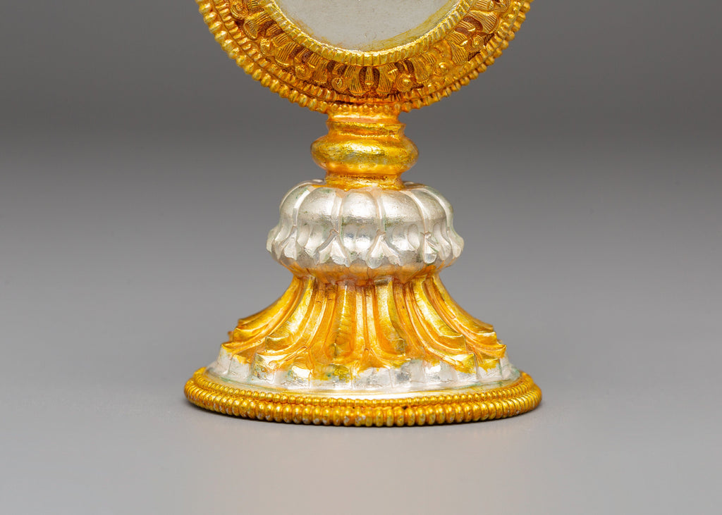 The intricate design of the Sacred Golden Mirror showcases traditional Tibetan craftsmanship. The gold-plated frame surrounds a reflective surface, while the silver plating enhances its spiritual significance. The base, beautifully crafted with detailed motifs, provides a foundation that symbolizes the balance between the material and spiritual realms. The copper body adds warmth and strength to the piece, further embodying the connection between physical and spiritual aspects of existence. The mirror is not only a practical object but a sacred tool for meditation and introspection.